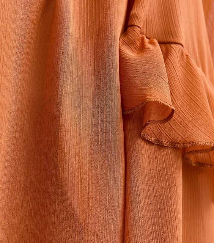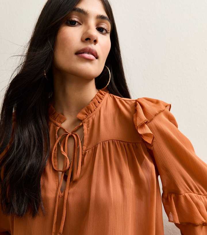 Rust Chiffon Frilly Trimmed Keyhole Neck Blouse