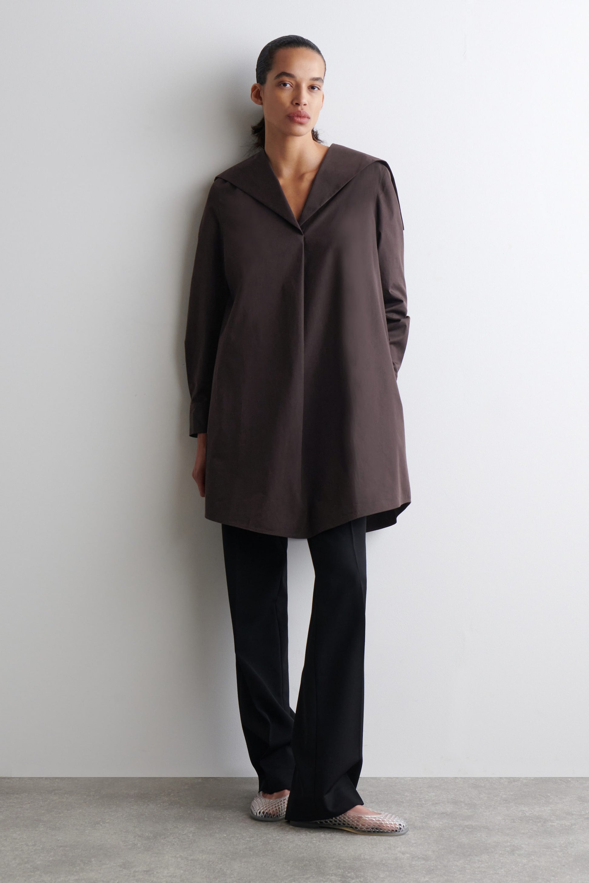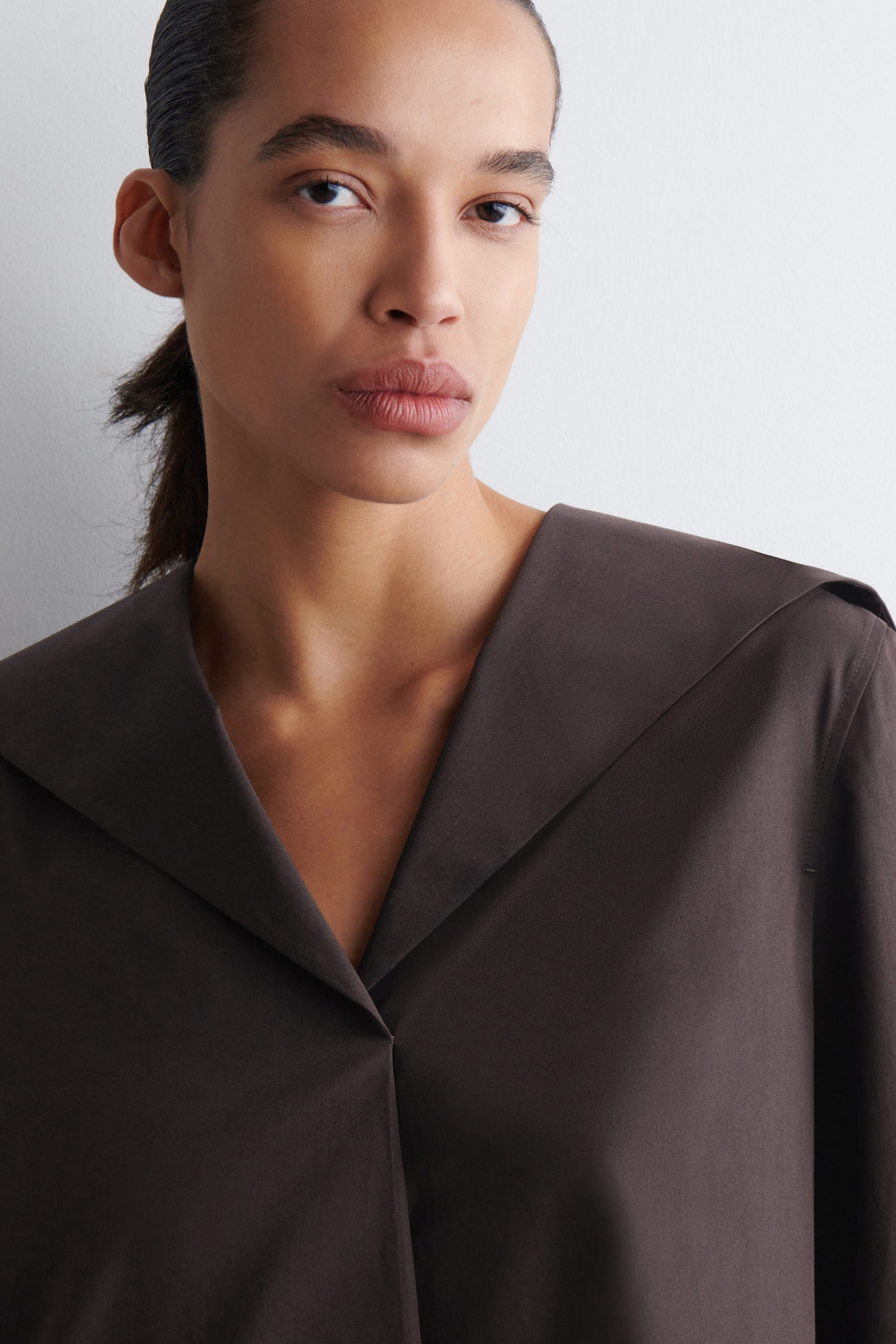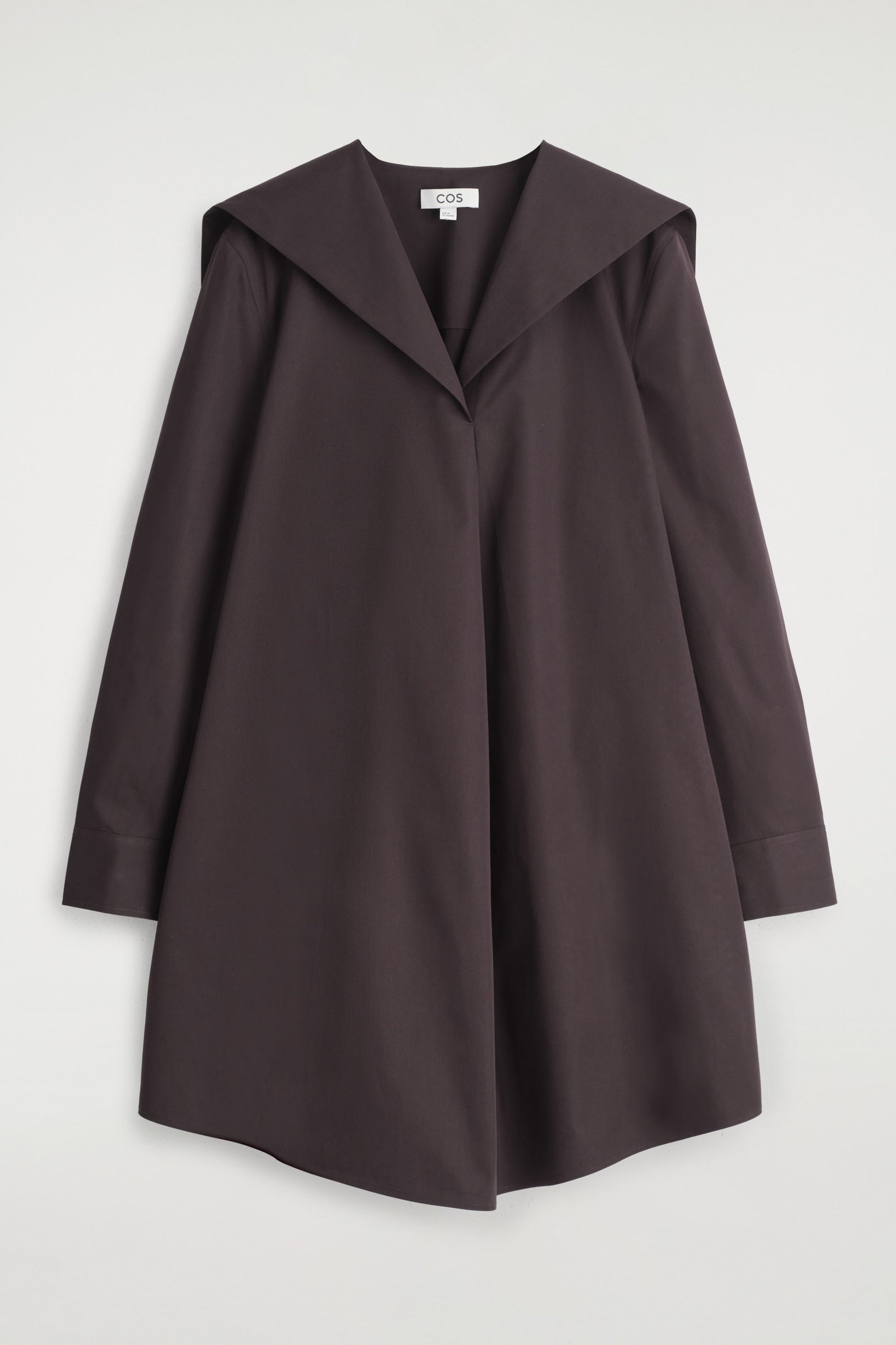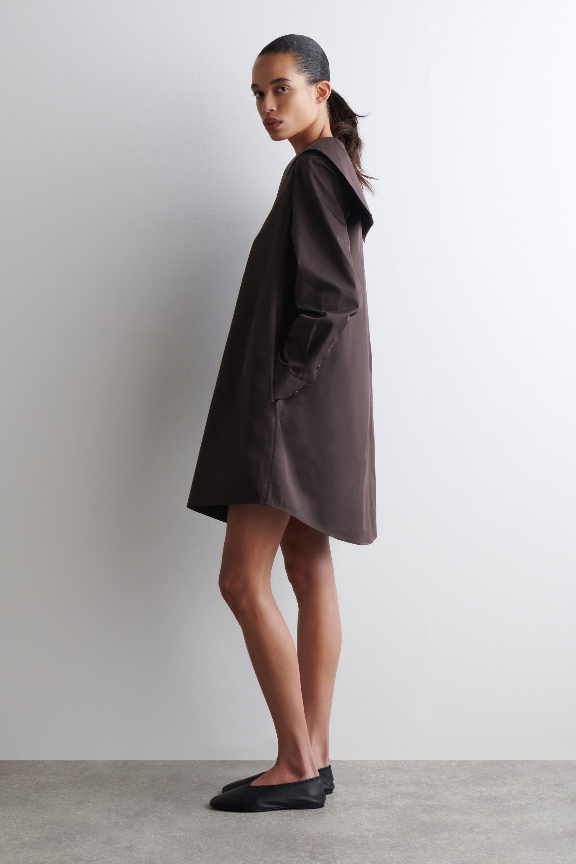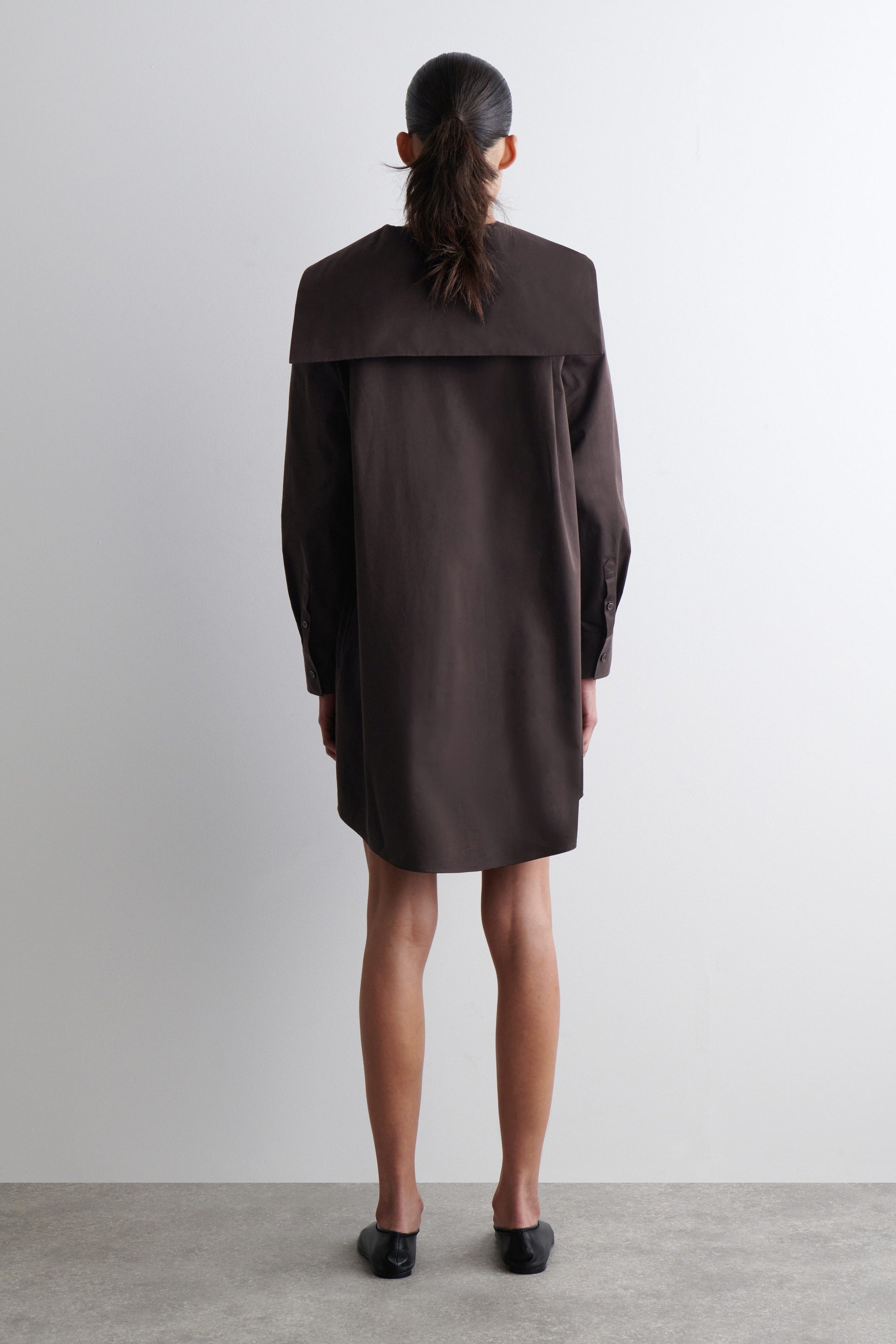 Modernising classic silhouettes of the '60s, this mini dress features a sailor collar that spreads across the shoulders. It's made from premium Pima cotton in a rich espresso hue and designed with buttoned cuffs, discreet side pockets and a curved hem. Style it with leather flip flops or ballet flats.
