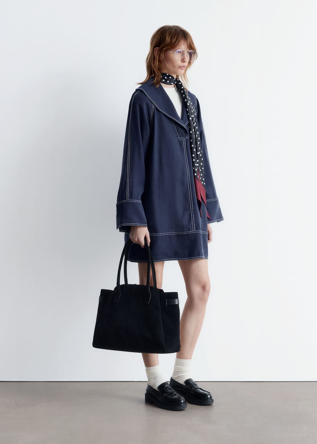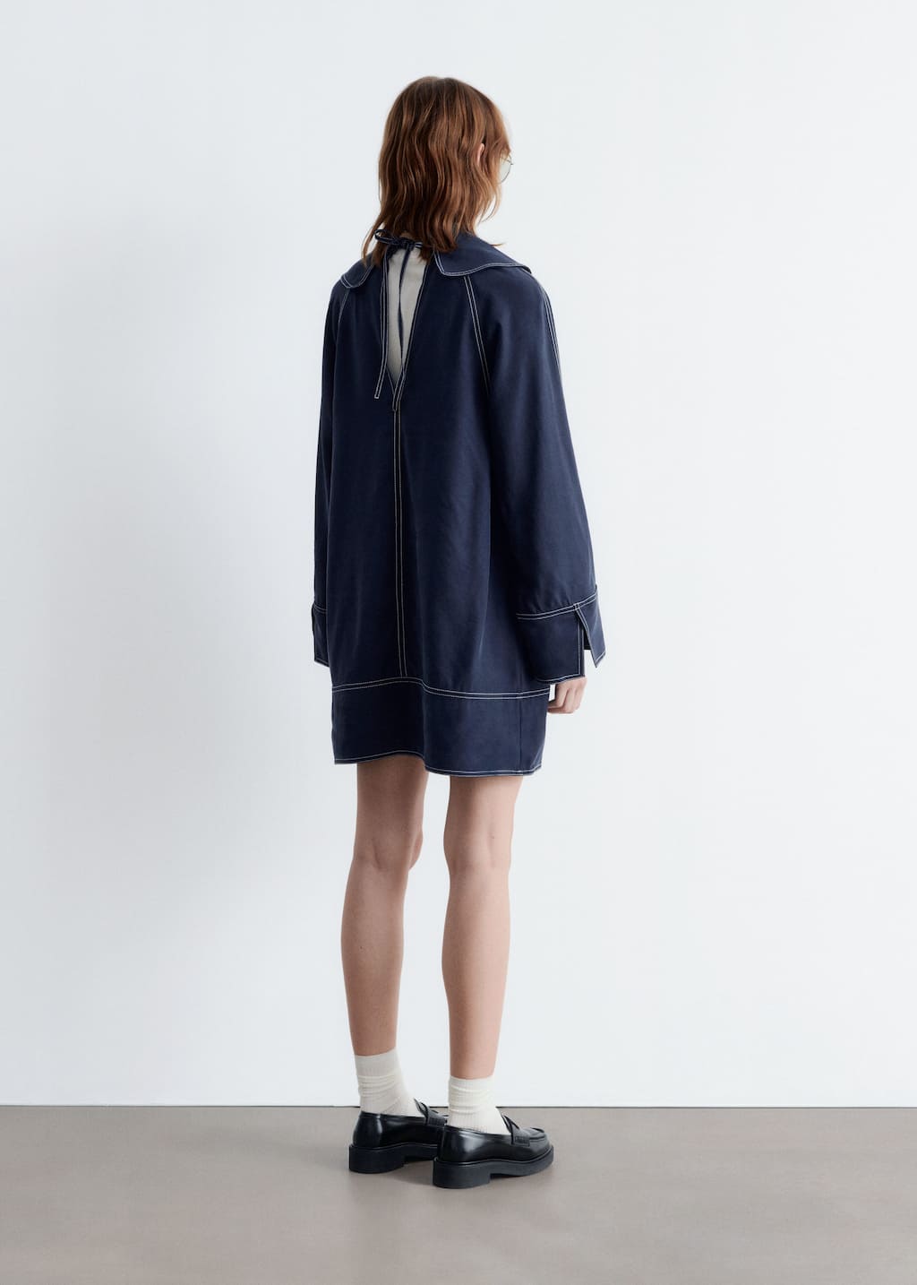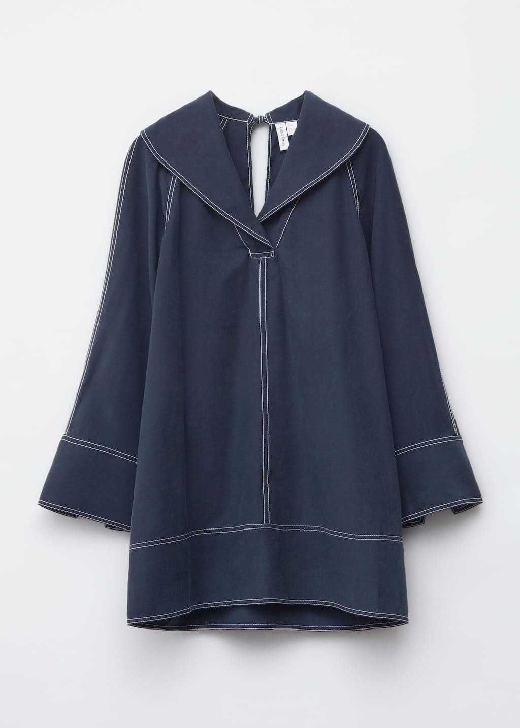 This mini dress is crafted from a mid-weight fabric with a soft, matte finish. Its cut in an A-line silhouette and features an oversized sailor collar, long wide sleeves with open vents, and contrast topstitched seams. Finished with a v-shaped keyhole opening with tie closures at the neck.