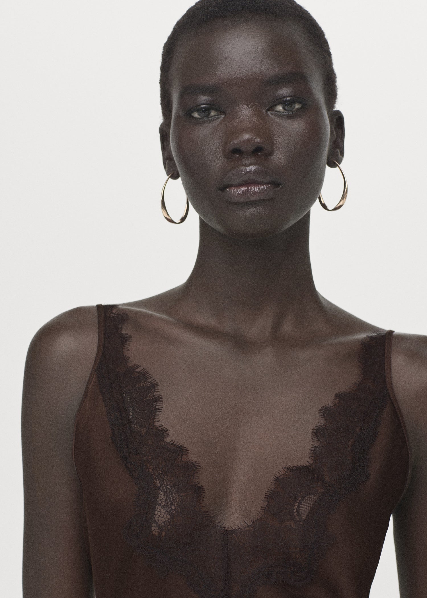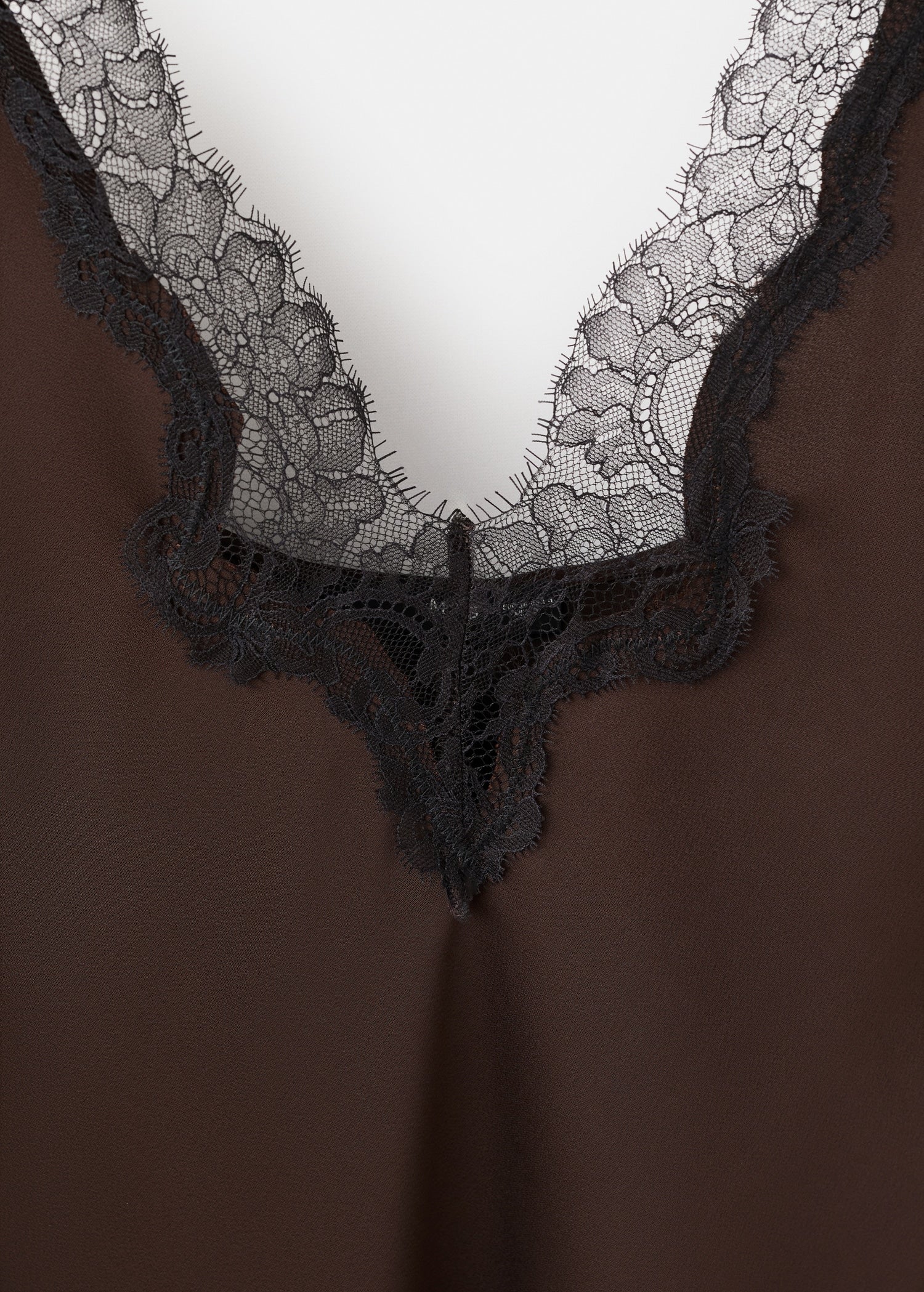 Satin fabric. Lingerie style. Midi design. Fitted design. V-neckline. Lace panel. Sleeveless. Wide adjustable straps. Lace hem. No Fastening.