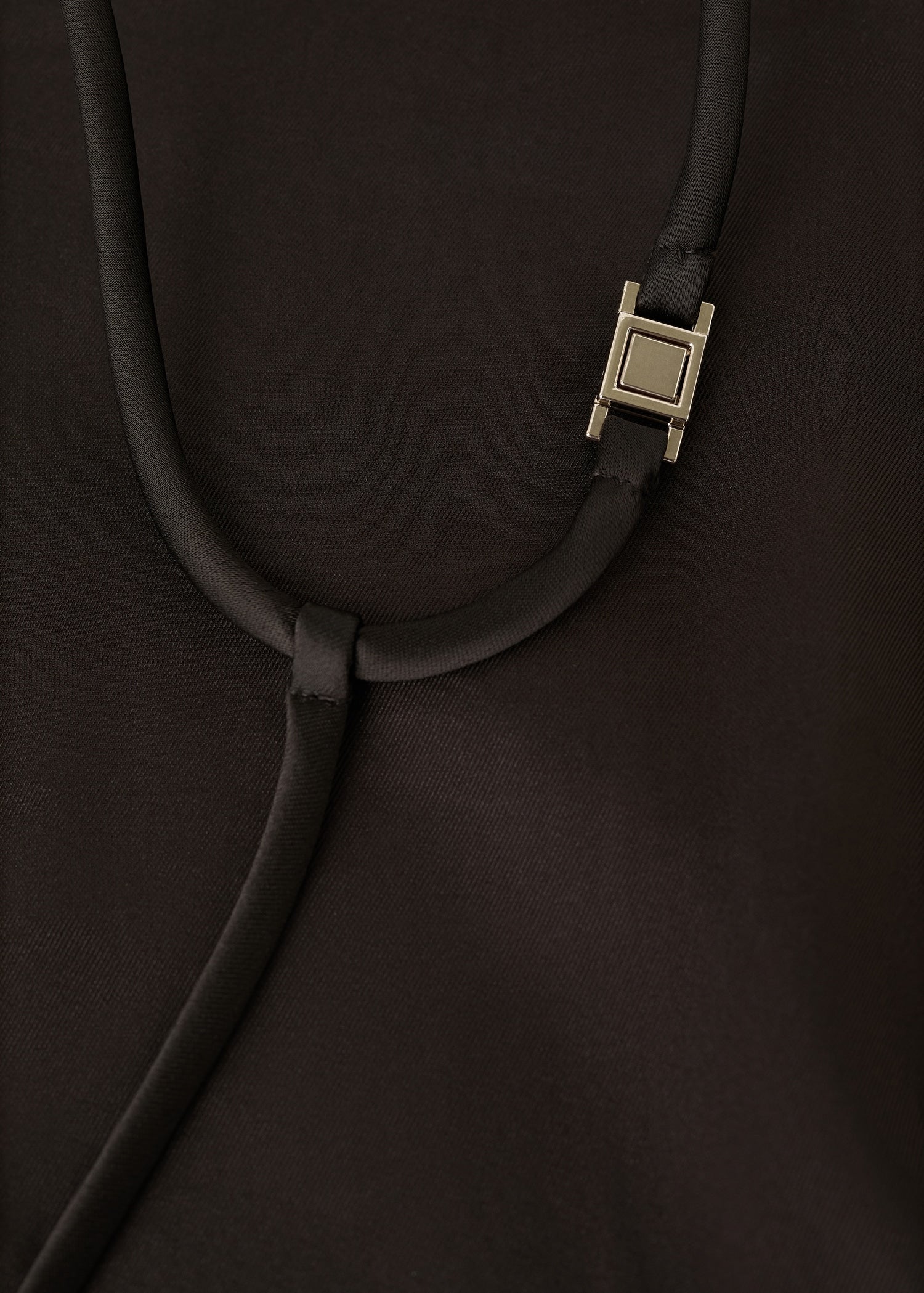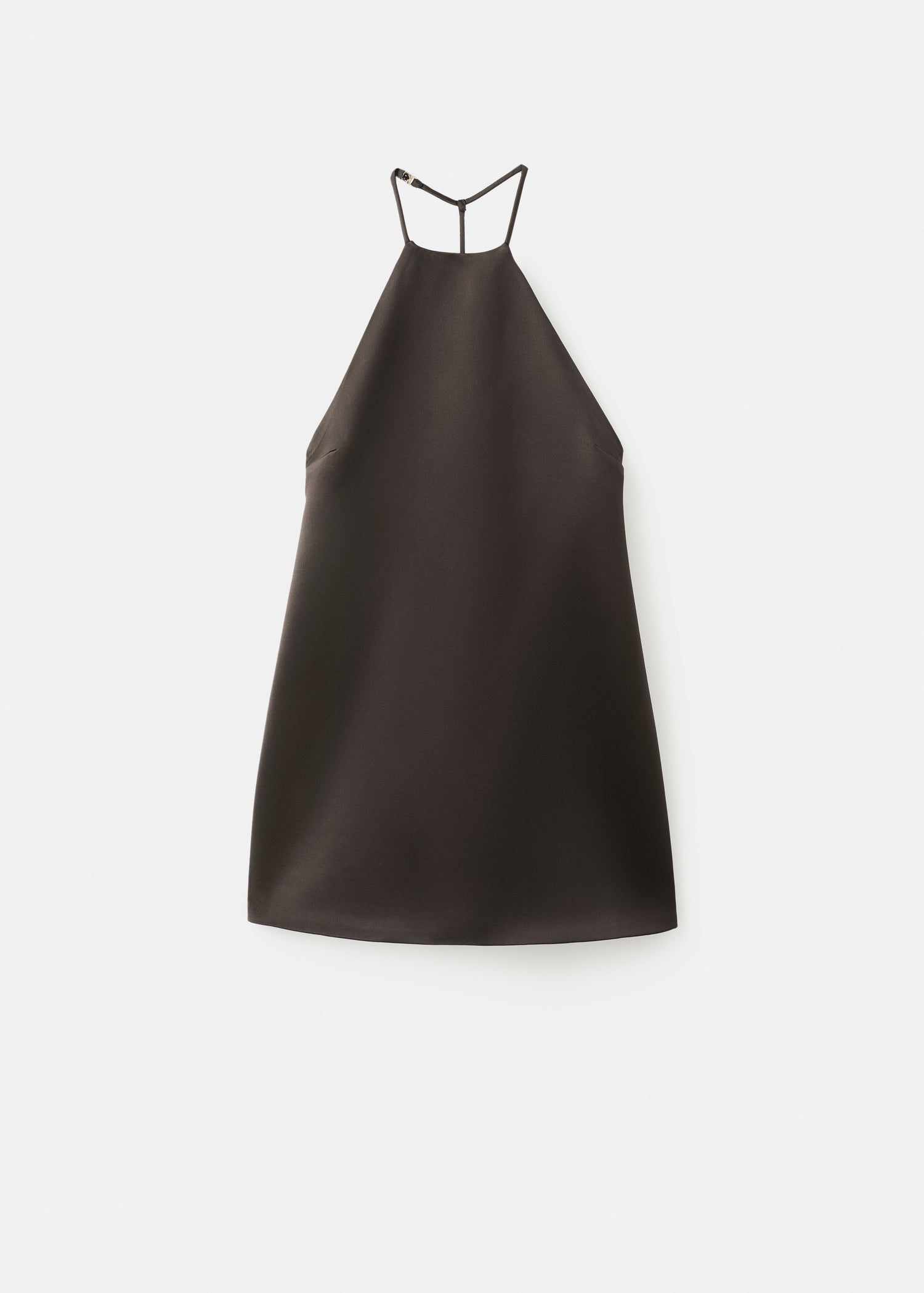 This dress is a testament to modern sophistication, featuring a satin-finish fabric that provides a subtle and distinguished sheen. Its straight and simple design flatters the silhouette with a fluid drape, perfect for special occasions. The piece is transformed with its detachable faux-fur collar, adding a glamorous and cosy touch, allowing you to personalise the look according to the occasion. Satin-finish fabric. Short Design. A-line design. Halter neck. Thin adjustable straps. Open back. Detachable fur-effect collar. Clip buckle fastening. Inner lining. This garment is part of our party and event collection, designed to elevate your looks for special occasions. Items from the CAPSULE collection can be exchanged or returned within 14 days from the date of shipment.