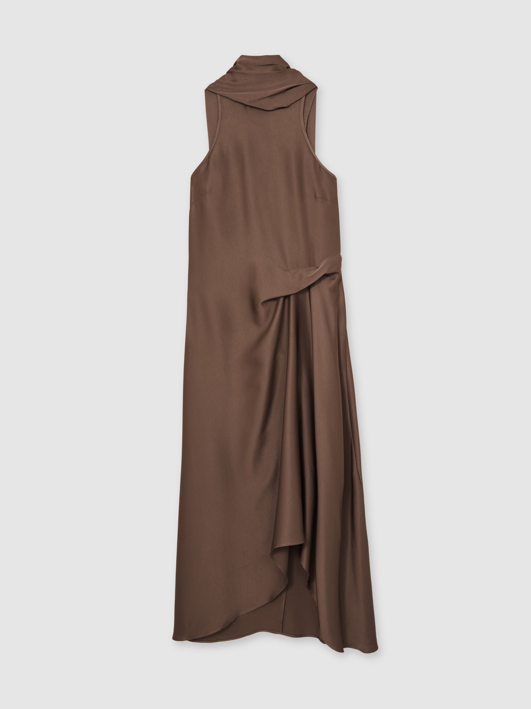 Satin Tuck-Detail Cape Midi Dress in Taupe Brown