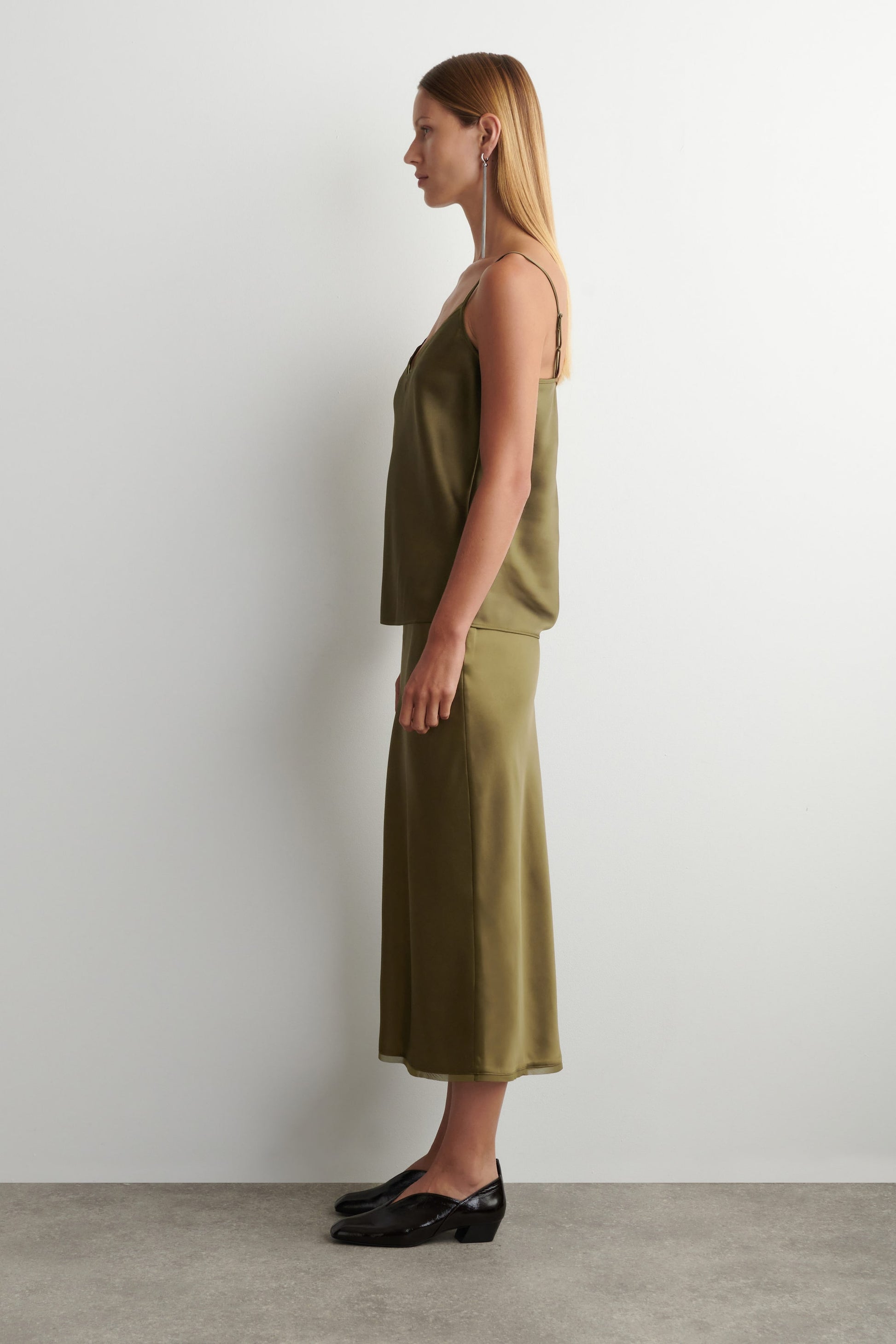 Crafted from luxuriously soft satin, this refined cami top is striking in its simplicity. It's designed with a laser-cut V-neckline, slim shoulder straps and delicate bias-cut chiffon trims. Style it with the matching skirt for a tonal look.