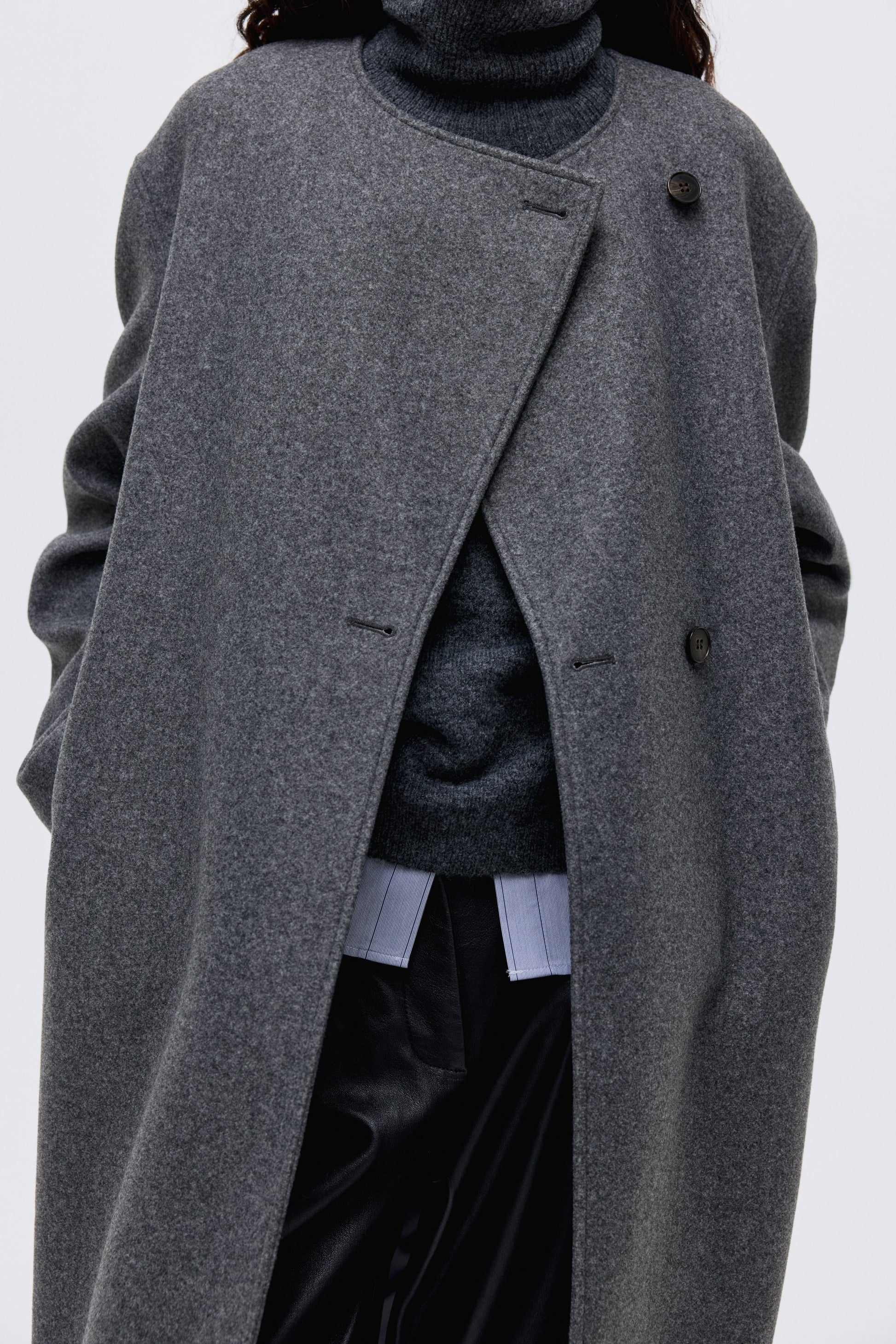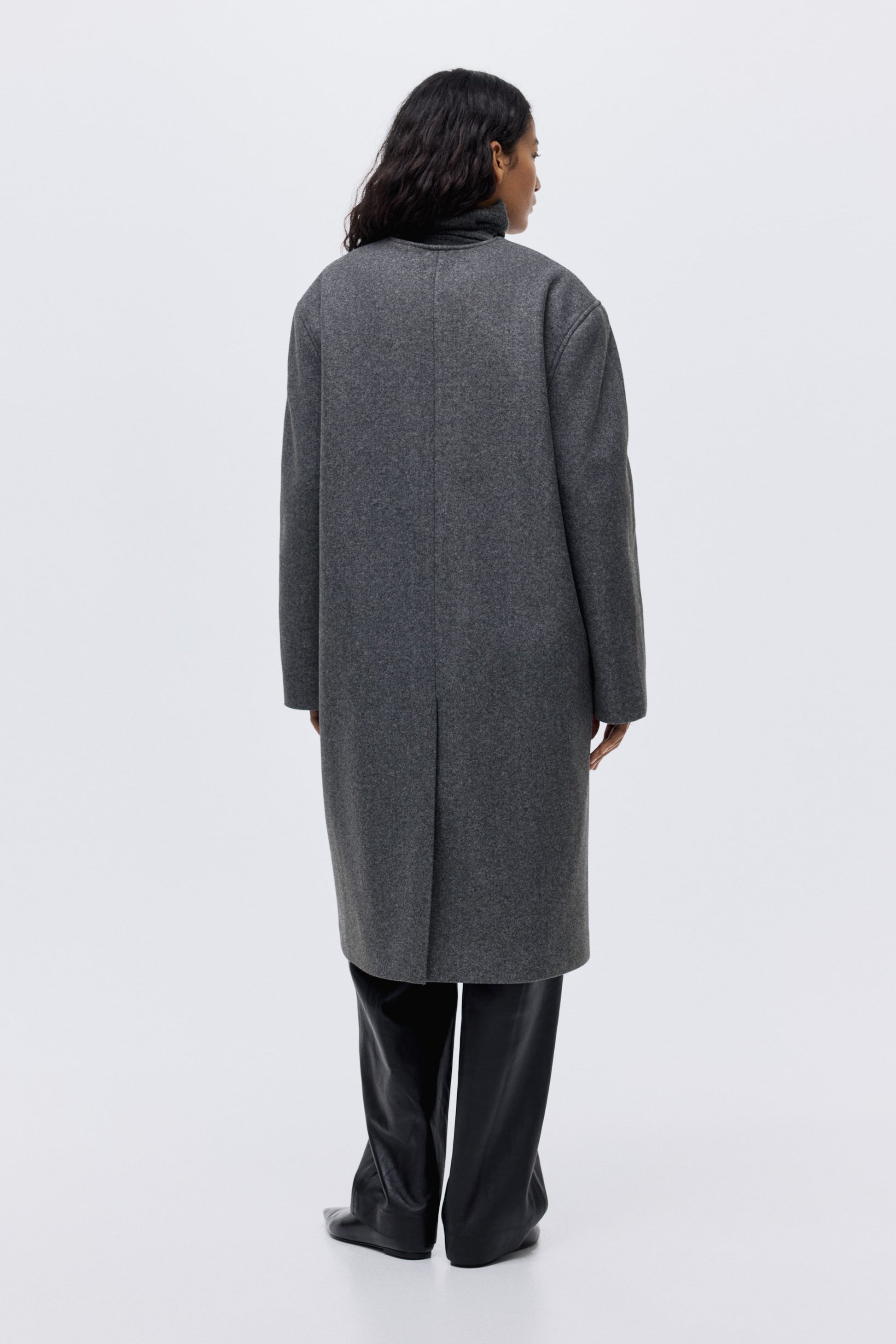 Knee-length coat in woven fabric with a brushed surface. Features a large, detachable scarf, round neckline and a double-breasted front with concealed and visible buttons. Dropped shoulders, long sleeves and discreet pockets in the side seams. Single back vent. Lined.