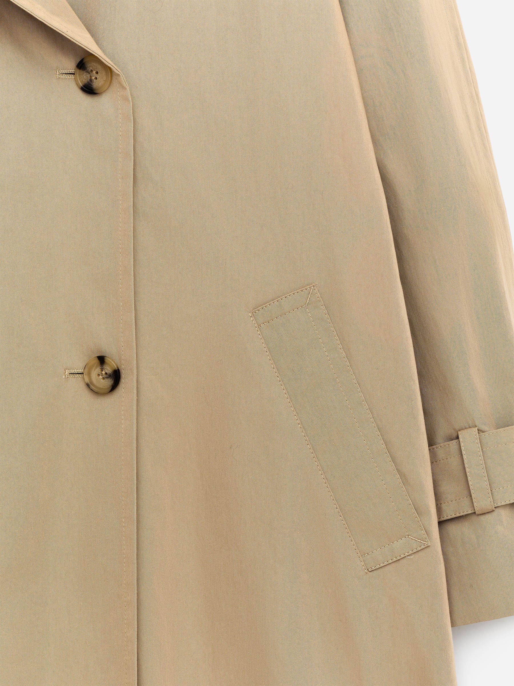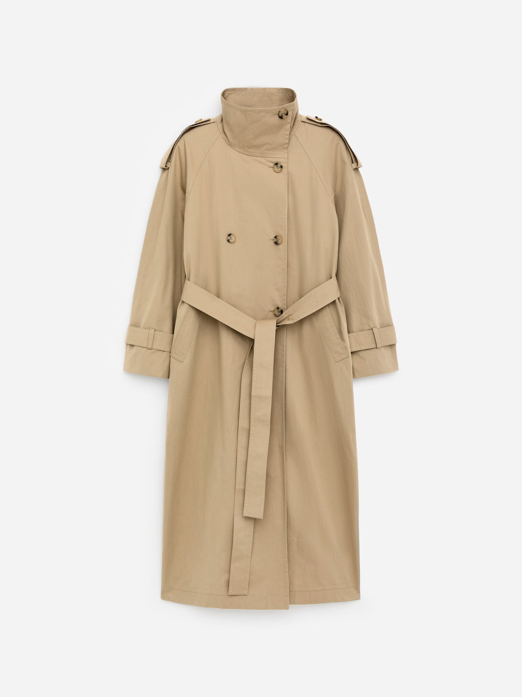 This half-lined trench coat features a detachable scarf detail and classic trench coat elements such as shoulder tabs, sleeve tabs, and a belted waist. Raglan sleeves and a stand collar add a contemporary touch.