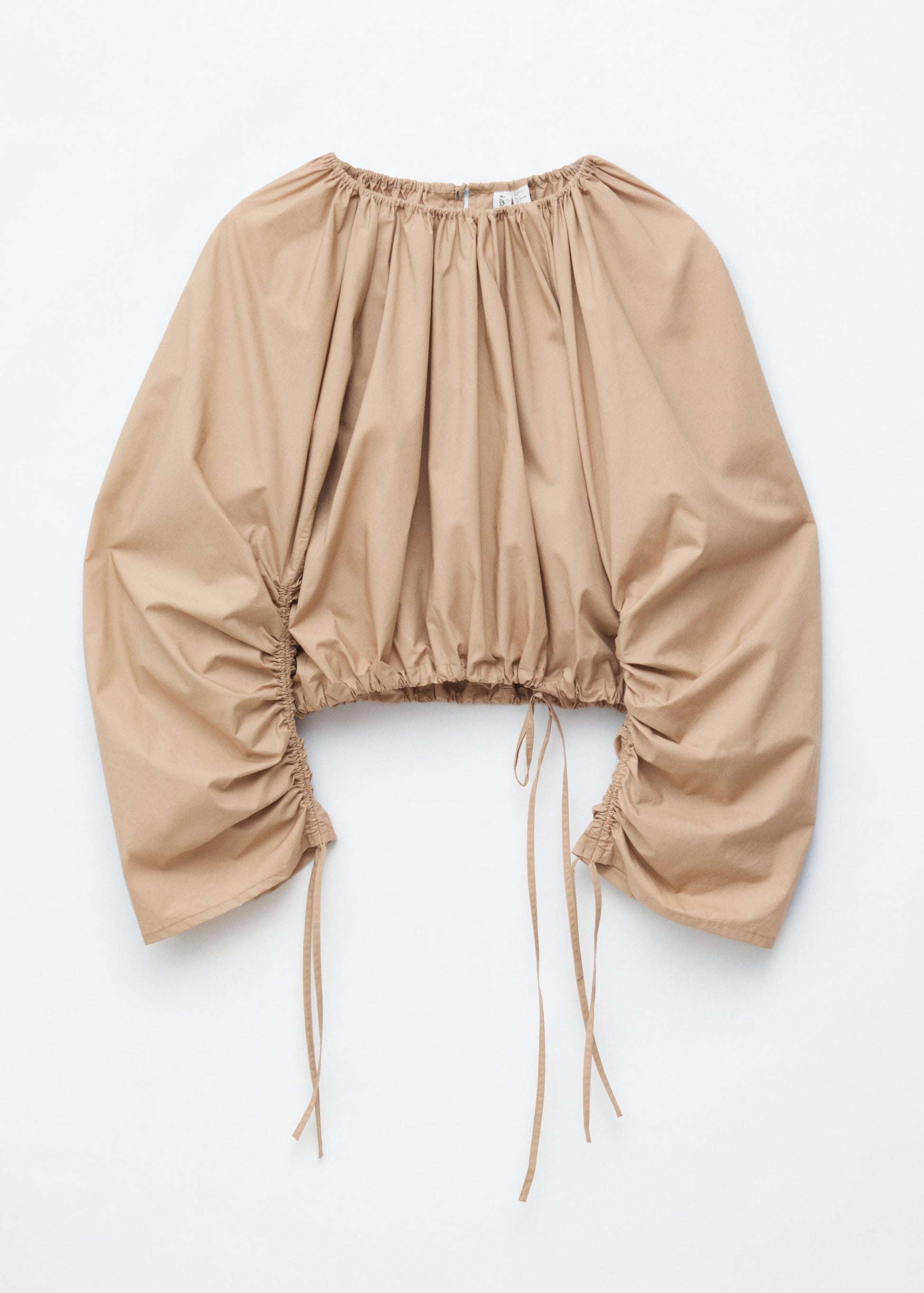 Balancing softness with structure, this sculptural blouse is crafted from crisp cotton with scrunched gathers that create voluminous texture. Drawstring shell ties at the neck, hem, and sleeves allow for adjustable styling.