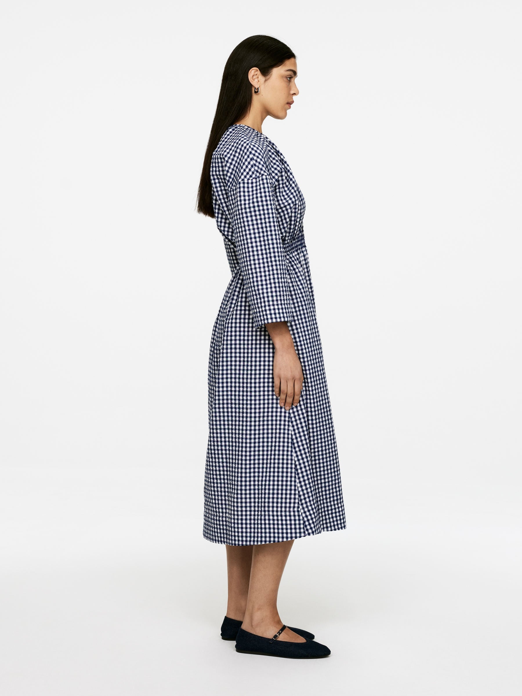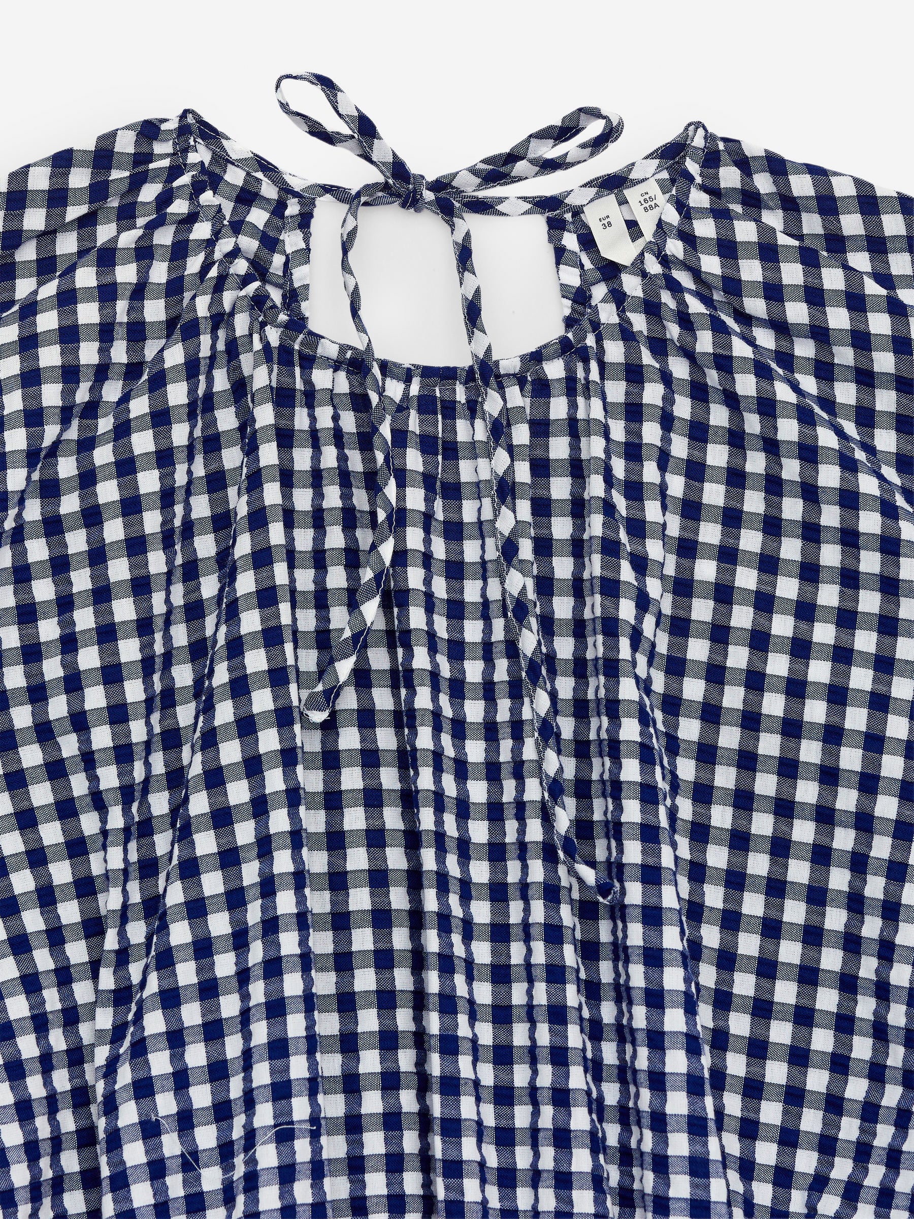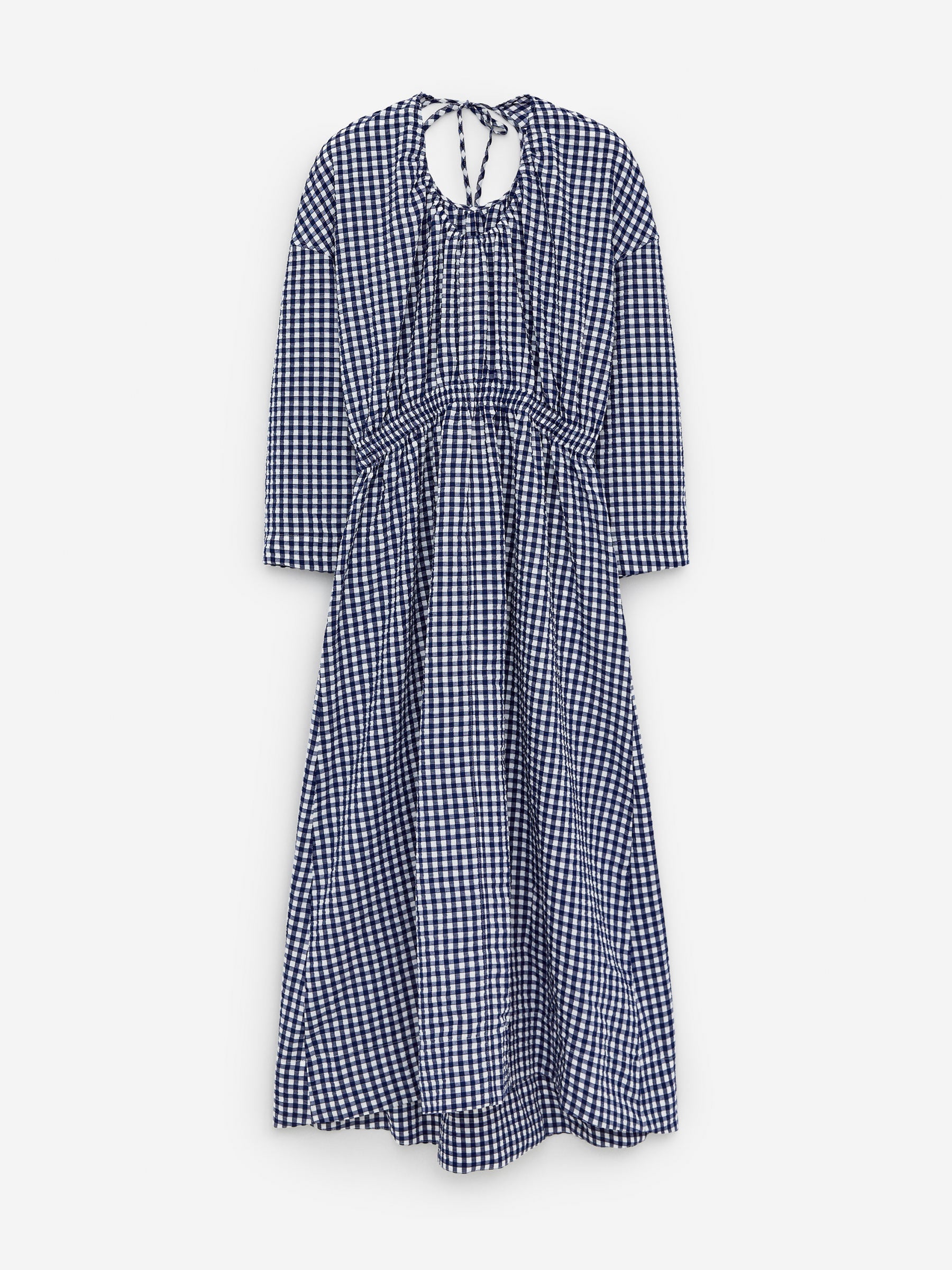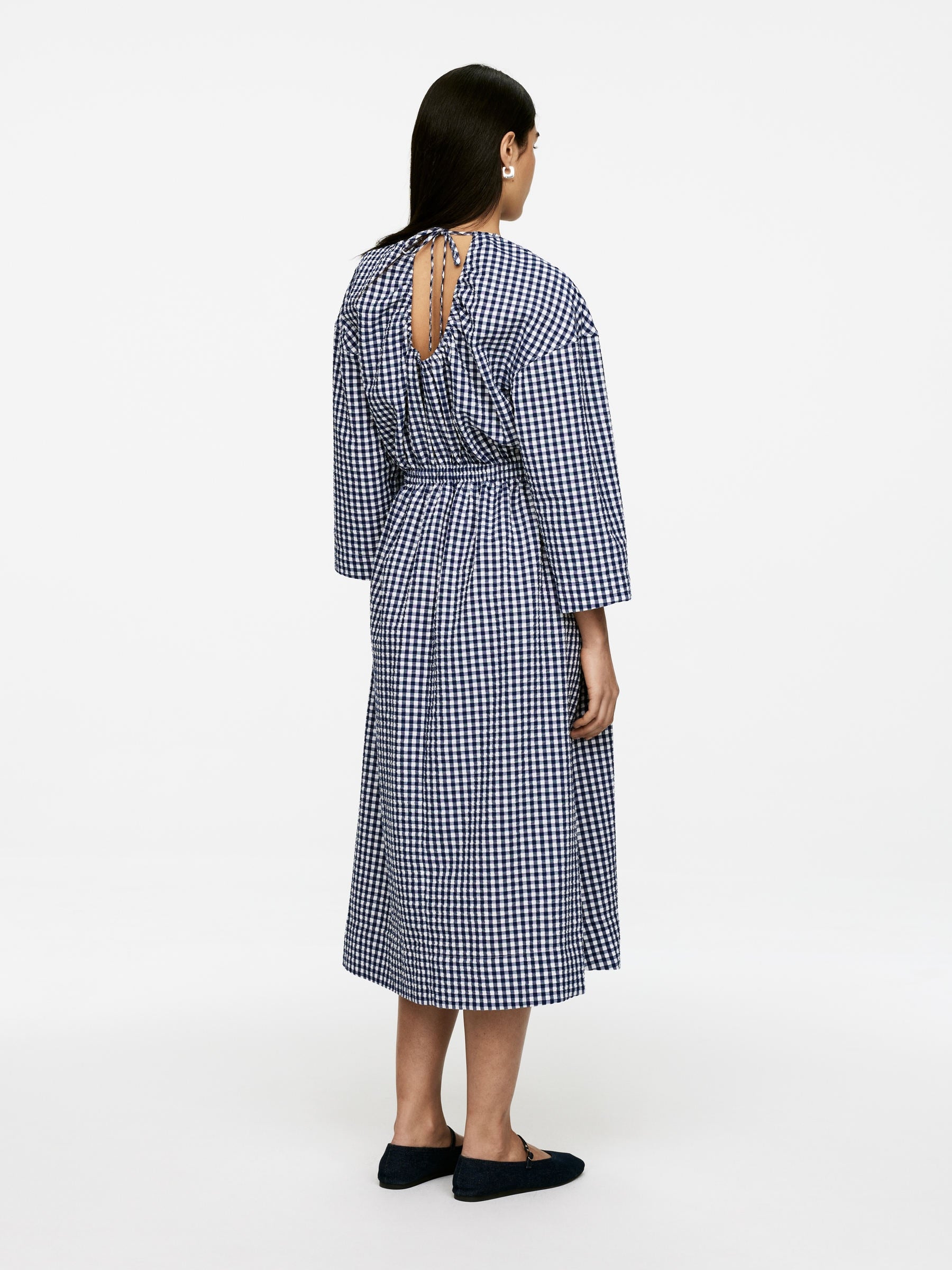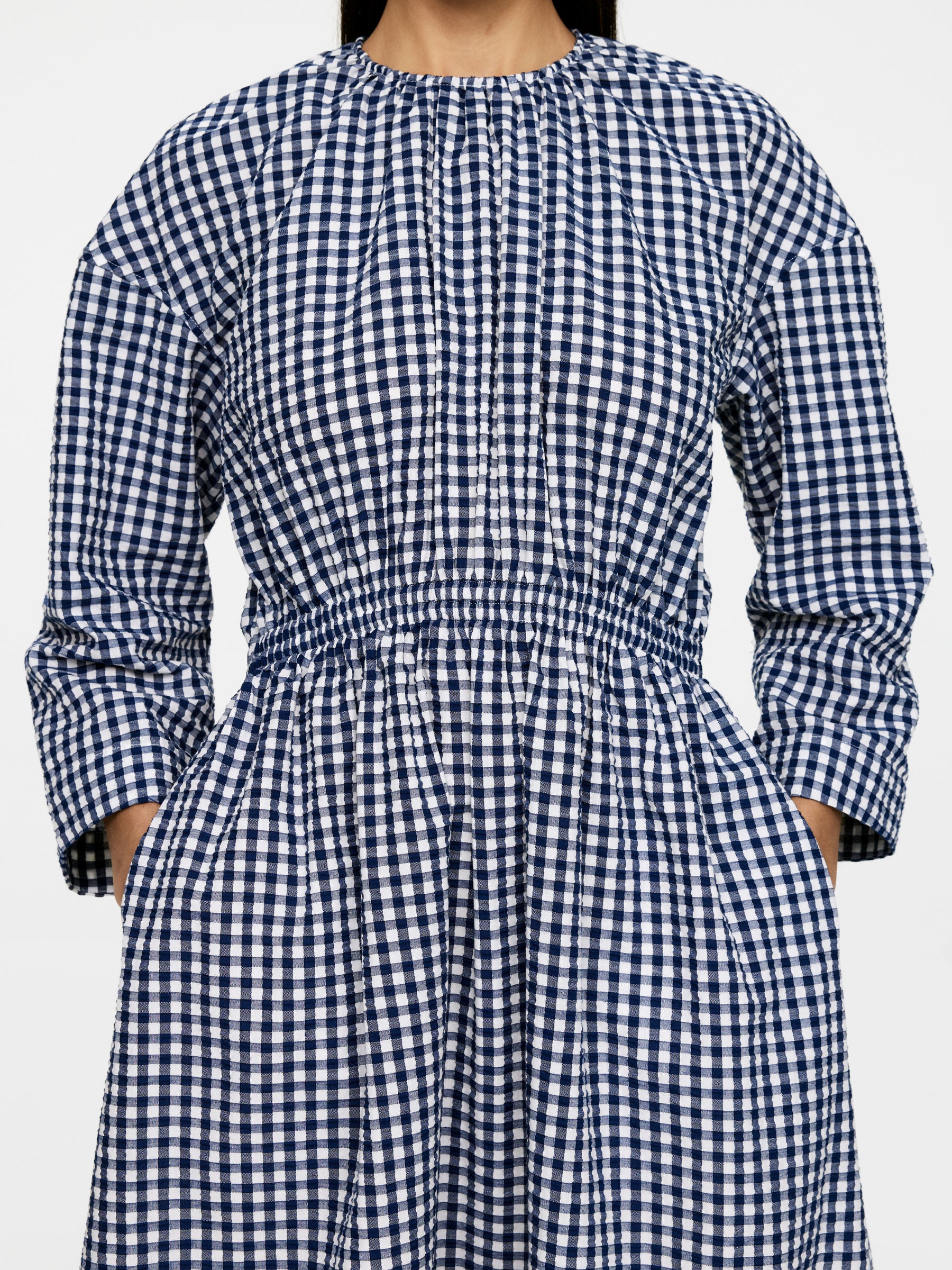Cotton dress crafted from an airy seersucker fabric. Smock detailing at waist, tie-band at neck and side pockets.
