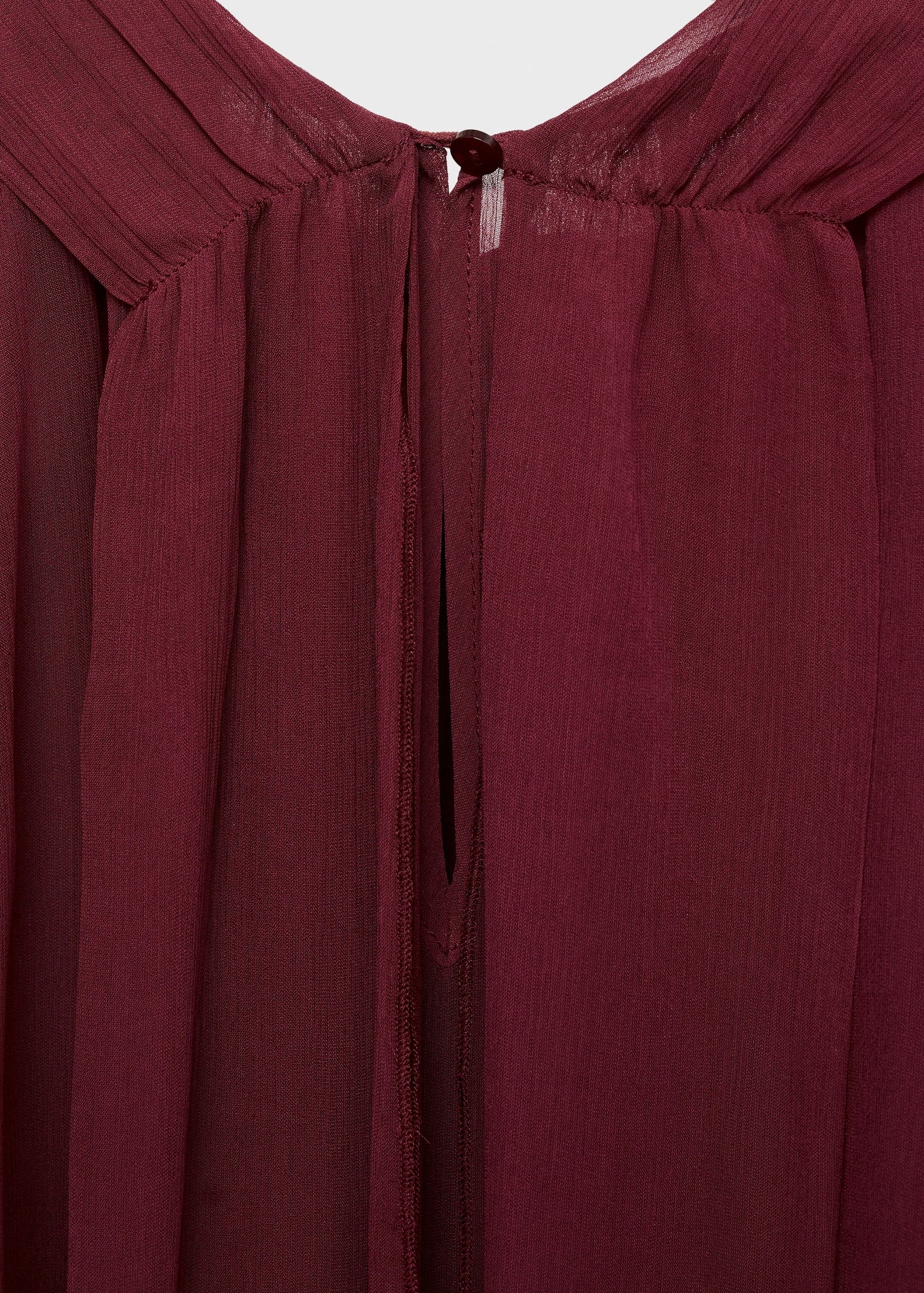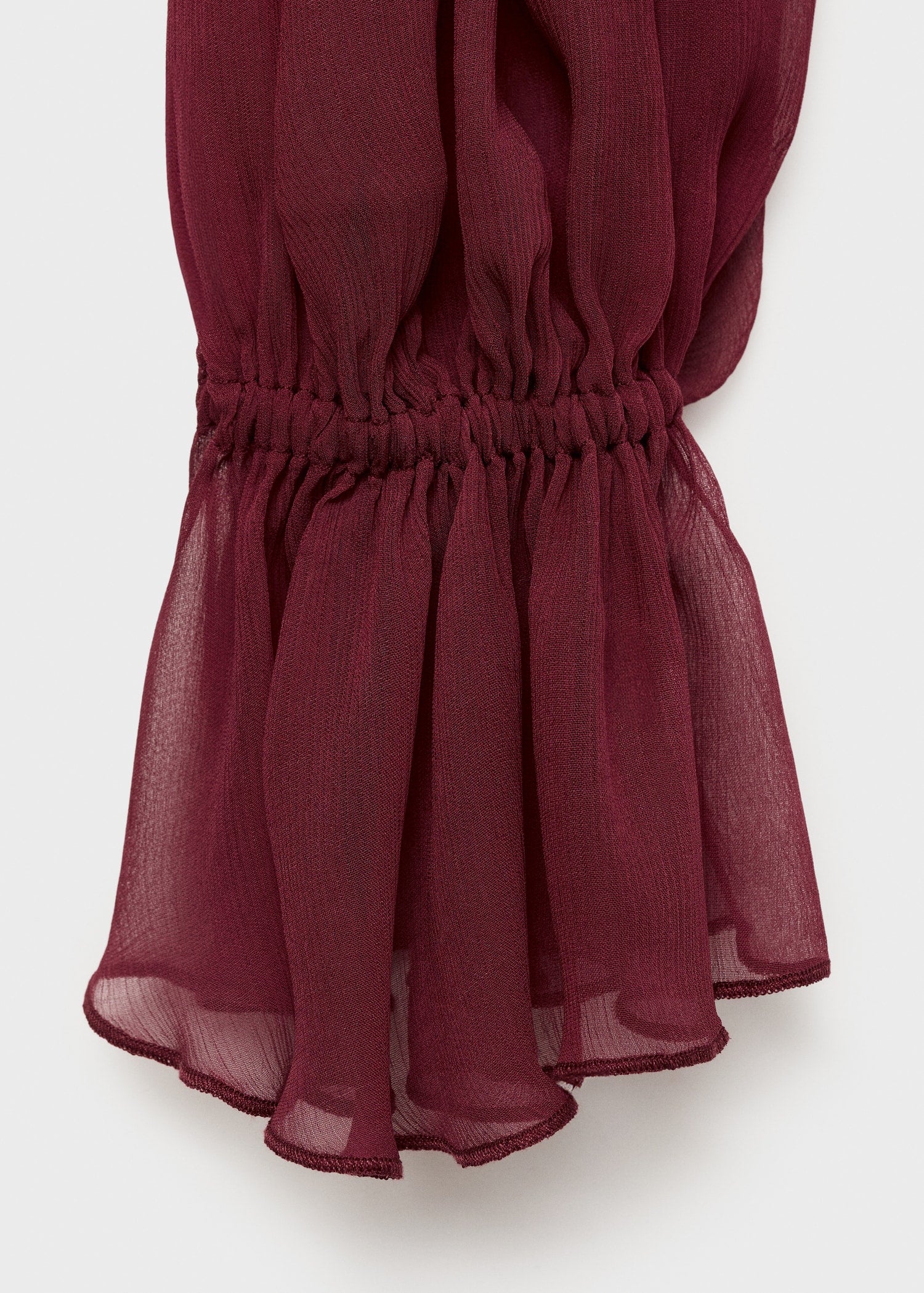 Crafted from semi-transparent fabric, this garment features an oversized design with a draped neckline adorned with a foulard. The long sleeves have elasticated cuffs, and the button fastening is located at the back.