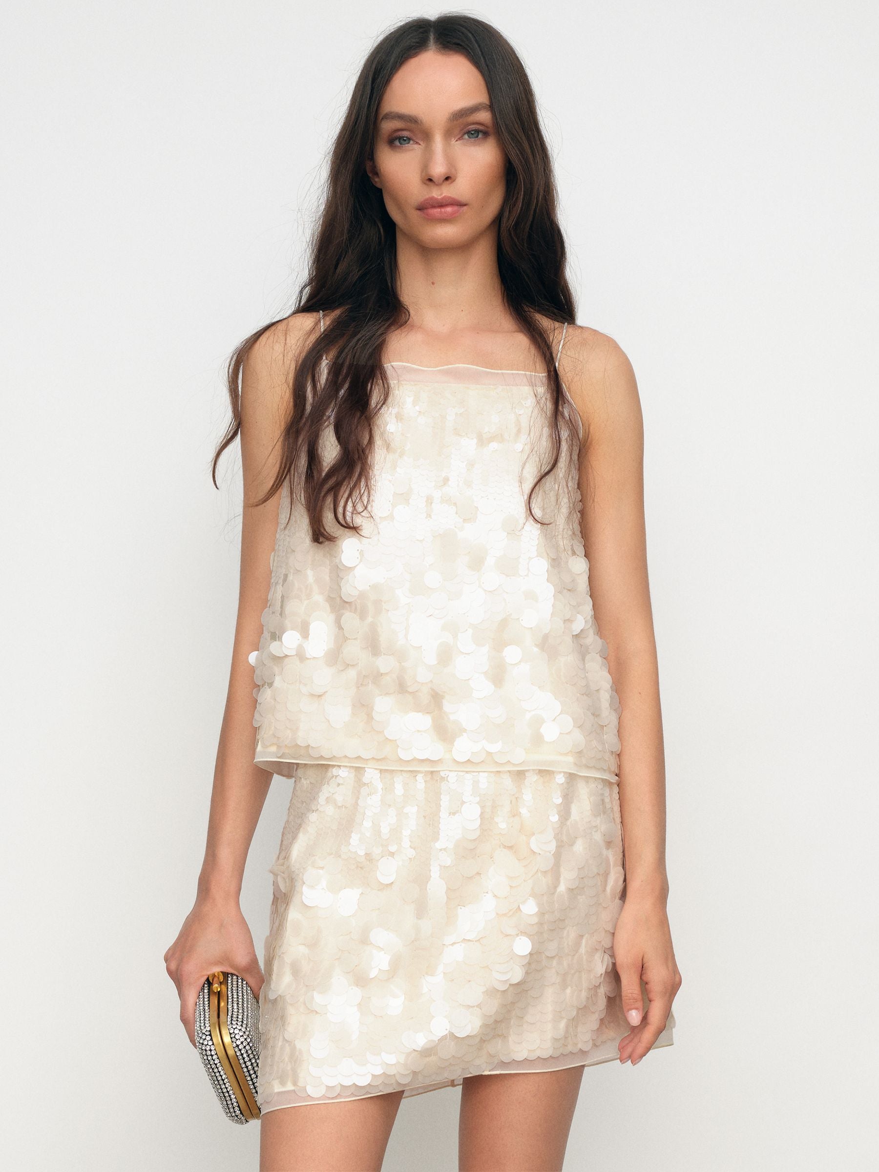 Shimmering sequins in varying sizes lend a party-ready mood to the Salia skirt. Cut to a mini length, it’s subtly elevated by an organza trim and a smooth satin lining.