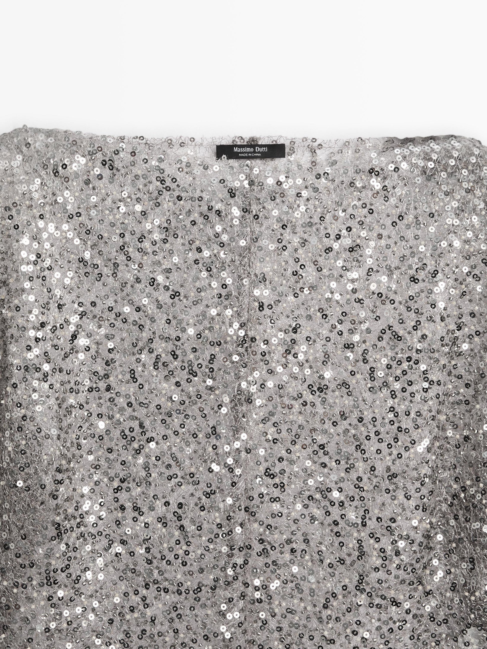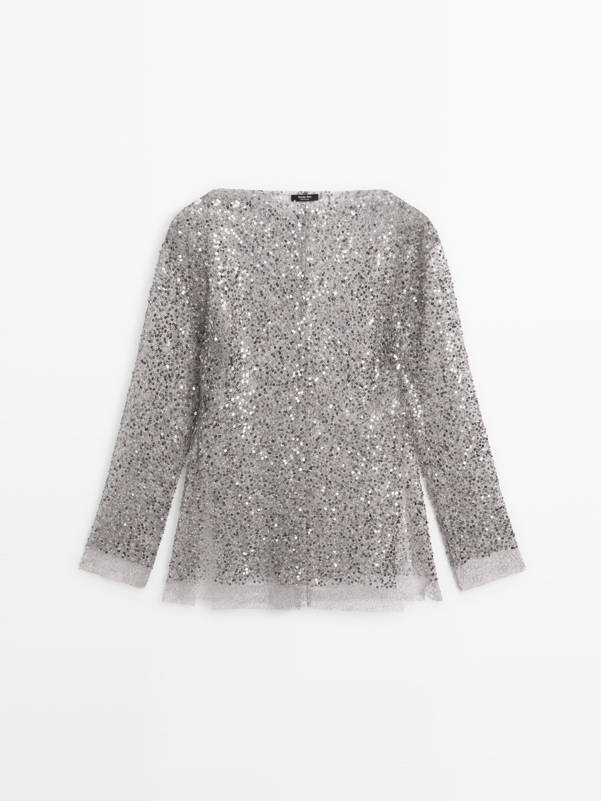 Blouse made from semi-transparent fabric with sequins. Slightly fitted silhouette, providing a more defined and slim appearance. Draped collar. Long sleeves. Rhinestone detail . Two openings on the front.