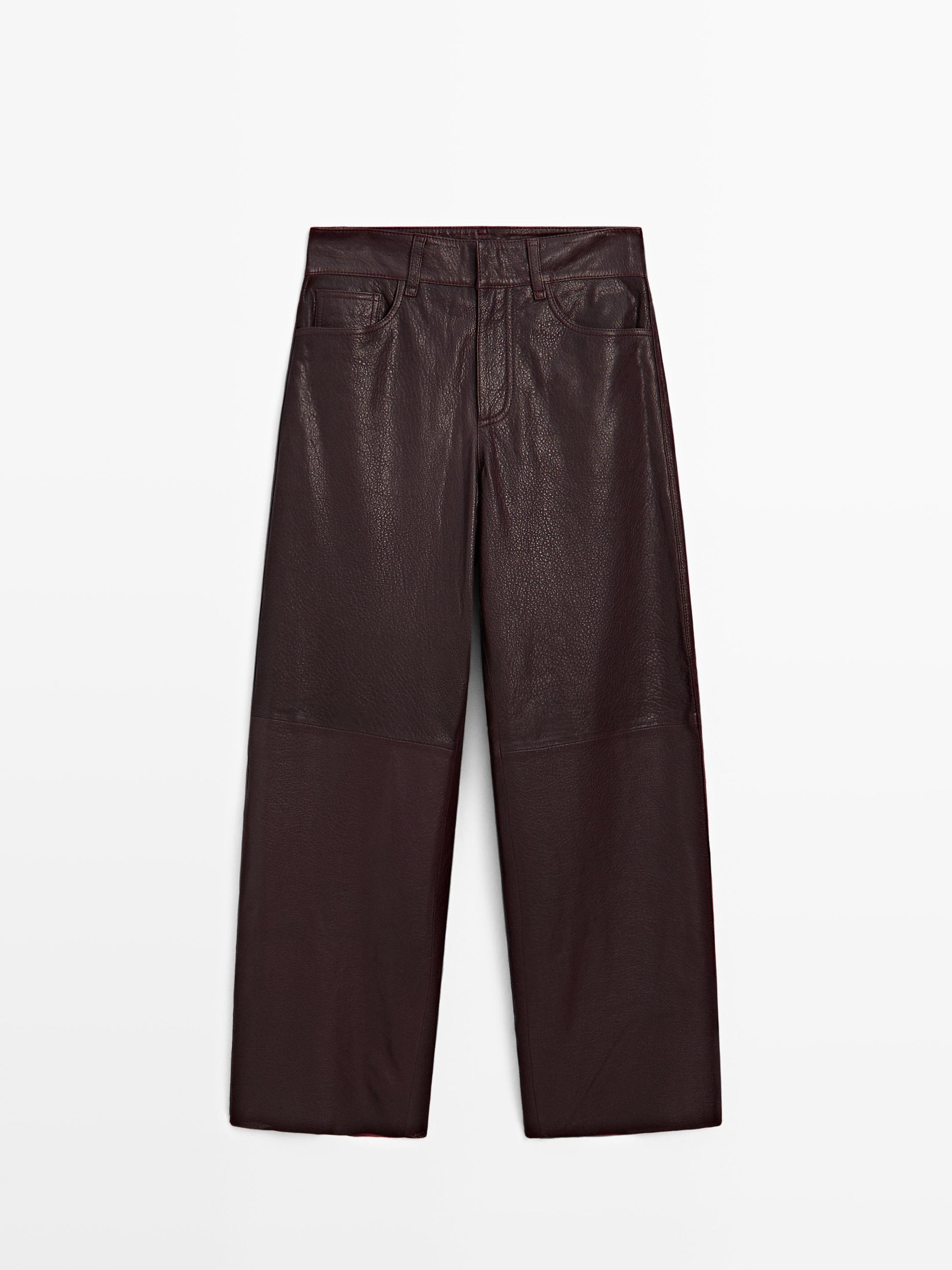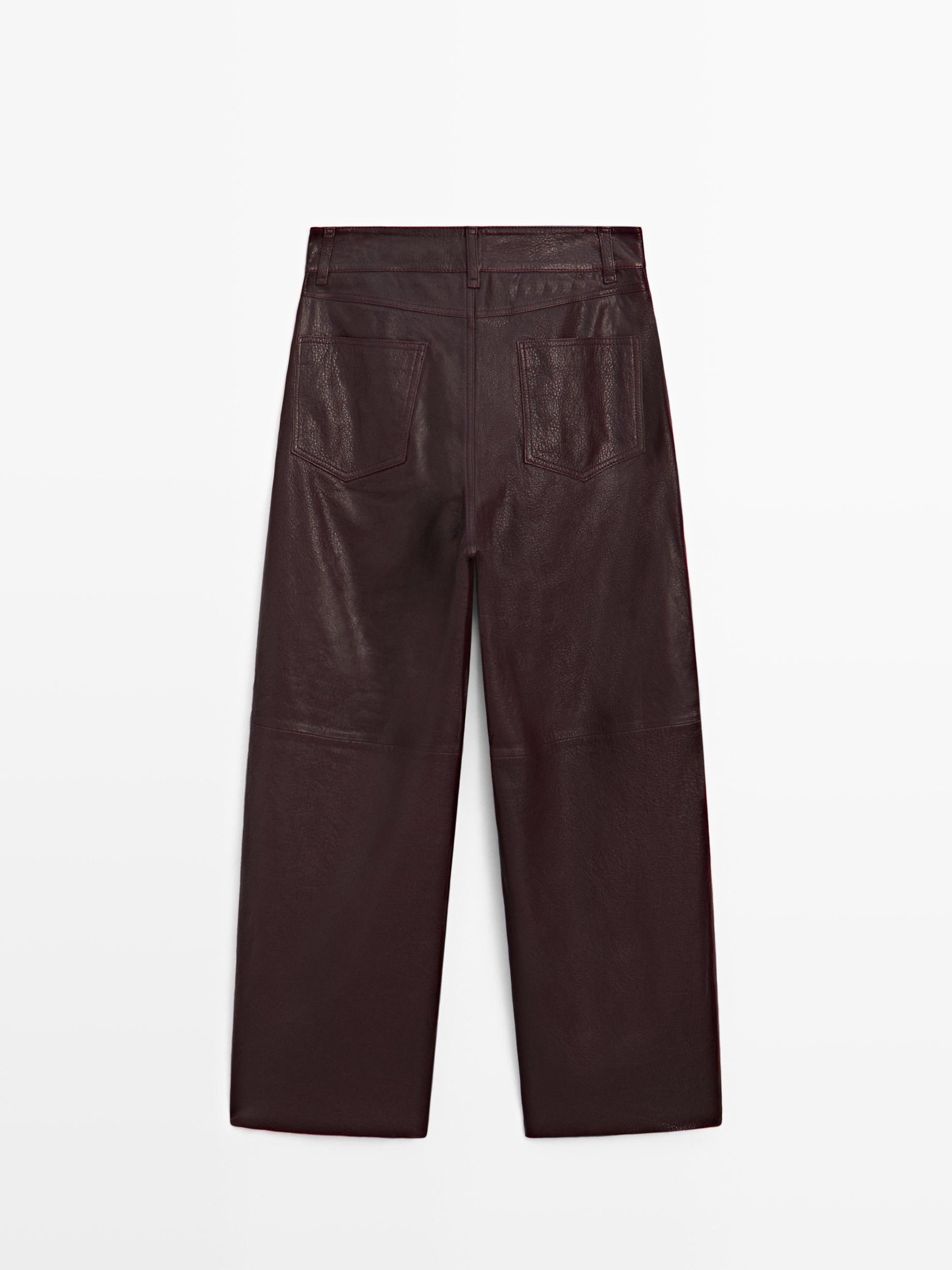 Trousers made of sheepskin with a nappa finish. Zip fastening concealed by a placket, with hook-and-eye clasp and button. Five-pocket design. Seam details .