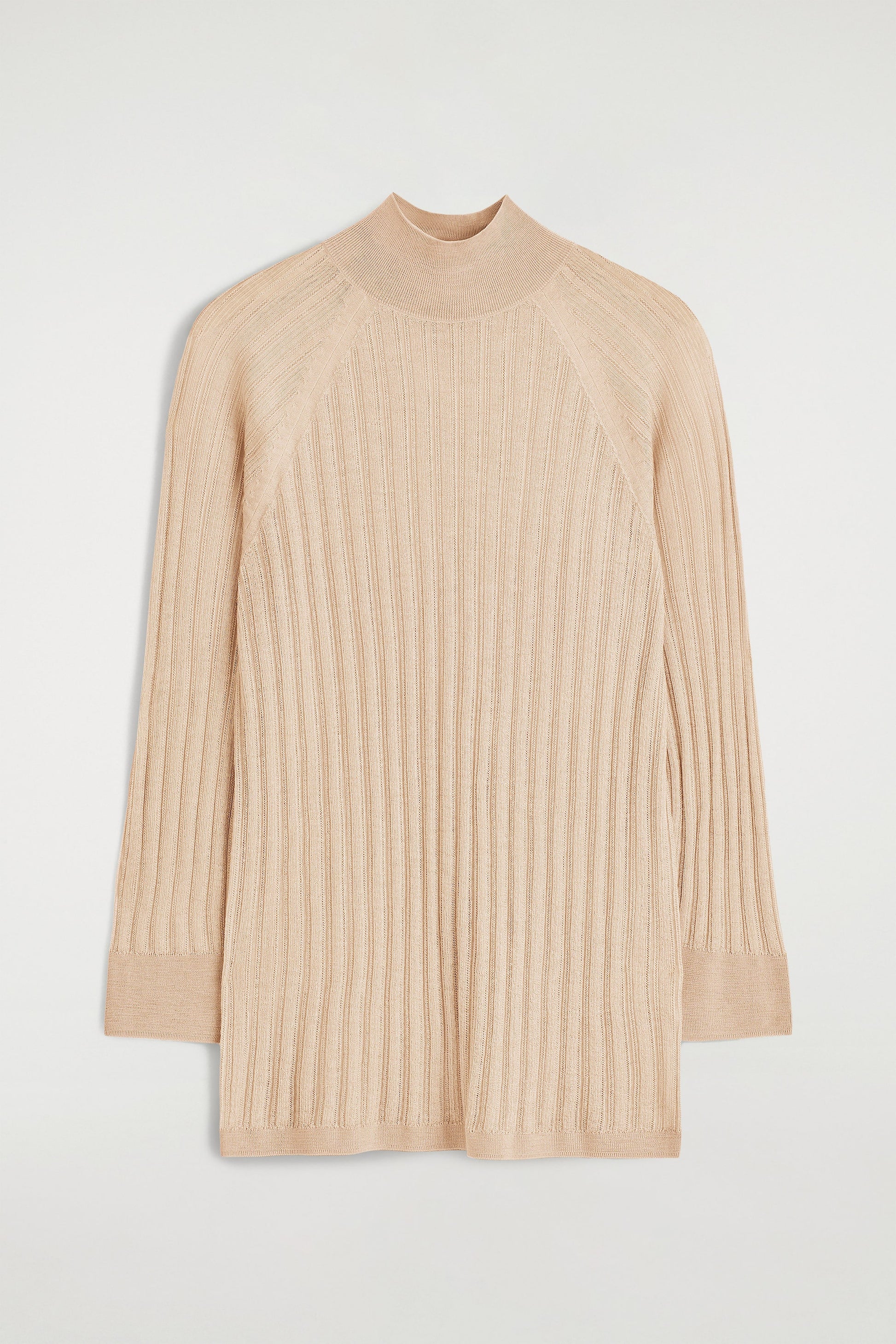 Classic knitwear codes are redefined for Pre-Fall 2025. Rendered in a subdued oatmeal tone, this piece is finely rib-knitted from premium mulberry silk and merino wool with a semi-sheer finish and is cut in a slim silhouette with slightly cropped sleeves.