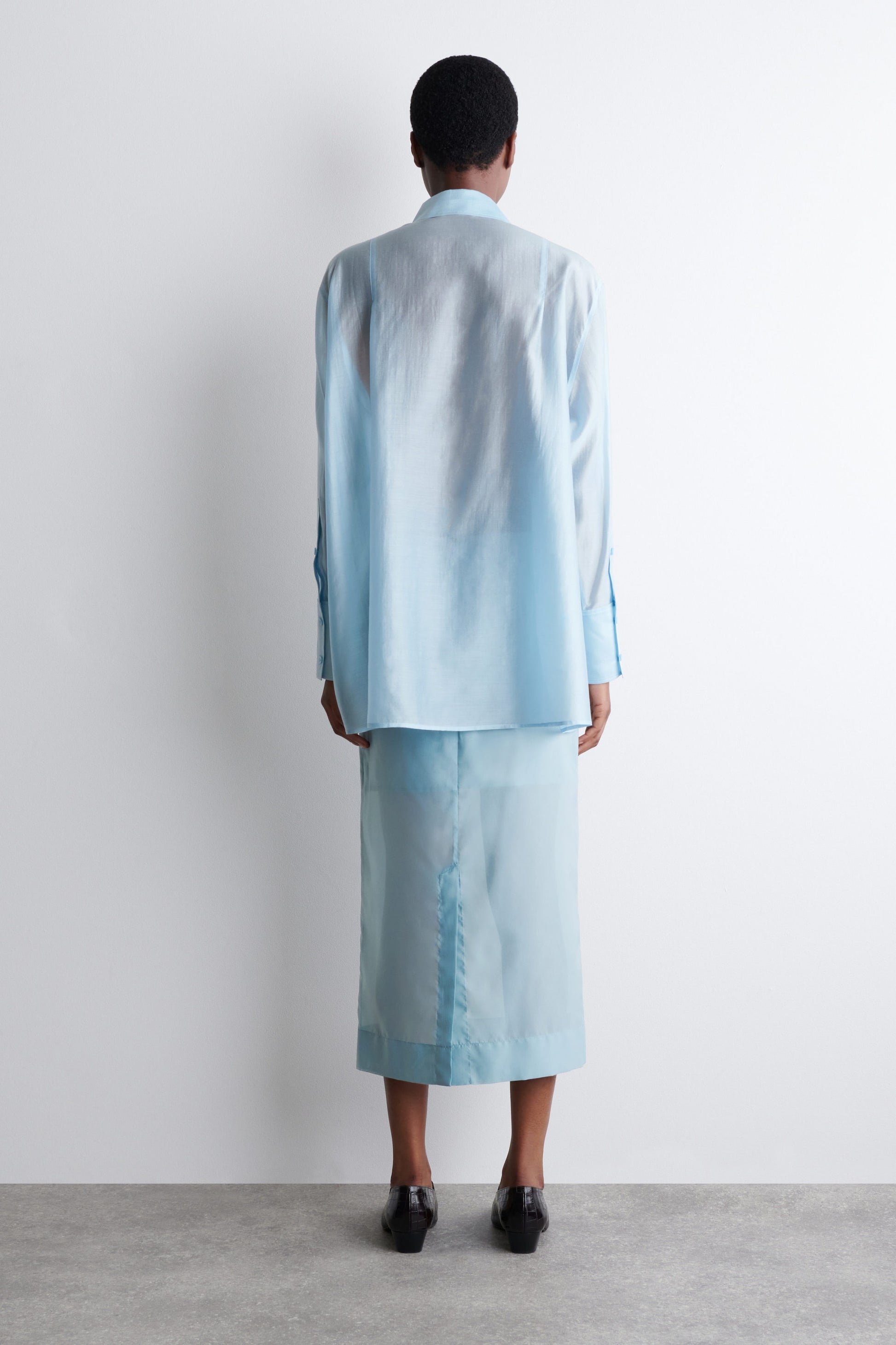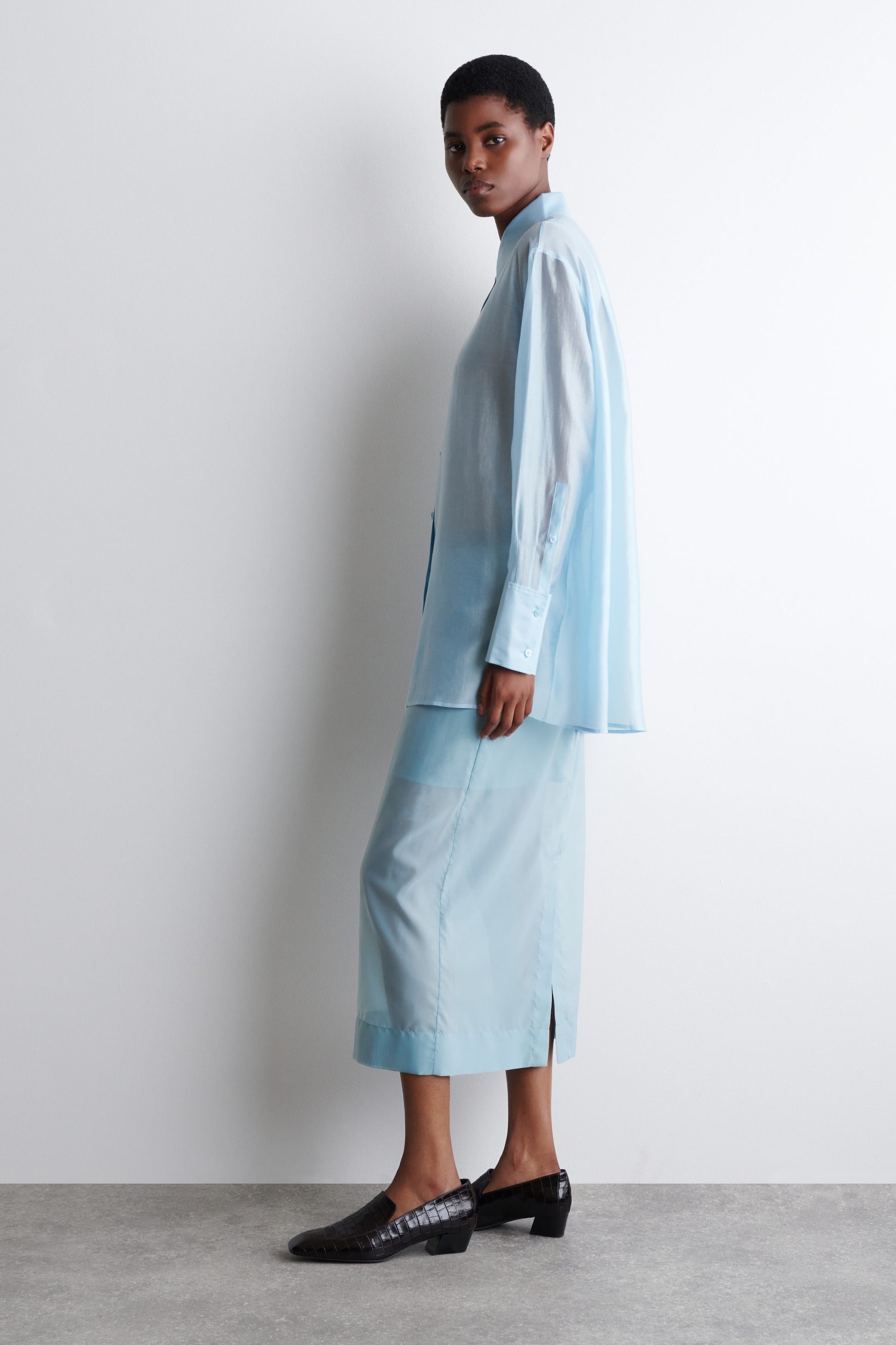 The COS womenswear team lean into the sheerness trend for the season ahead. This striking shirt is crafted from gauzy chiffon that shows subtle hints of skin and designed with a stepped hem that is slightly longer at the back. Style it with the matching skirt for tone-on-tone hues.