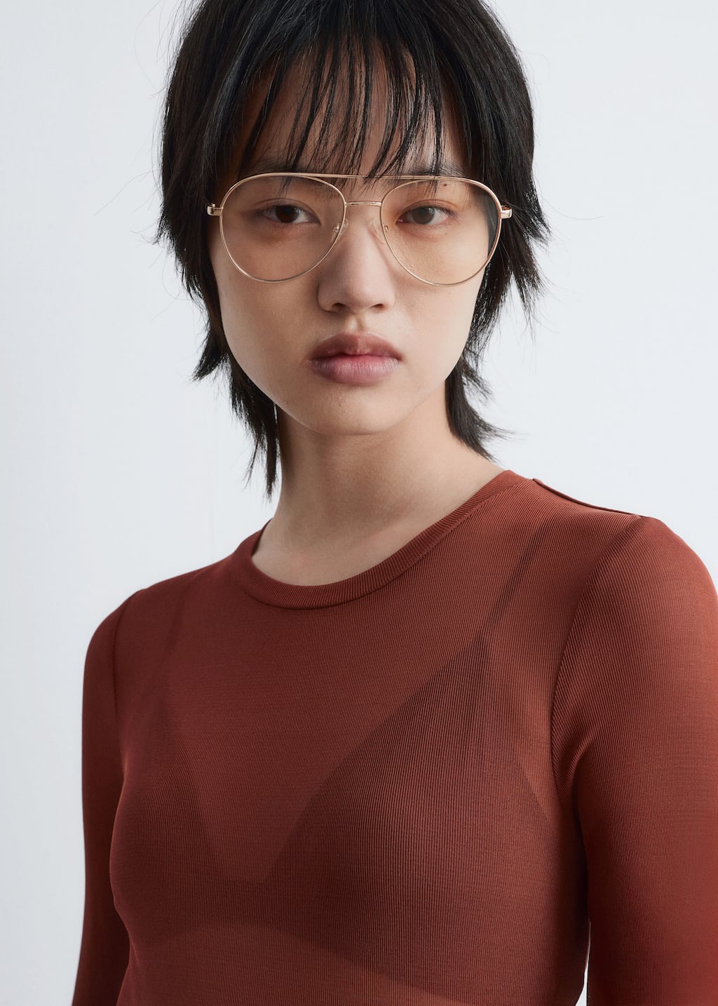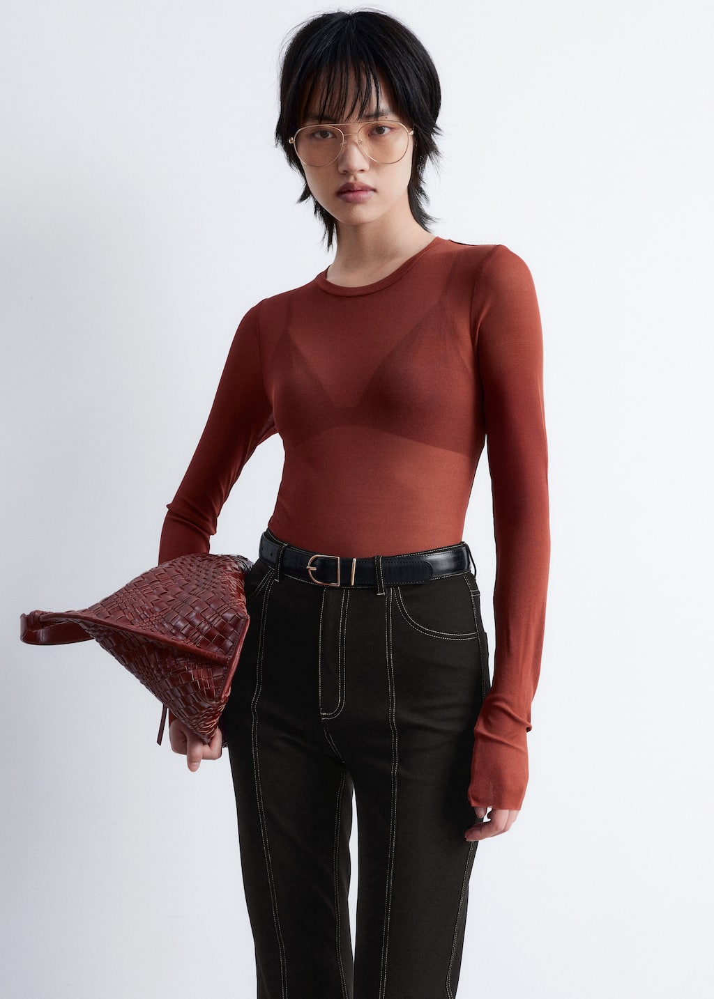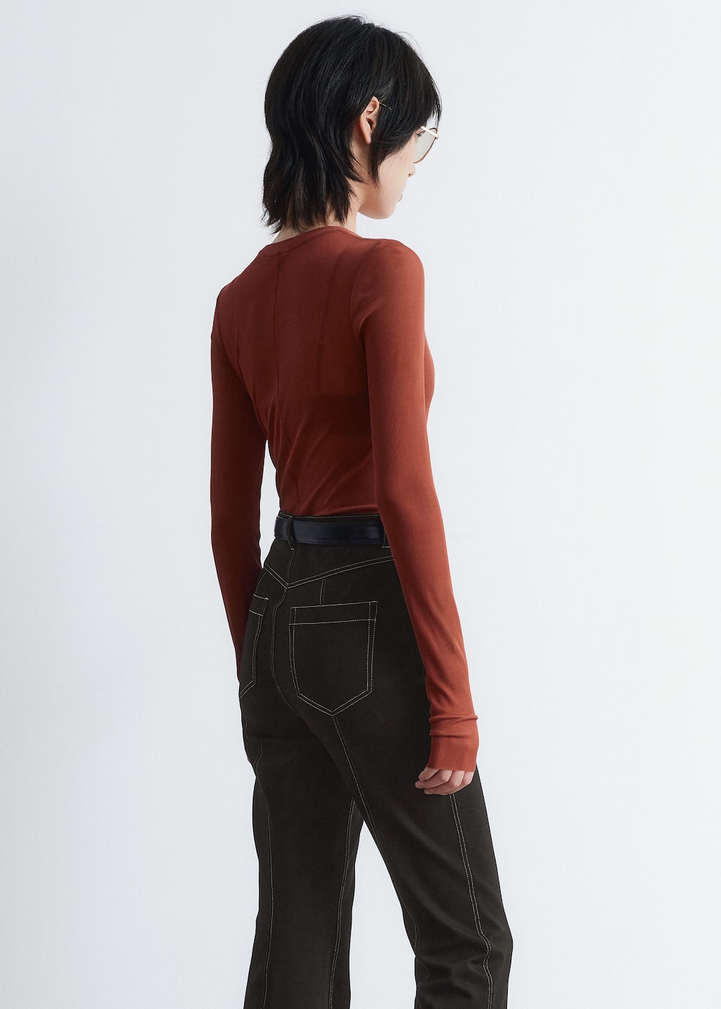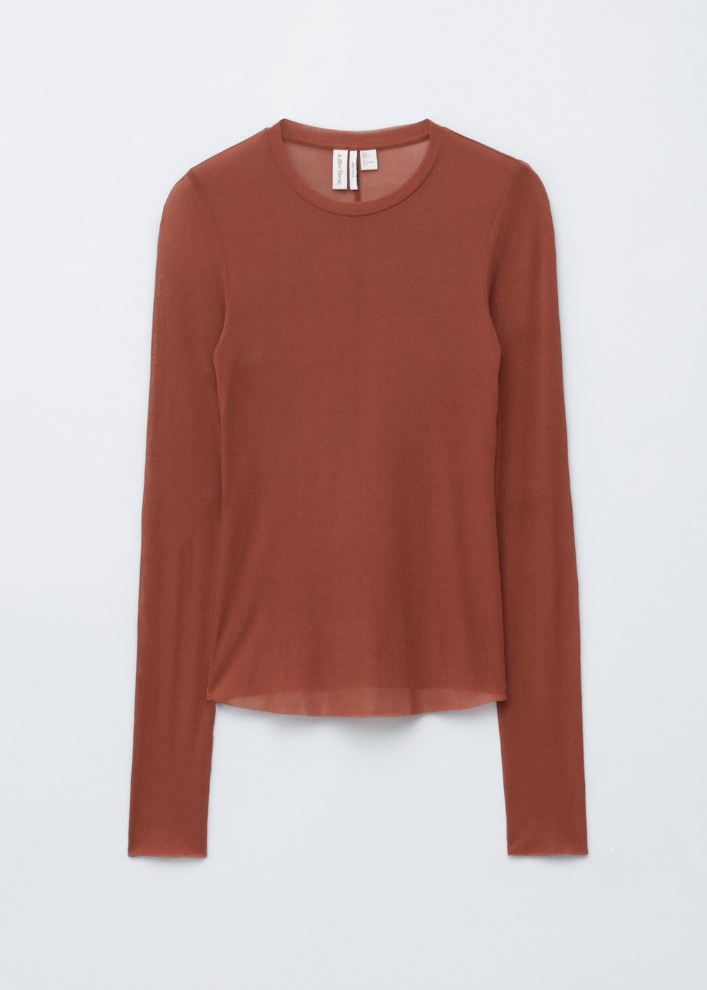 Long-sleeve top crafted from sumptous mulberry silk. Featuring a sheer finish.