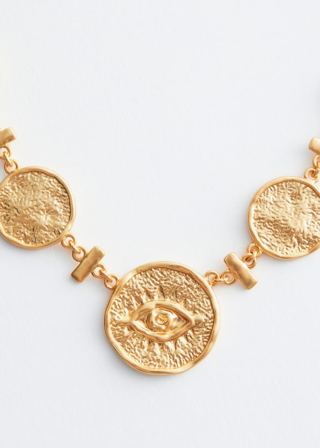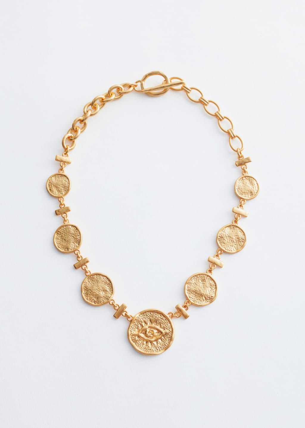 This short necklace features textured plate charms with elongated beads in between. The central charm is engraved with an eye-shaped motif. Finished with chunky mismatched chains and a toggle clasp fastening at the back.