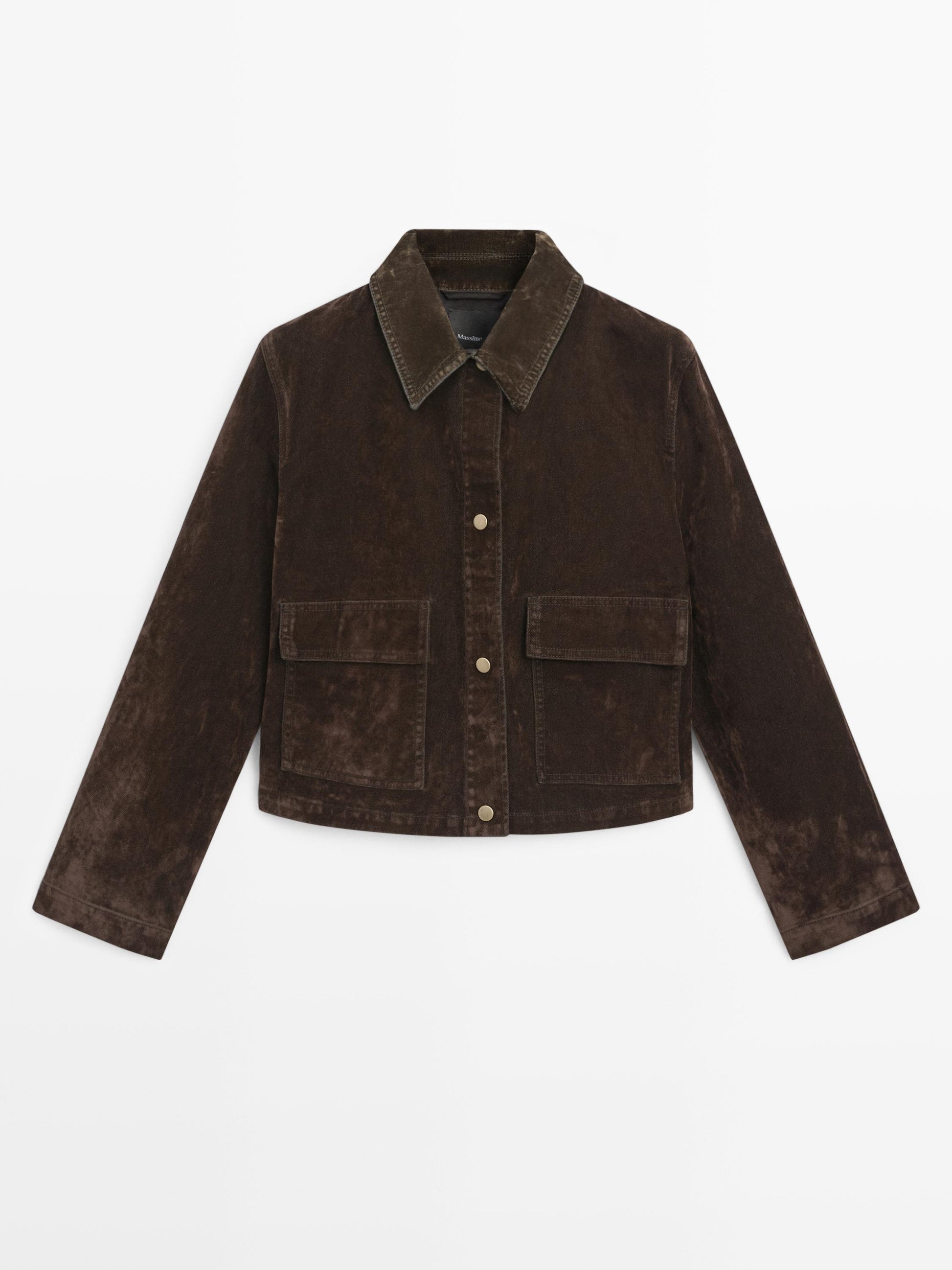 Denim effect jacket . Shirt collar. Fastens with snap buttons. Two flap pockets. Matching garment available. Flock finish, velvety effect, soft to the touch.