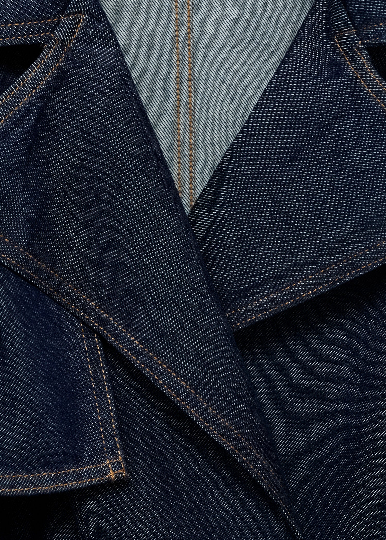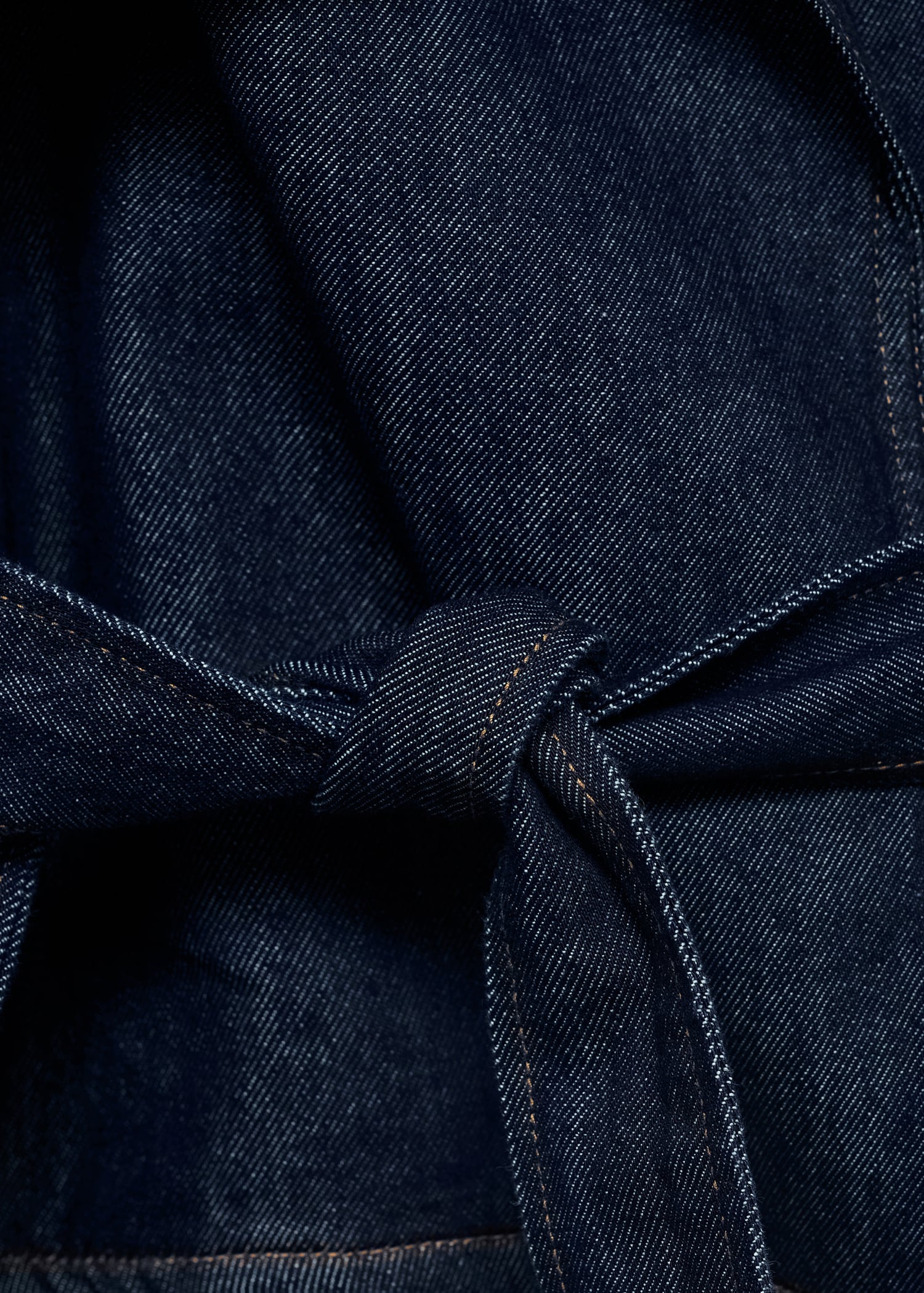 Crafted from denim-style cotton fabric, this short and oversized design features a notched lapel V-neck. It includes epaulettes on the shoulders, sleeves, and waist, with a robe-style belt. Two side pockets and front closure.
