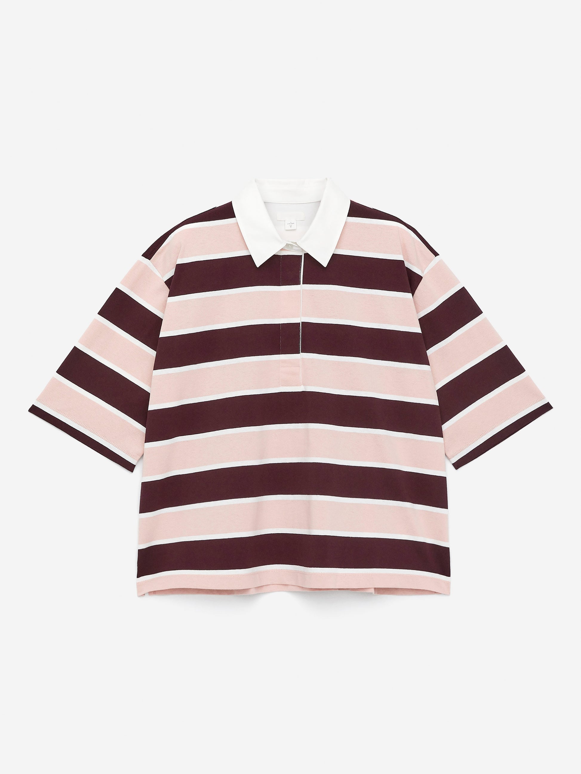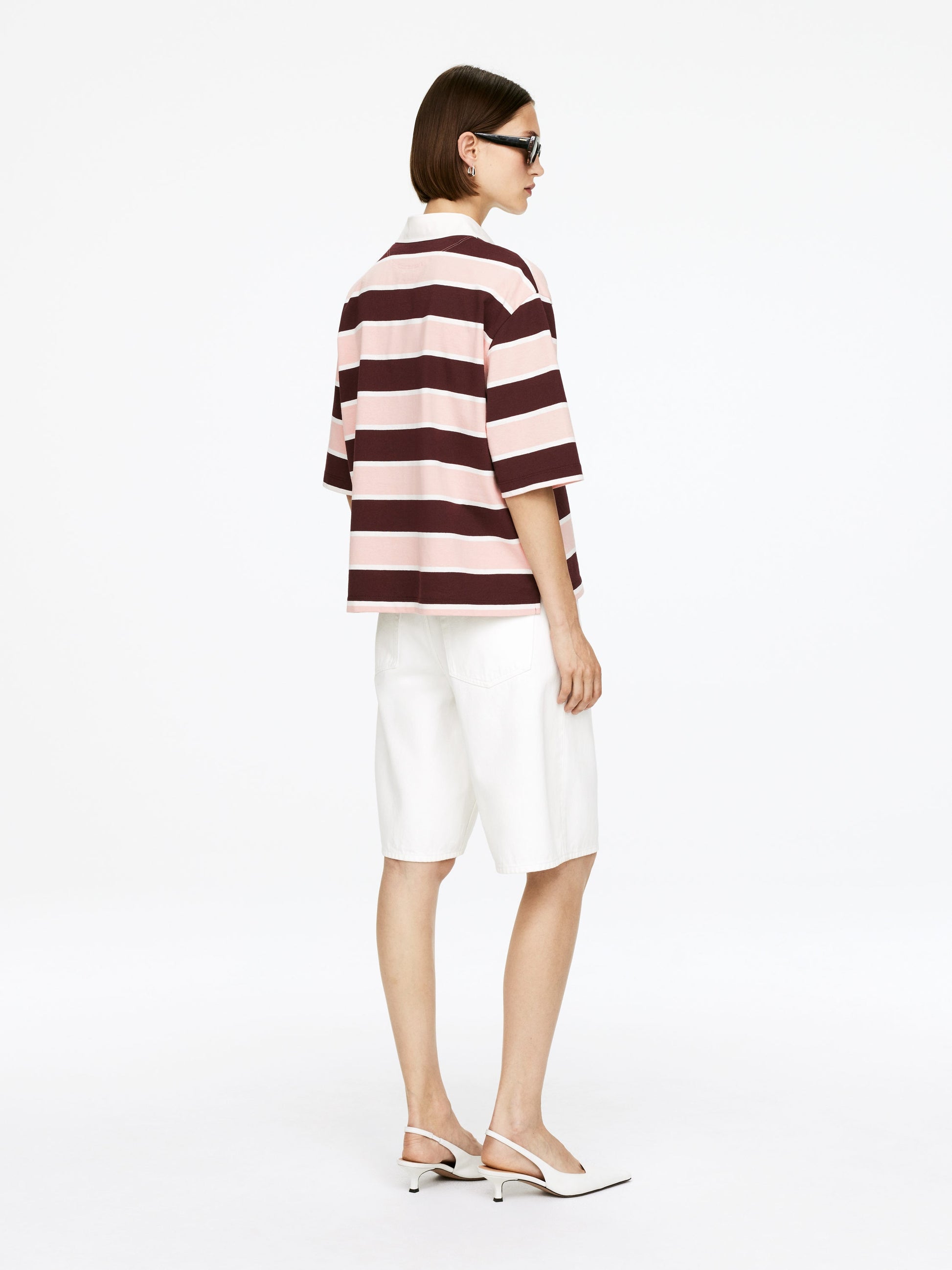 Short-sleeved polo shirt with dropped shoulders, a concealed front placket, and side seam splits.
