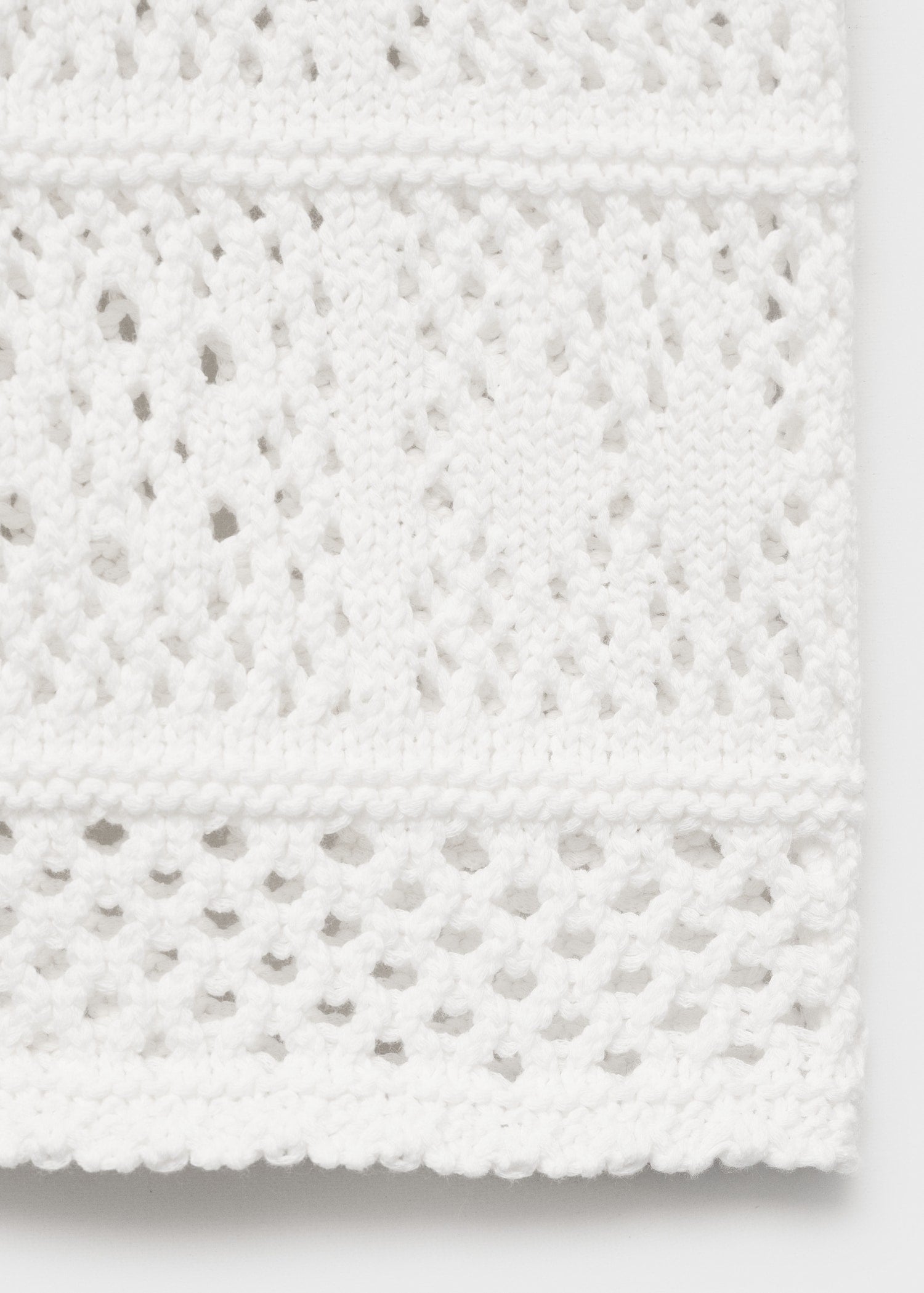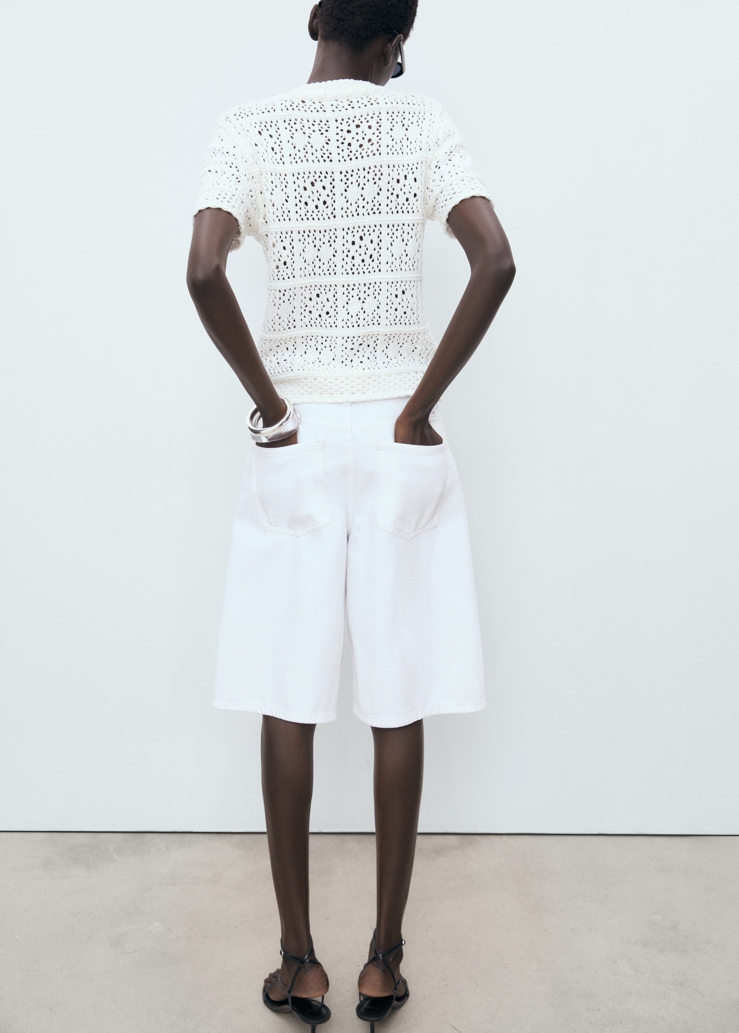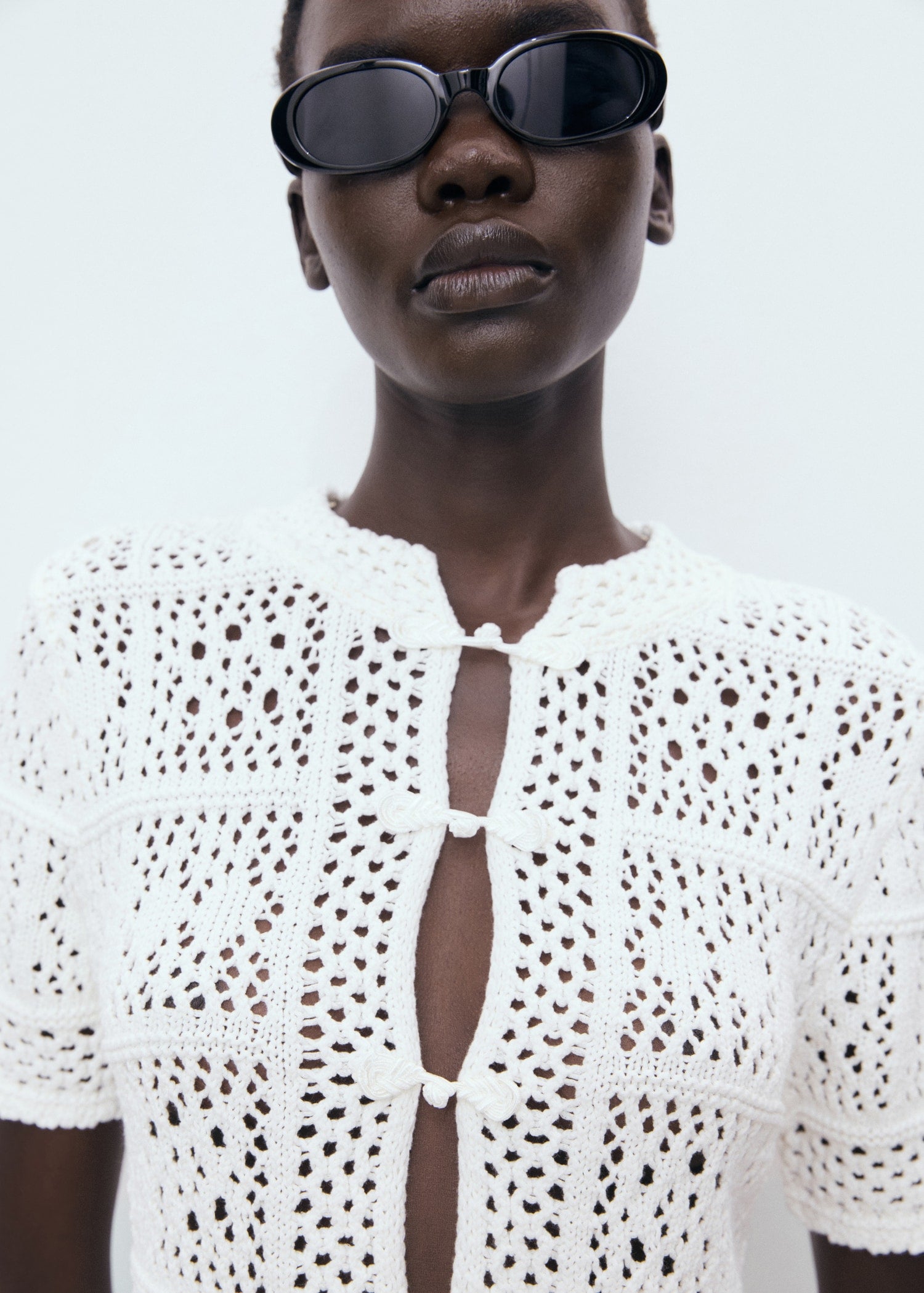 100% cotton fabric. Crochet fabric. Crew neck. Short sleeves. Front closure with buttons. Bow button closure.