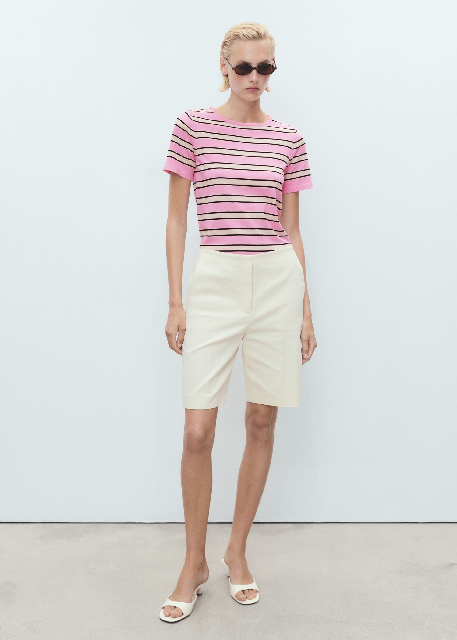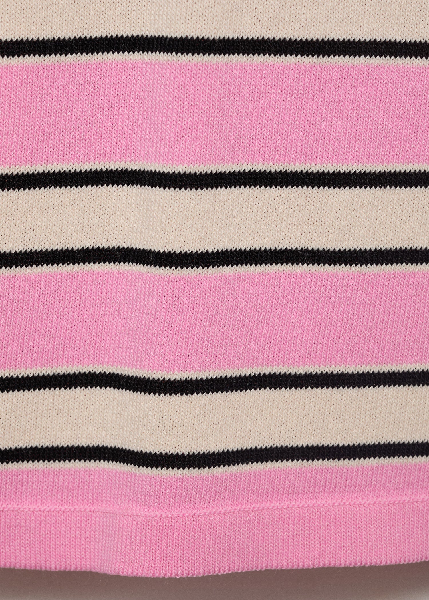 Fine-knit fabric. Fabric with contrasting stripes. Straight design. Round neckline. Short sleeves. No closure.