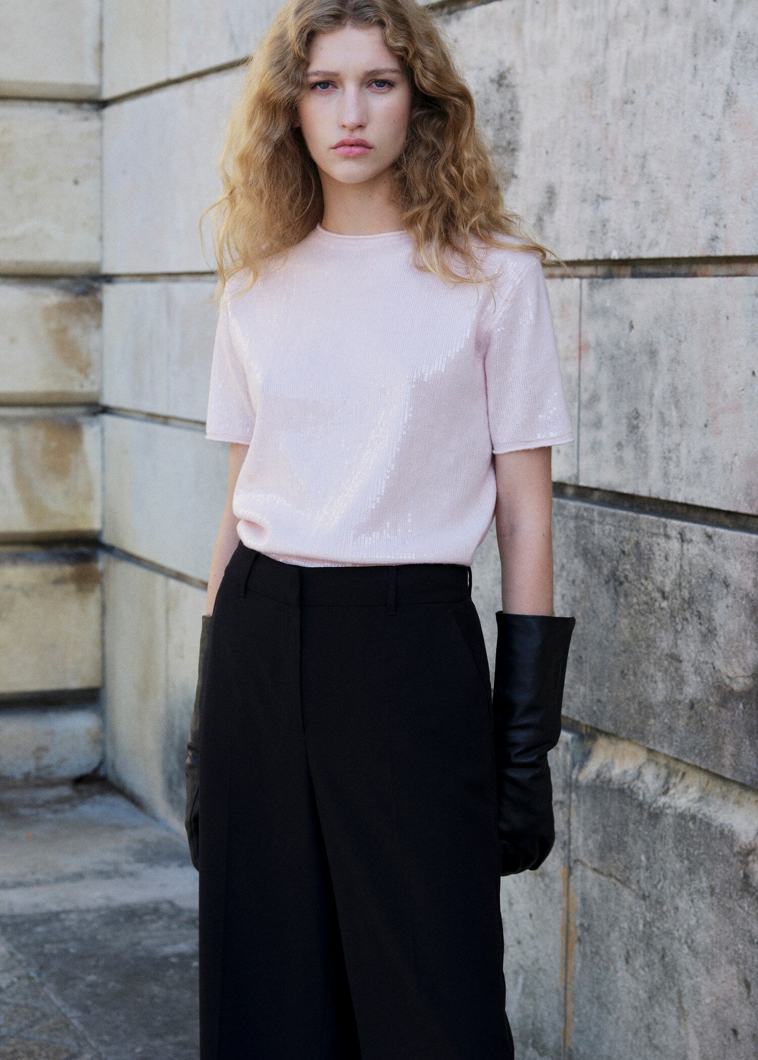 Fine-knit fabric. Fabric with sequin. Straight Design. Crew neck. Short sleeves. Available Plus. This garment is part of our party and event collection, designed to elevate your looks for special occasions.
