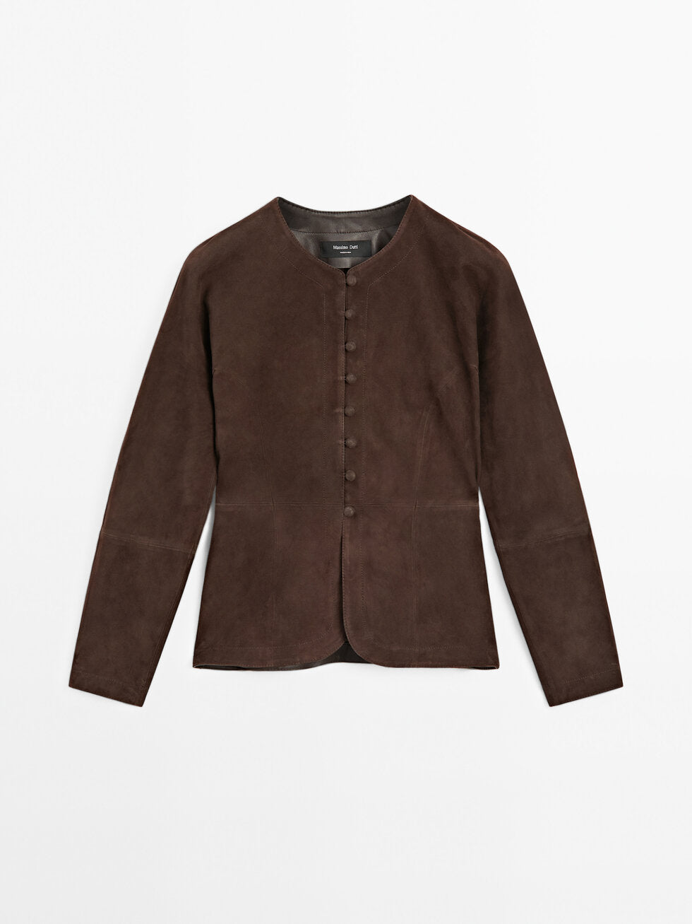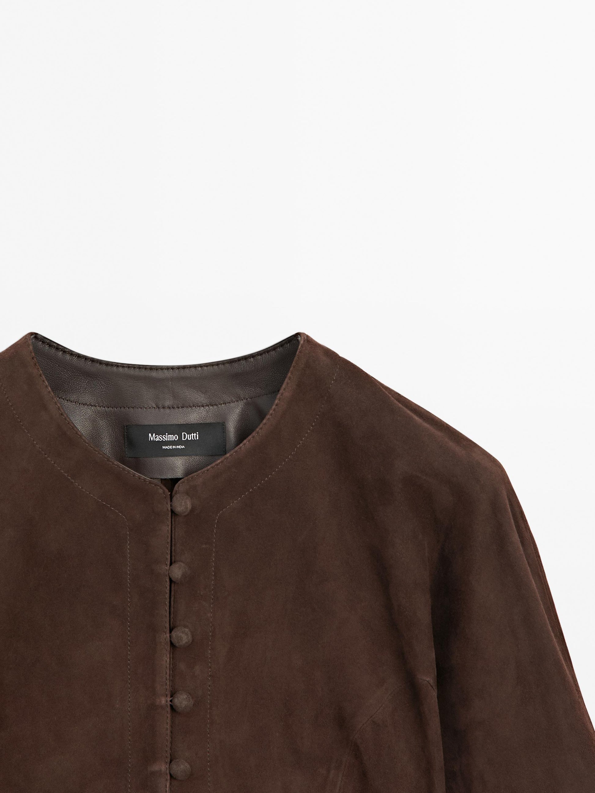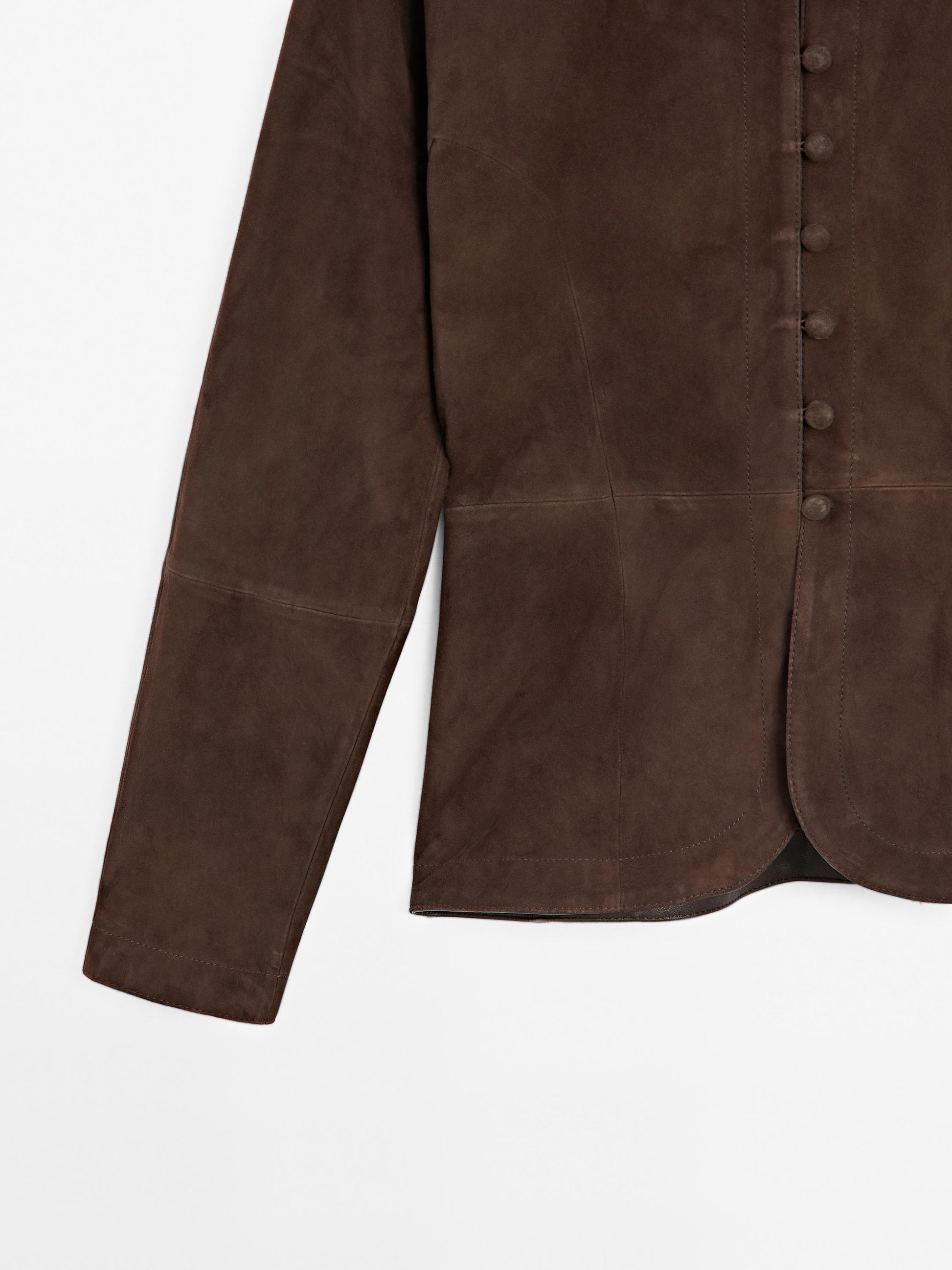 Shirt made of goatskin with a suede finish. Crew neck. Long sleeves. Button and press stud fastening. Batwing sleeves. Seam details .
