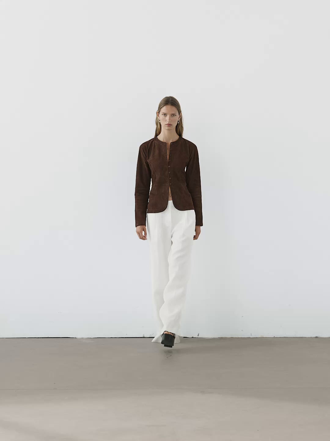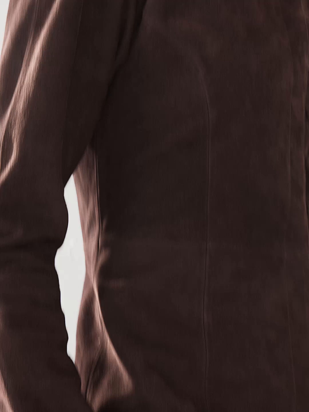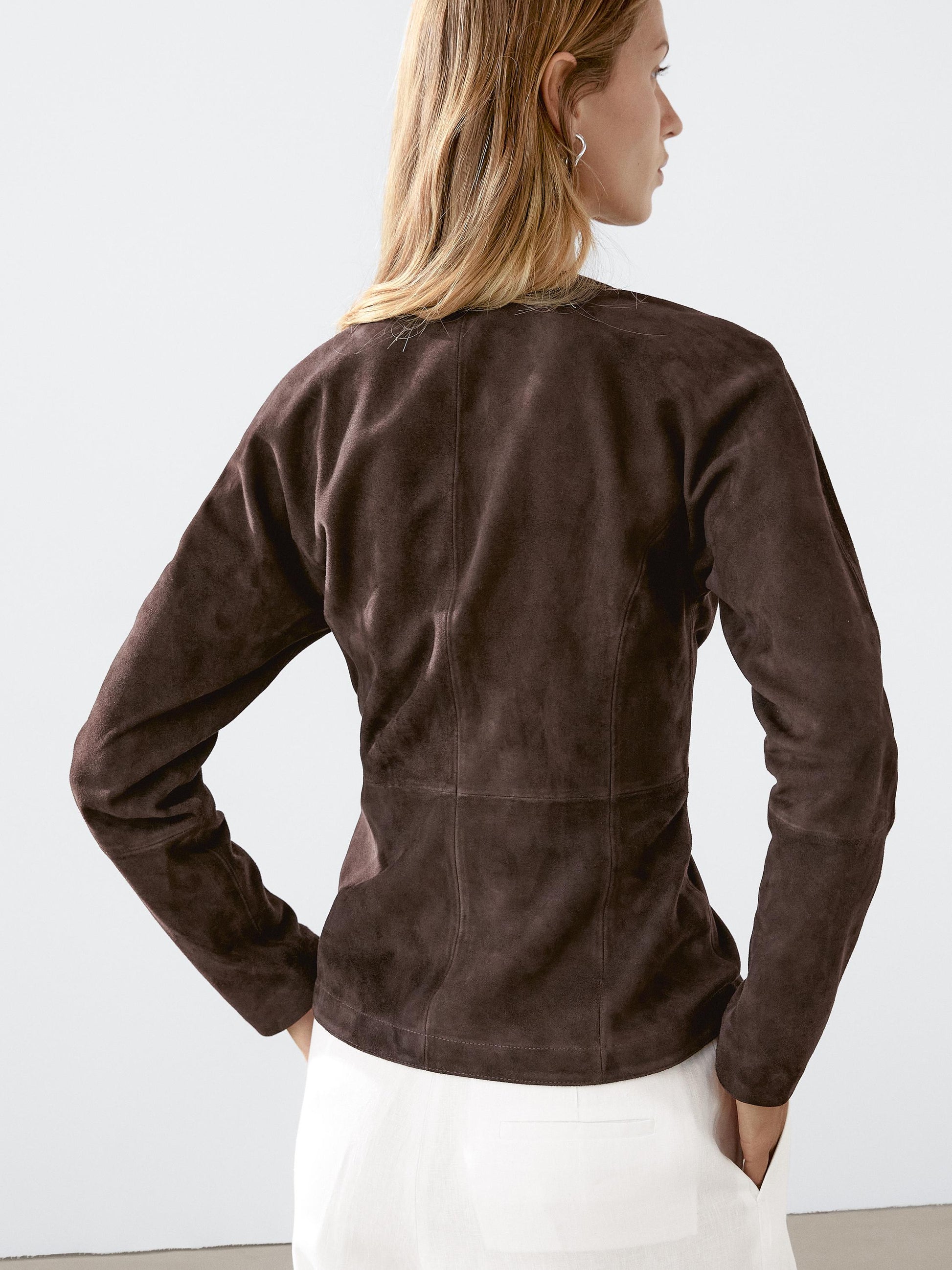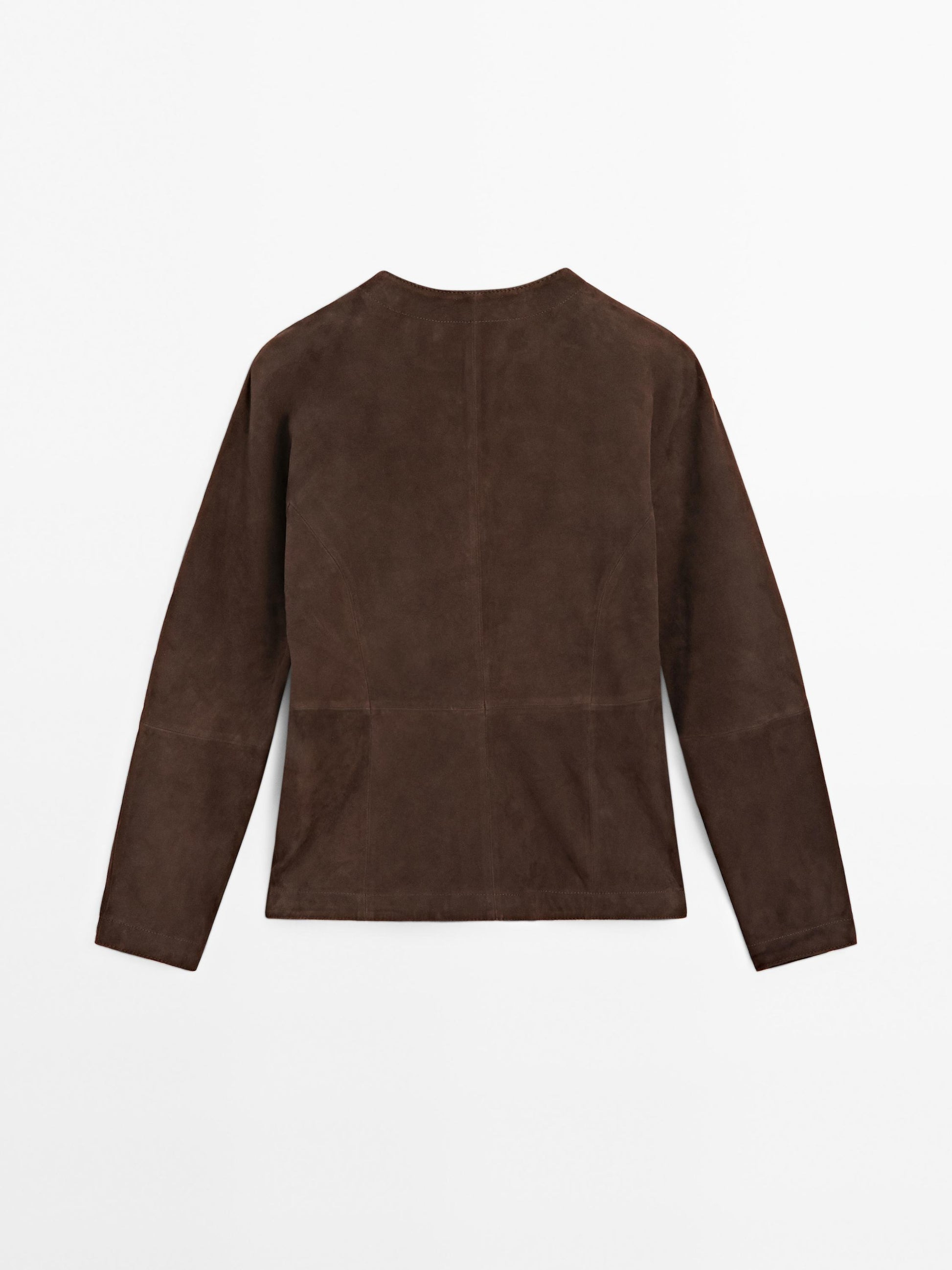 Shirt made of goatskin with a suede finish. Crew neck. Long sleeves. Button and press stud fastening. Batwing sleeves. Seam details .