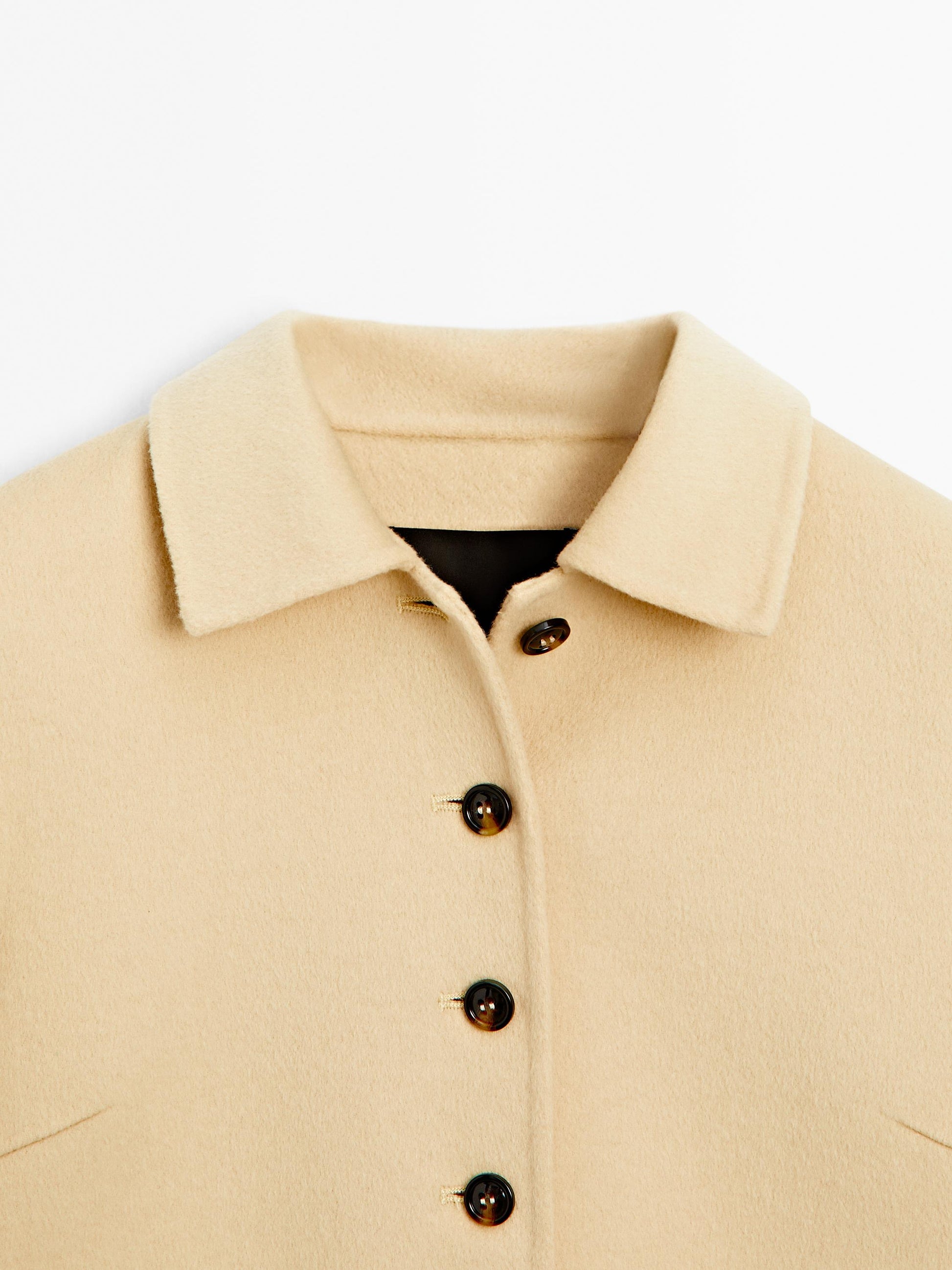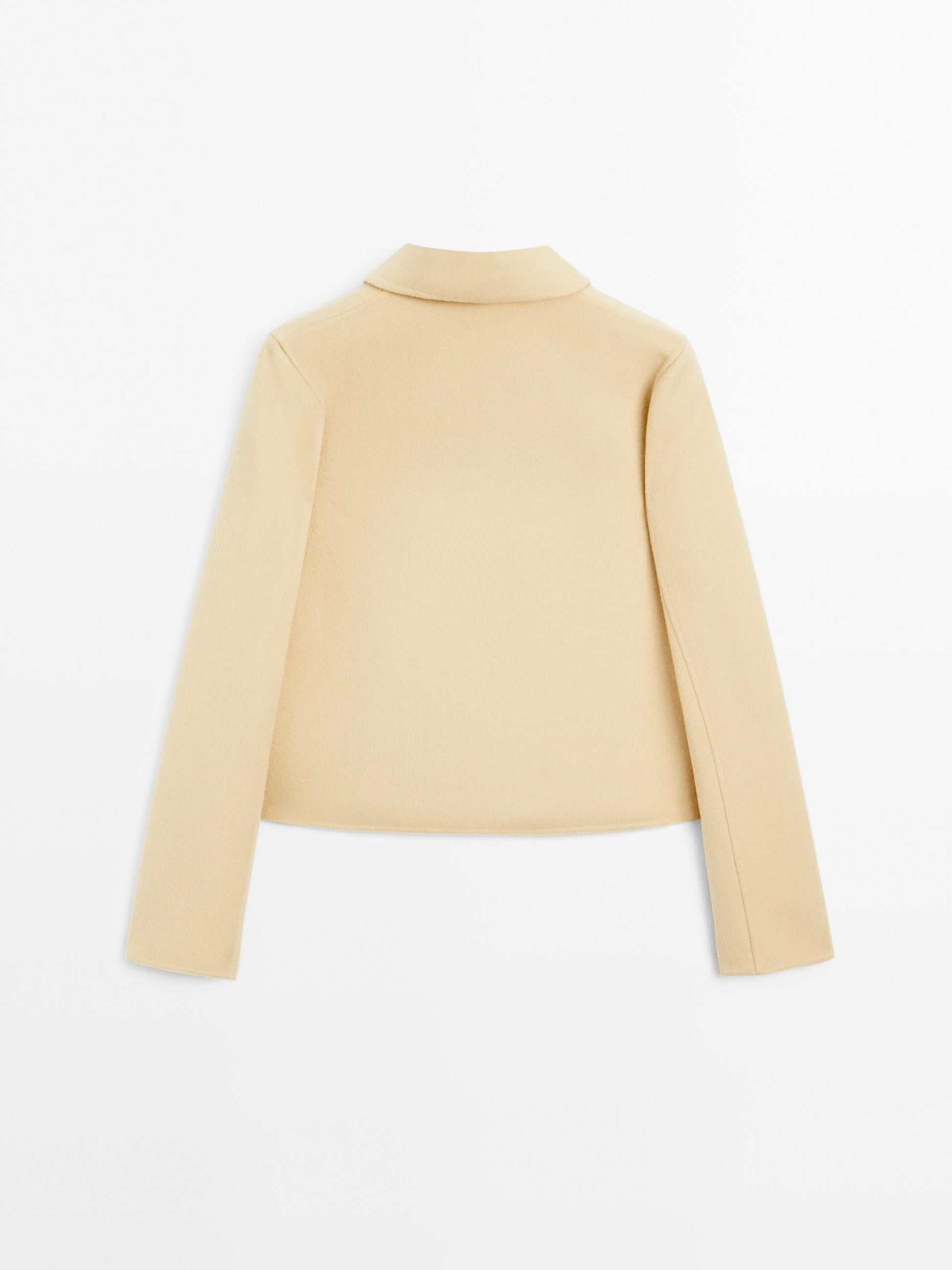 Short coat made of woollen blend fabric. Shirt collar. Long sleeves. Button-up front.