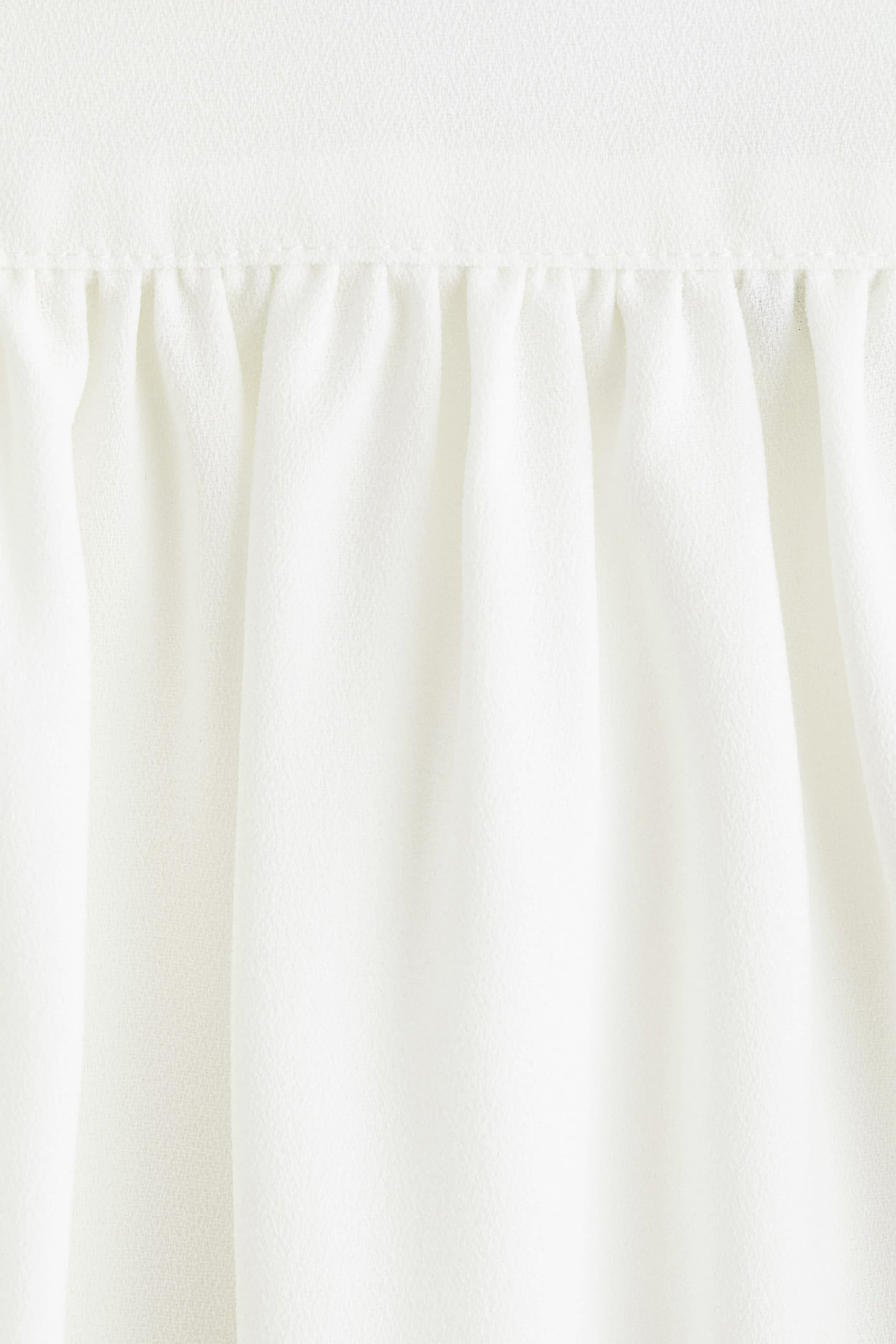 Oversized blouse in a crpe weave with a stand collar and buttons down the back. Yoke with gathers at the front and back, bold shoulder pads and long puff sleeves with a slit and long ties at the cuffs. Rounded hem.