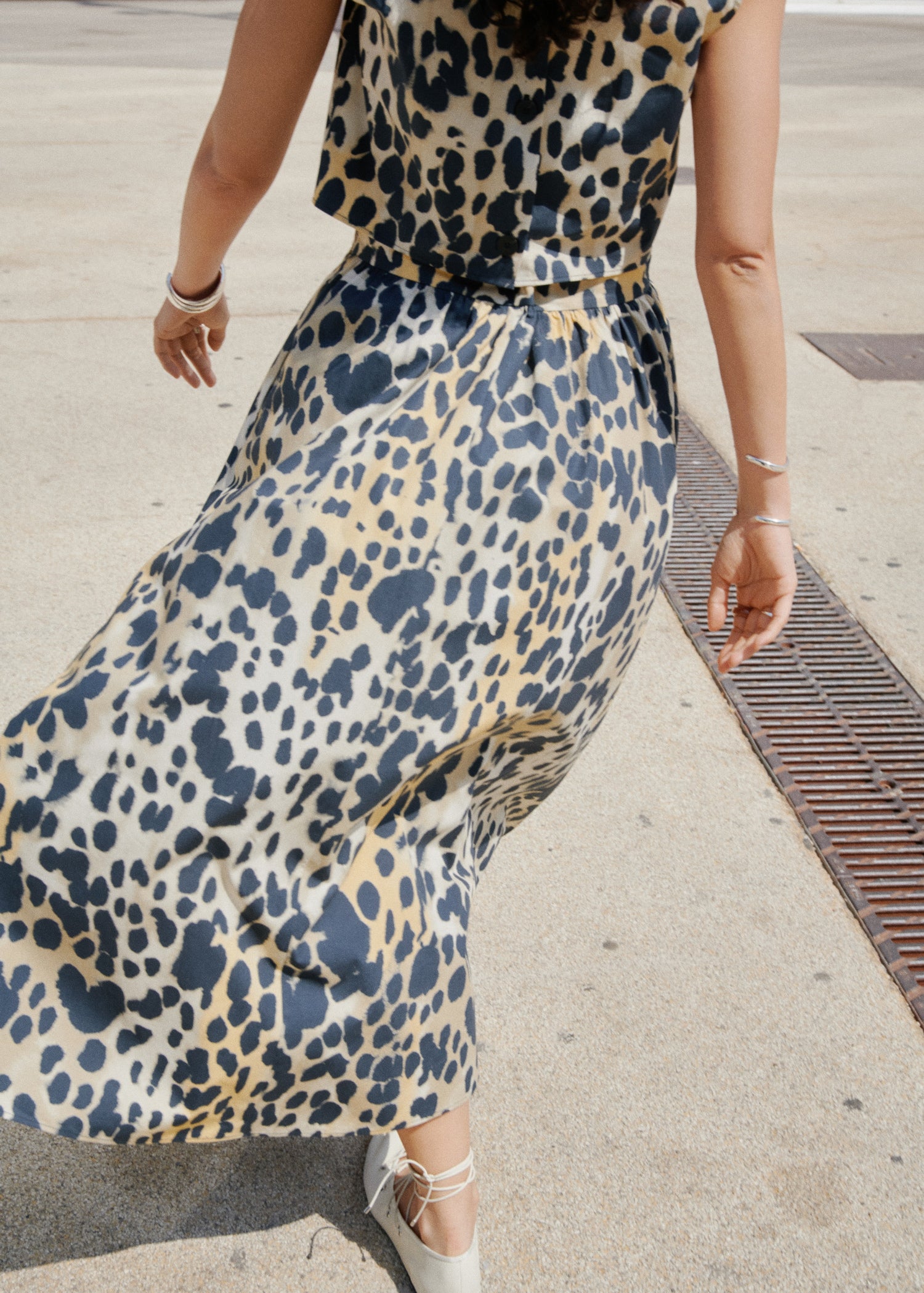 100% cotton fabric. Midi design. A-line design. Animal print. Mid-rise. Side zip closure.