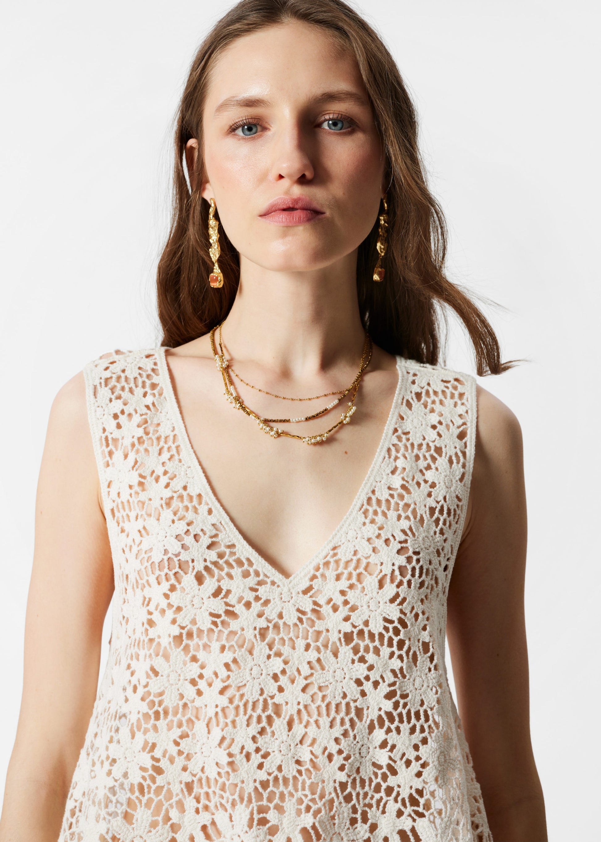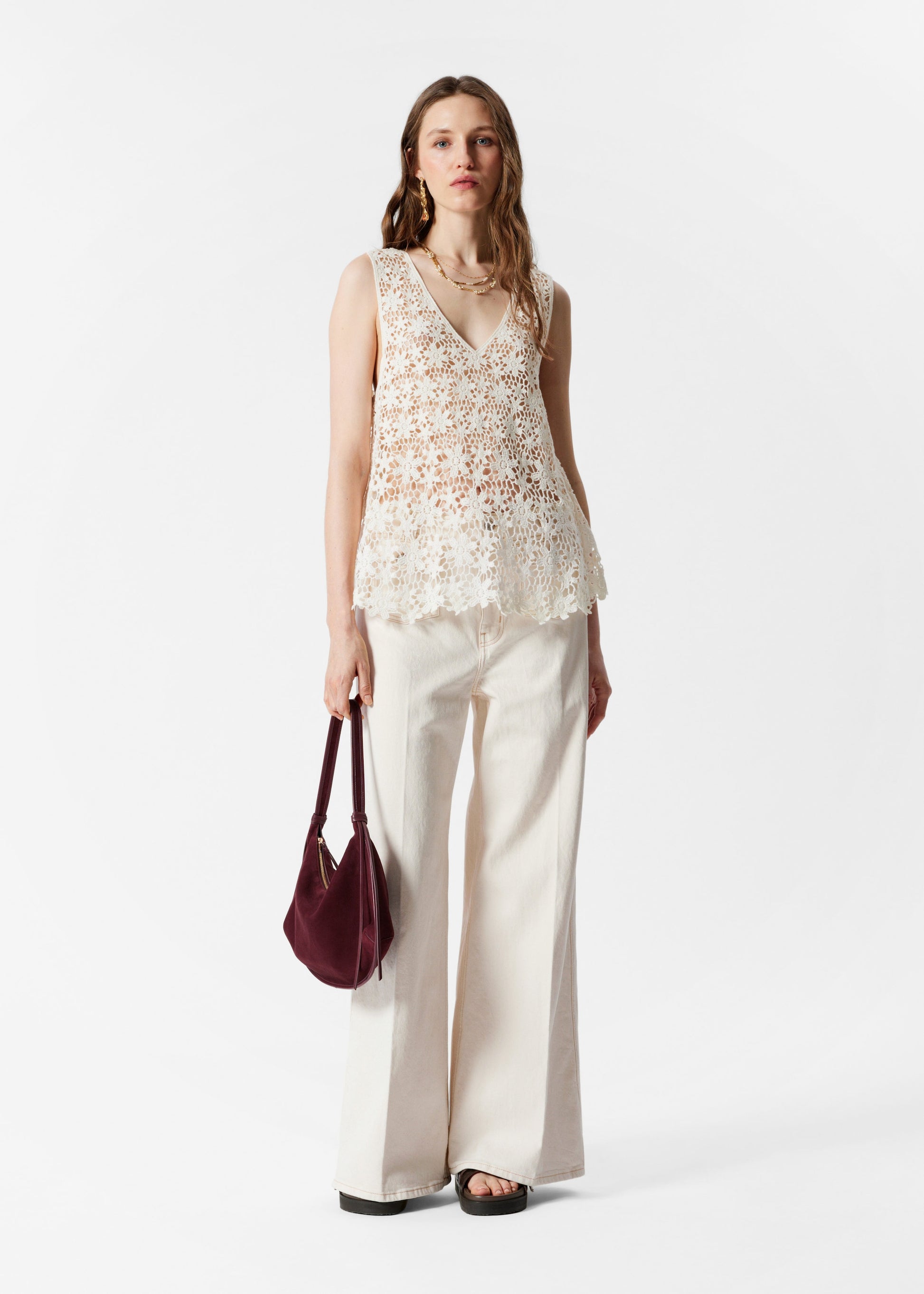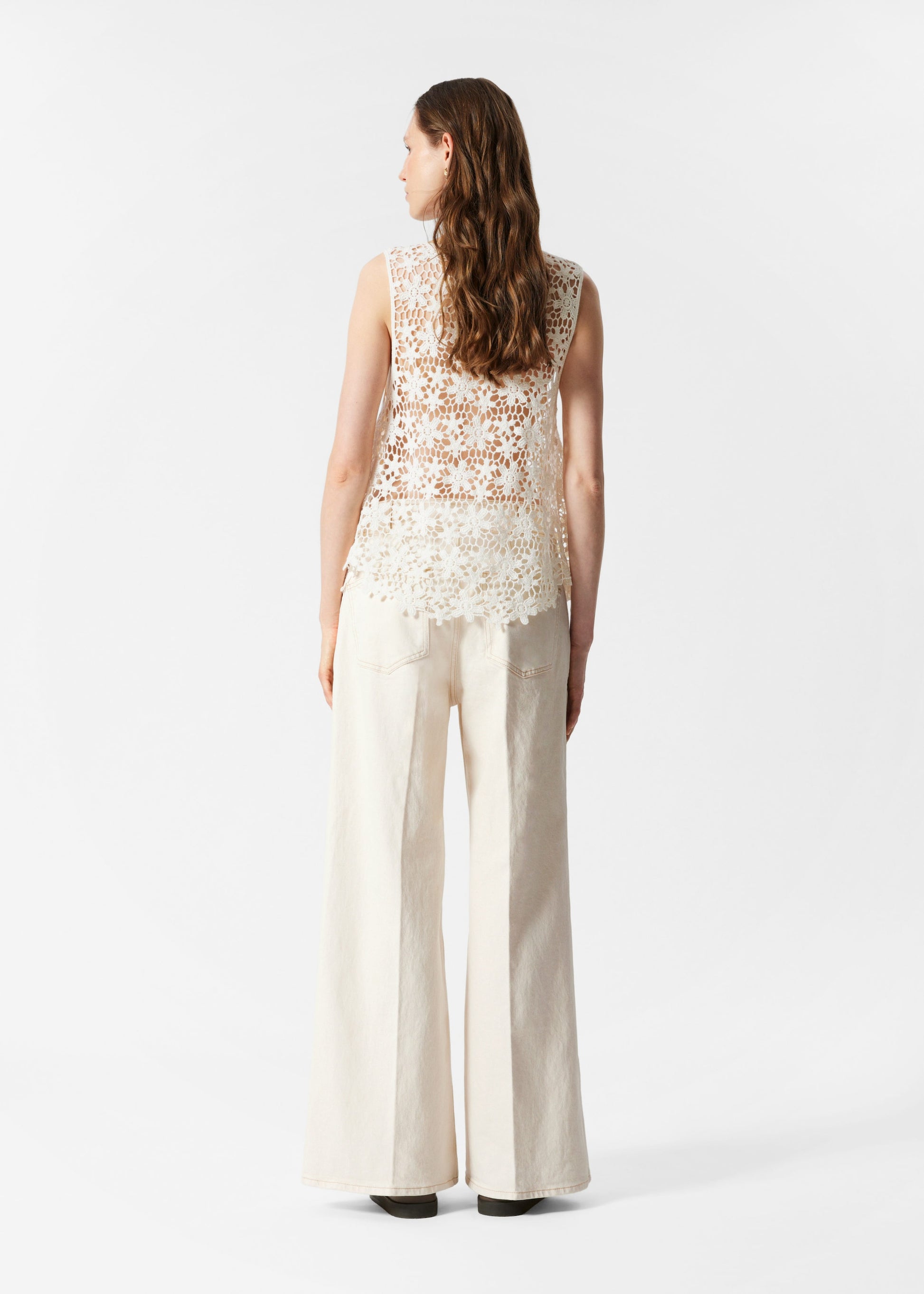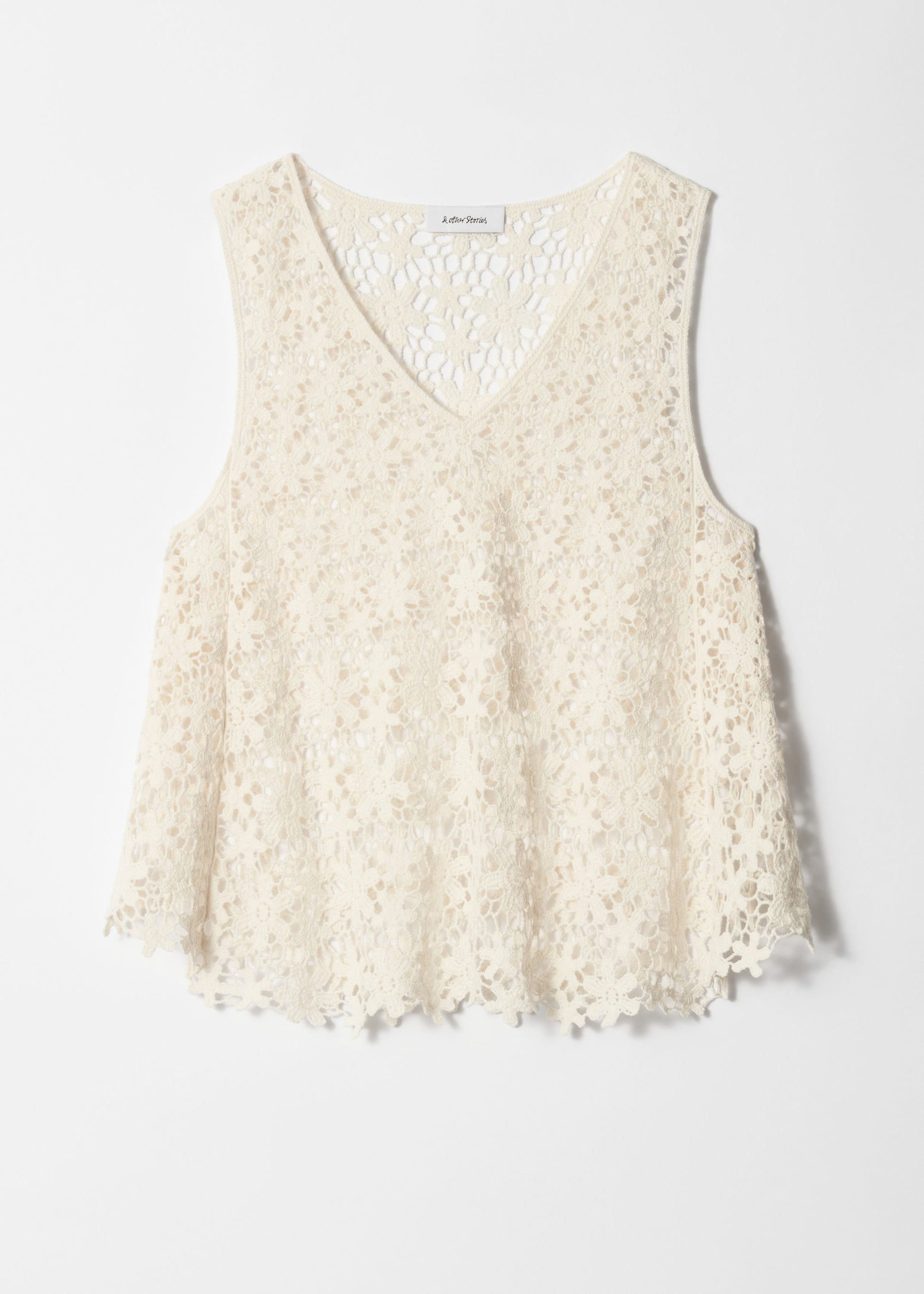 This sleeveless top is made from pure cotton and knitted in an intricate floral lace pattern that creates a semi-sheer finish. Designed with a deep v-neckline and a softly flared hem. The crochet-inspired texture adds a light and airy qualityideal for layering or wearing on its own on warmer days.