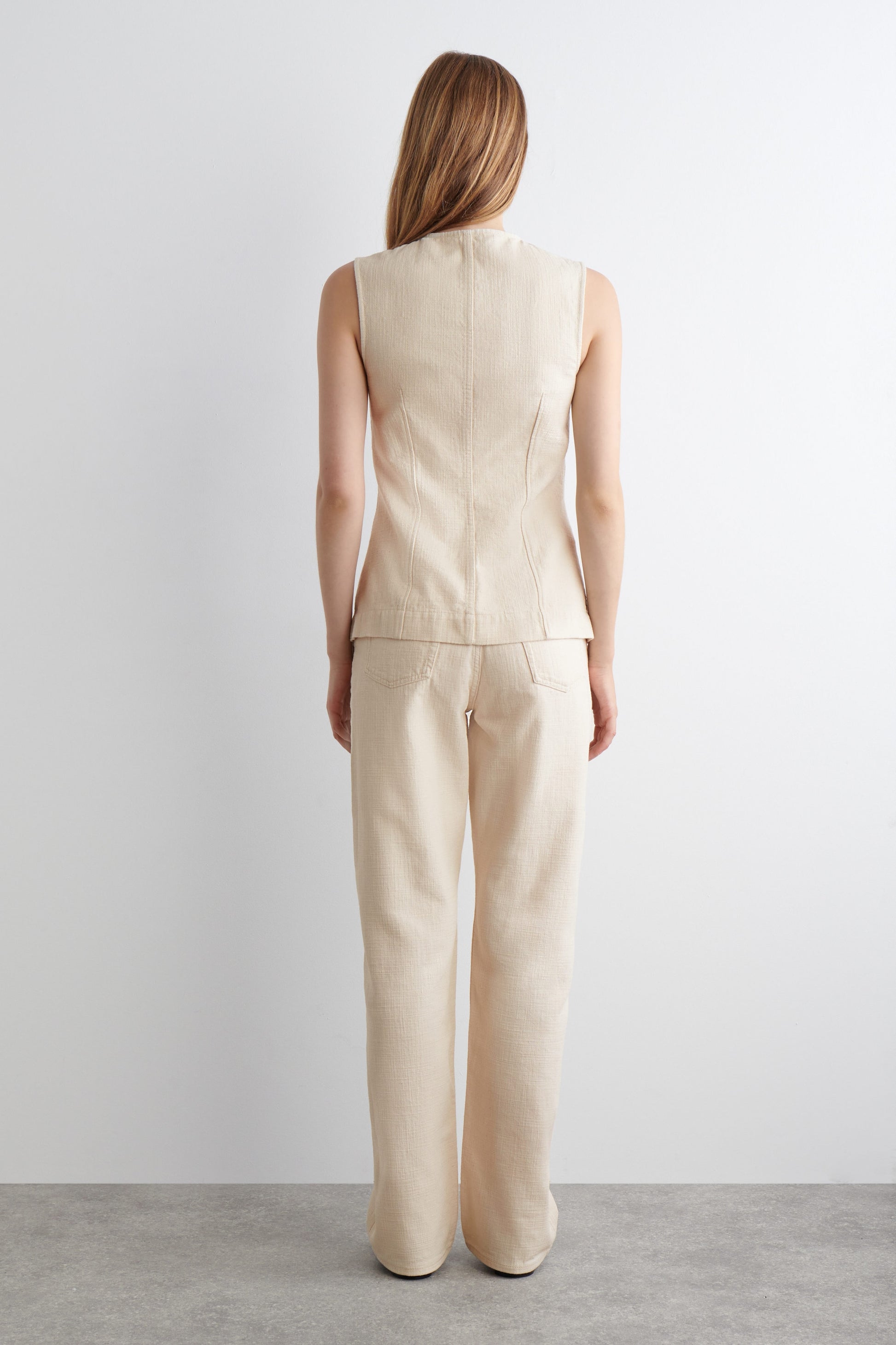 Classic denim silhouettes have been reimagined for the upcoming season. This modern top is cut in a slim shape with contouring waist darts and is made from organic and recycled cotton that's lightened an off-white hue.