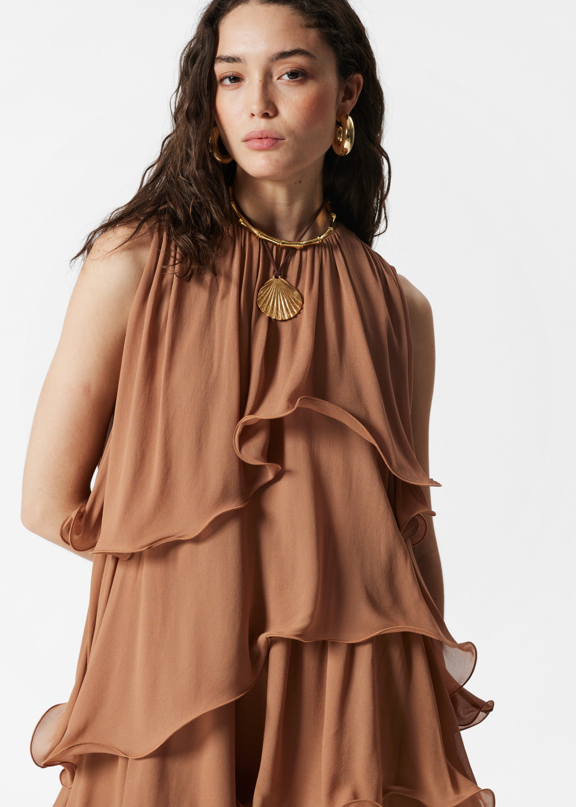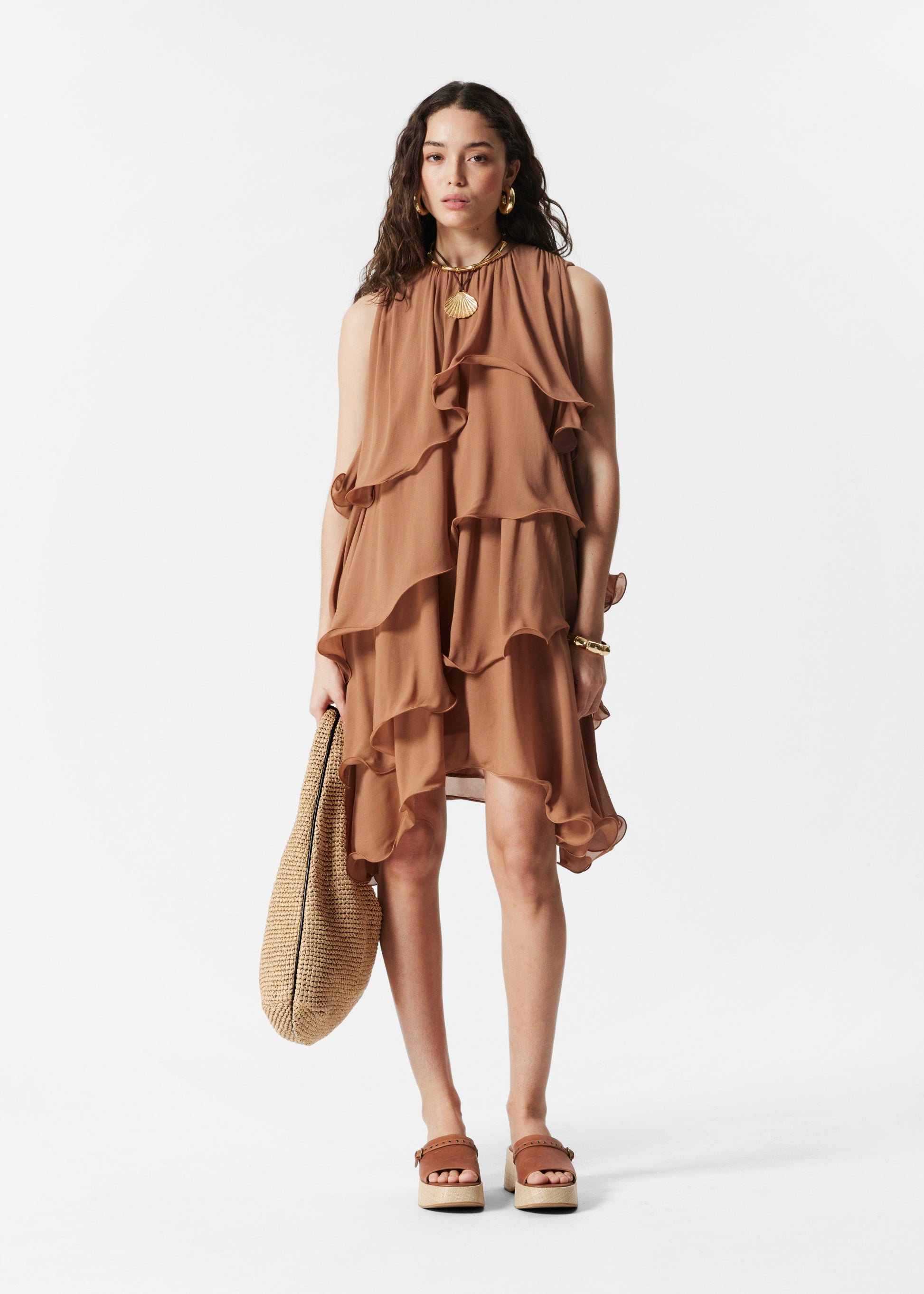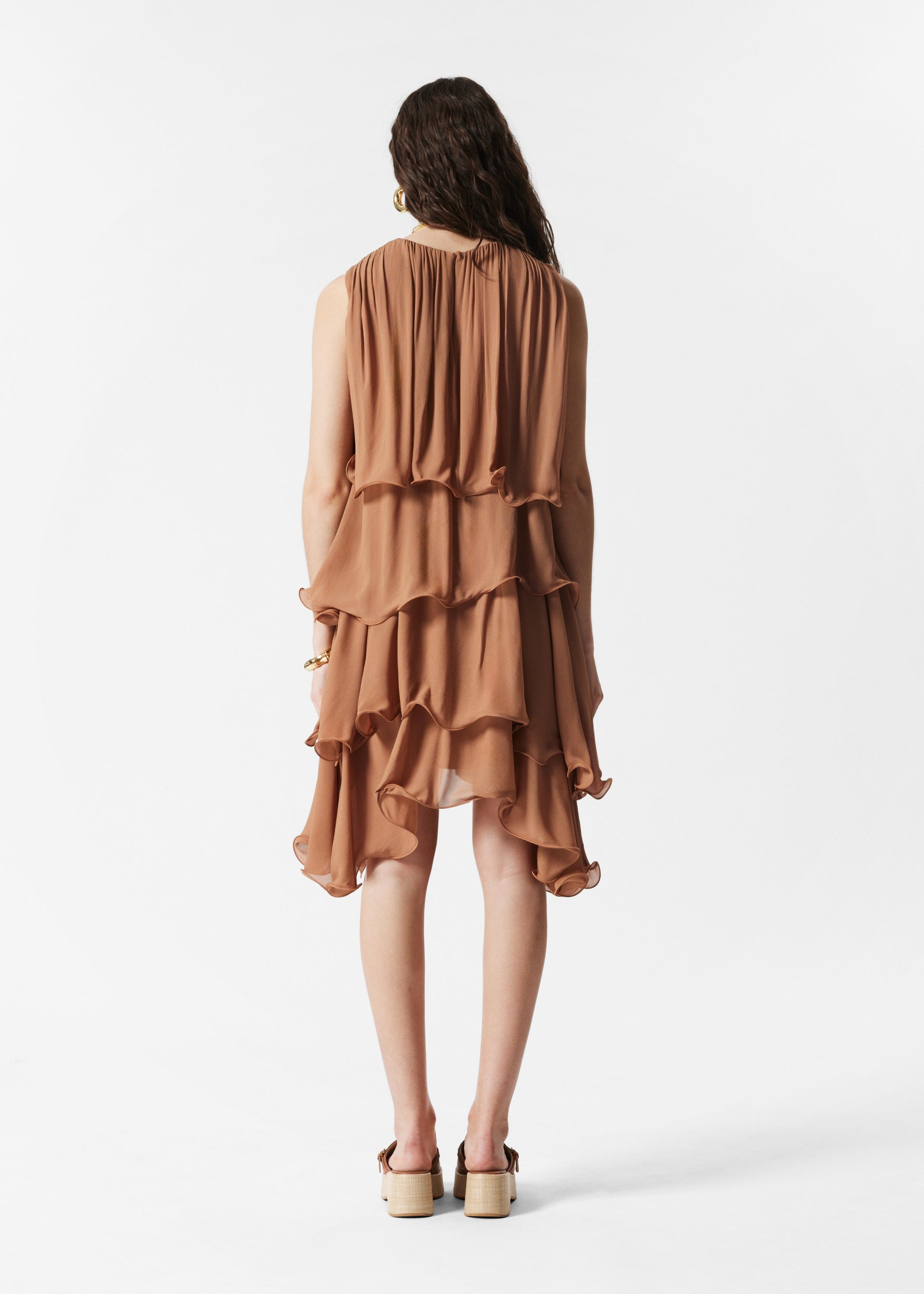 This sleeveless mini dress is crafted from a light and airy chiffon fabric. Cut in a flowy A-line silhouette, it features a round neckline and cascading layers with frilled edges that fall into an asymmetric hemline, lending movement with every step. Finished with a keyhole button closure at the neck.