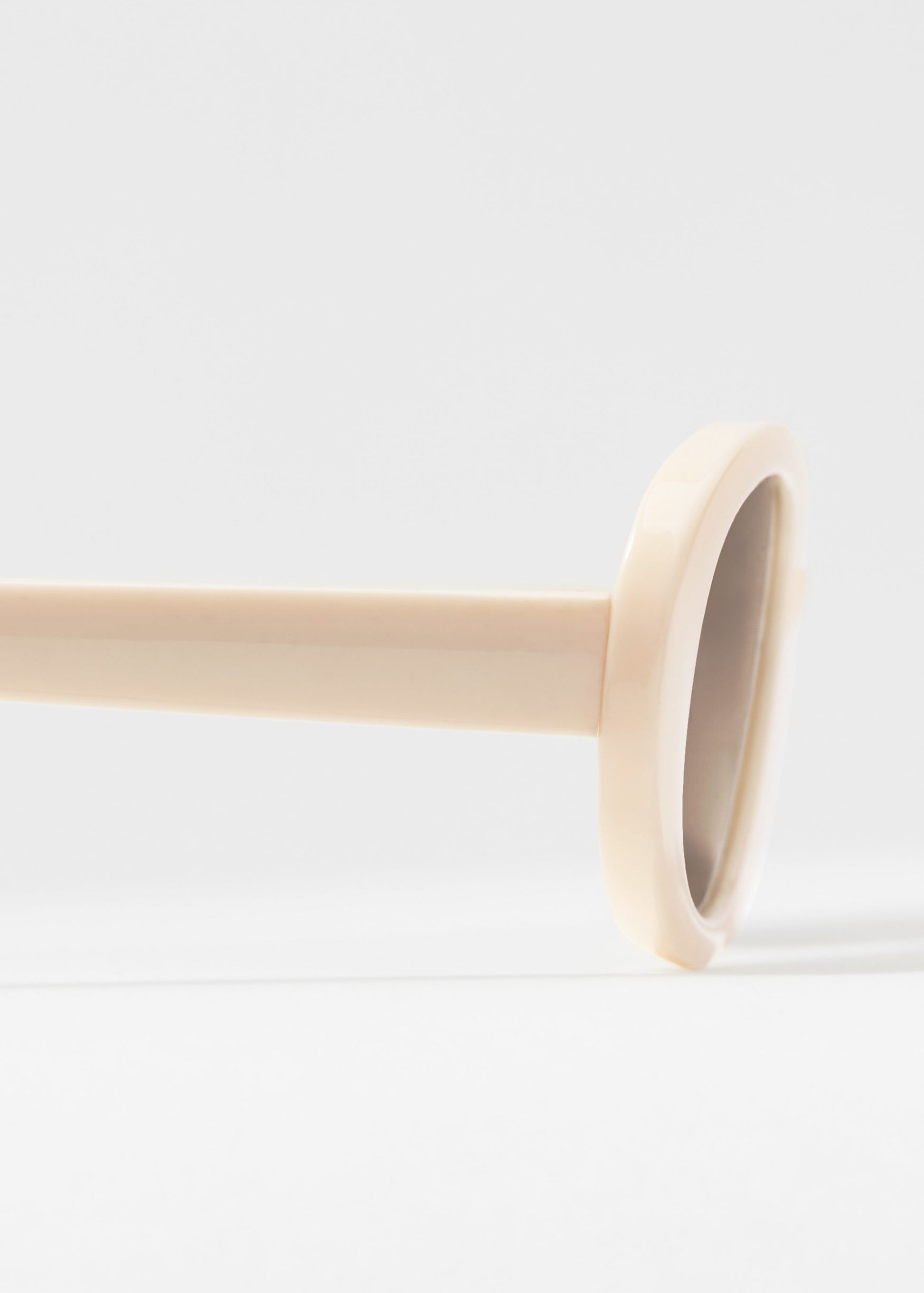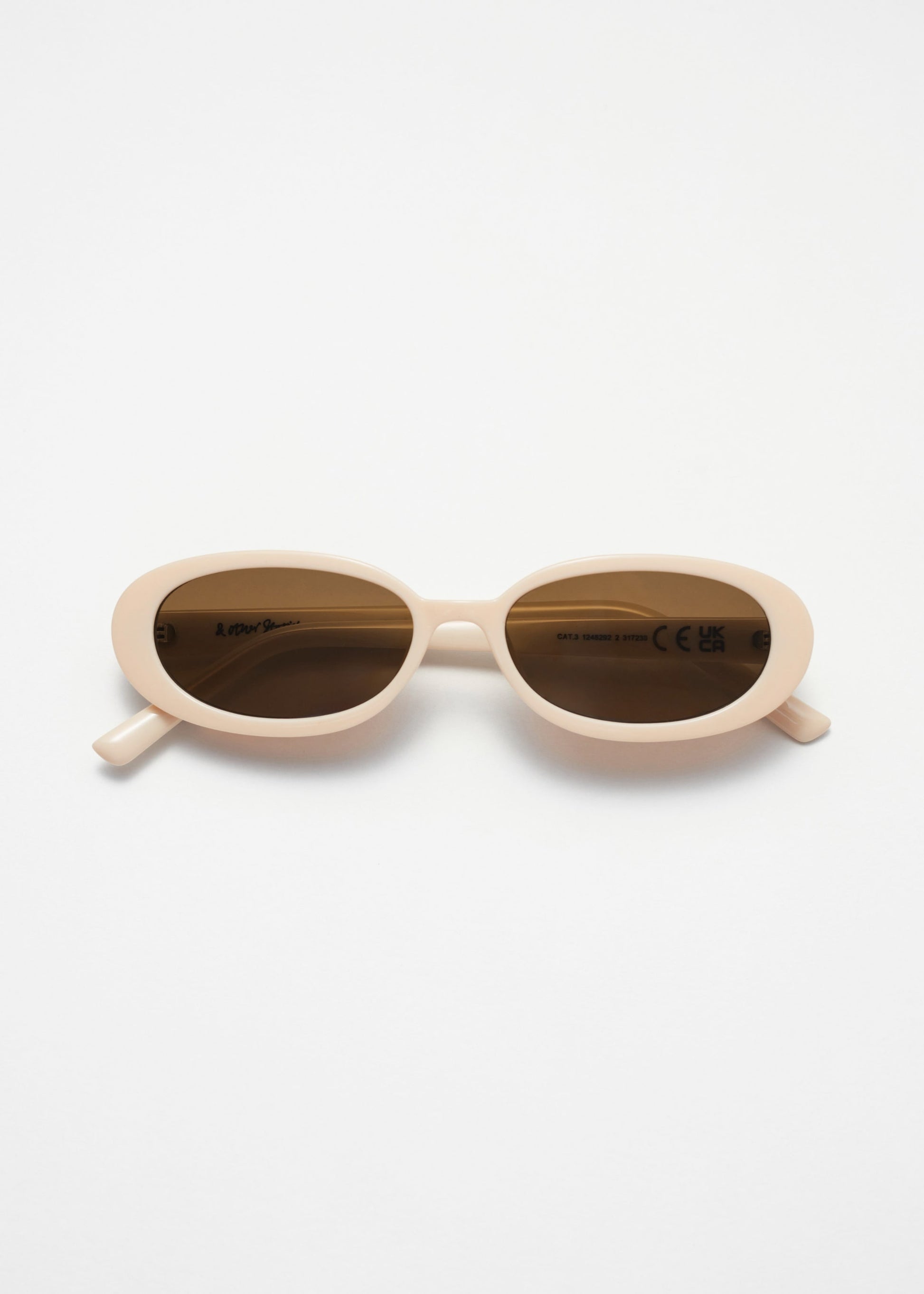 Solid coloured shiny 90s frame sunglasses with a petite oval shape. Made from a glossy durable material, they have tonal lenses and slim temples. Store yours in the accompanying case when you're not wearing them.
