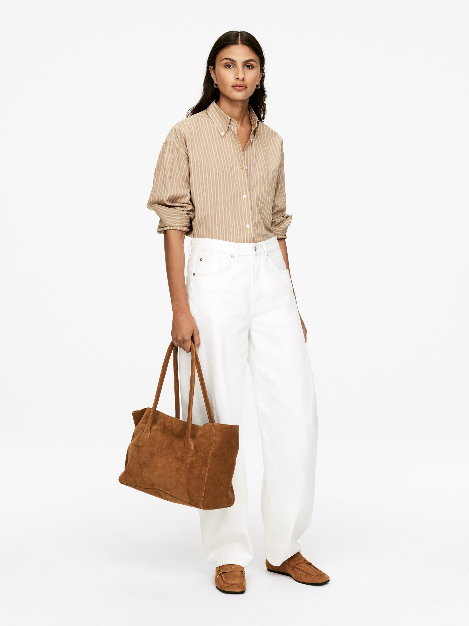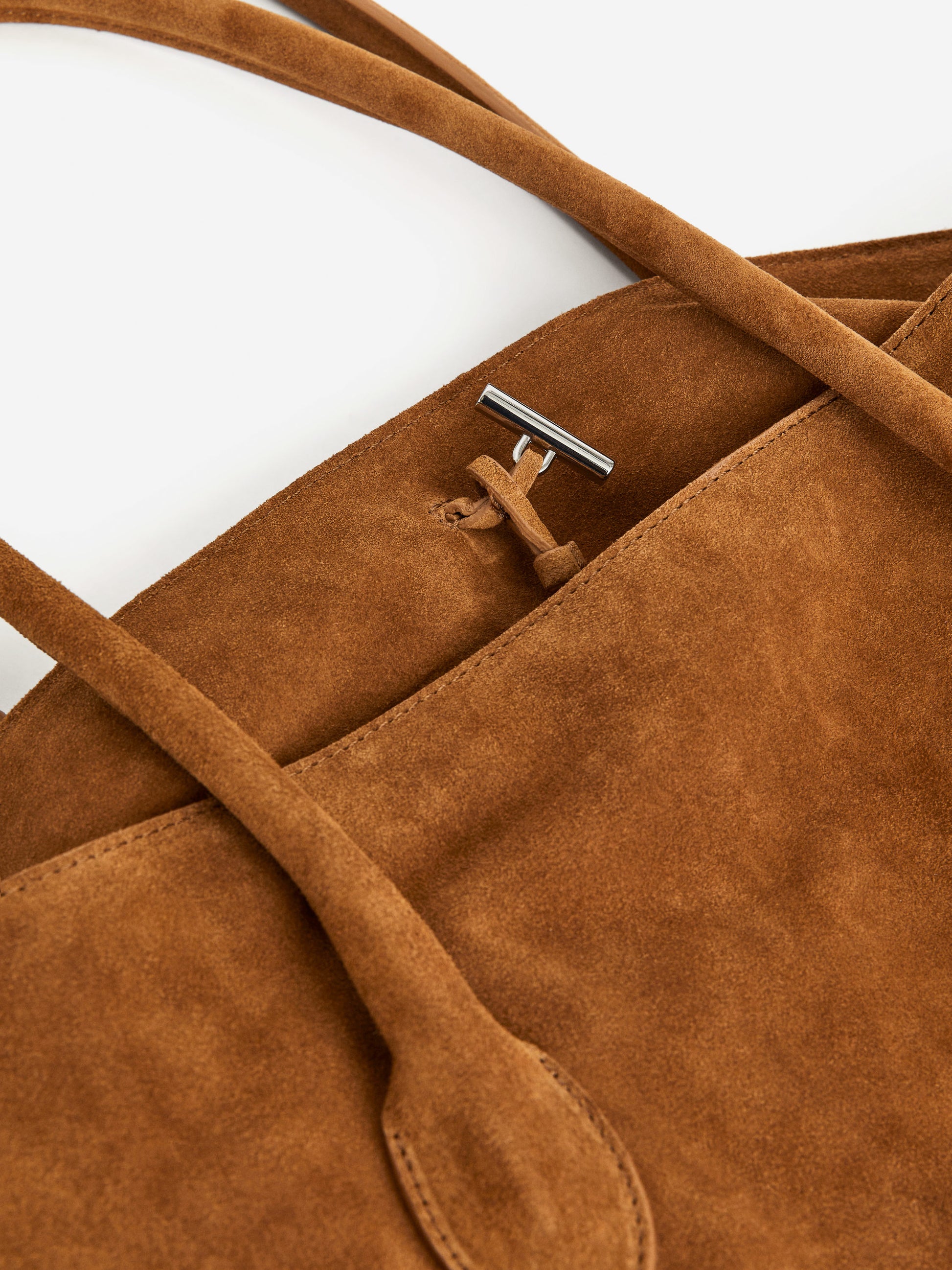 Landscape tote crafted from smooth leather tanned without the use of chrome. It features twin handles and an internal zip pocket for secure storage. Dimensions: height 26 cm, length 38 cm, depth 15 cm. Strap drop: 23 cm from the top of the bag.