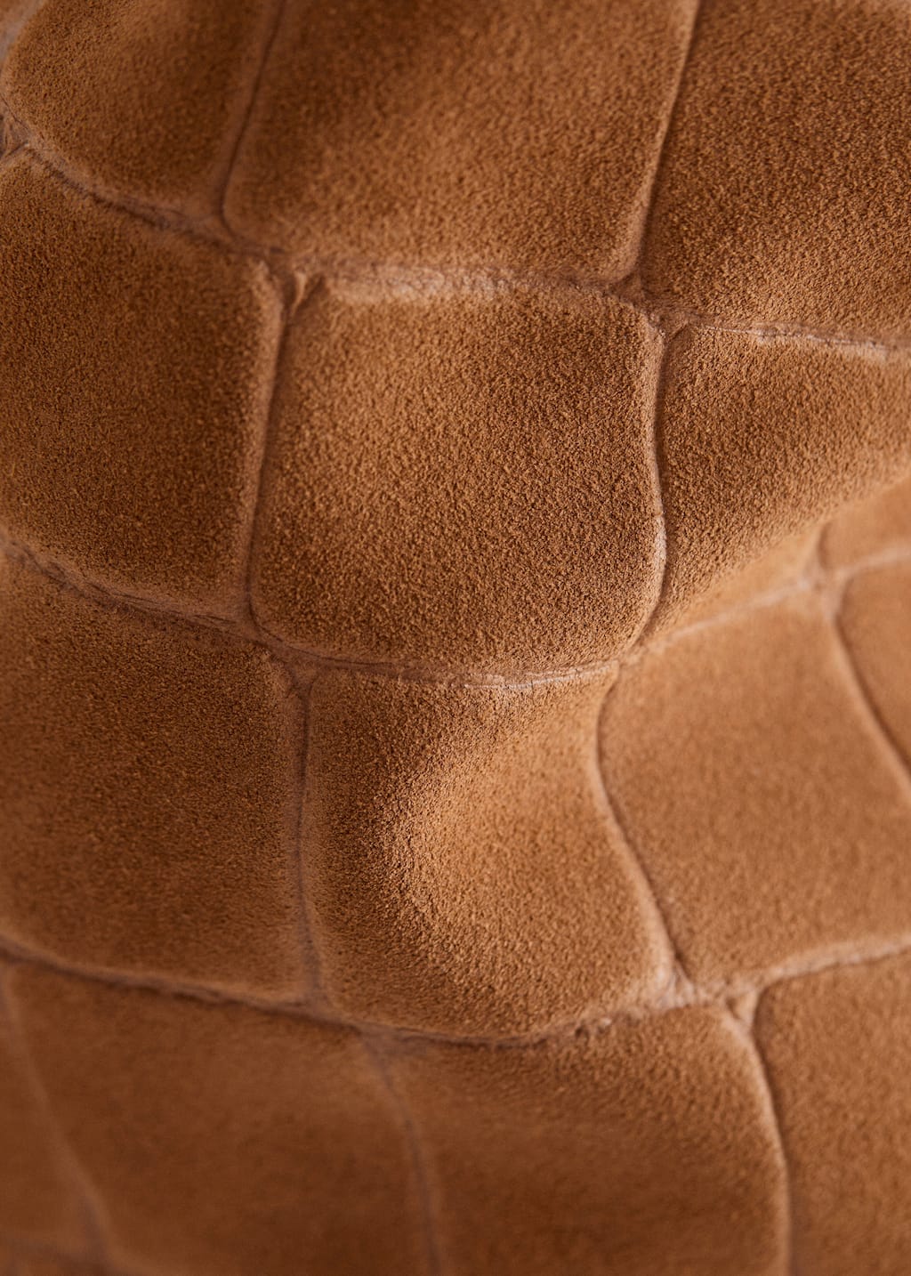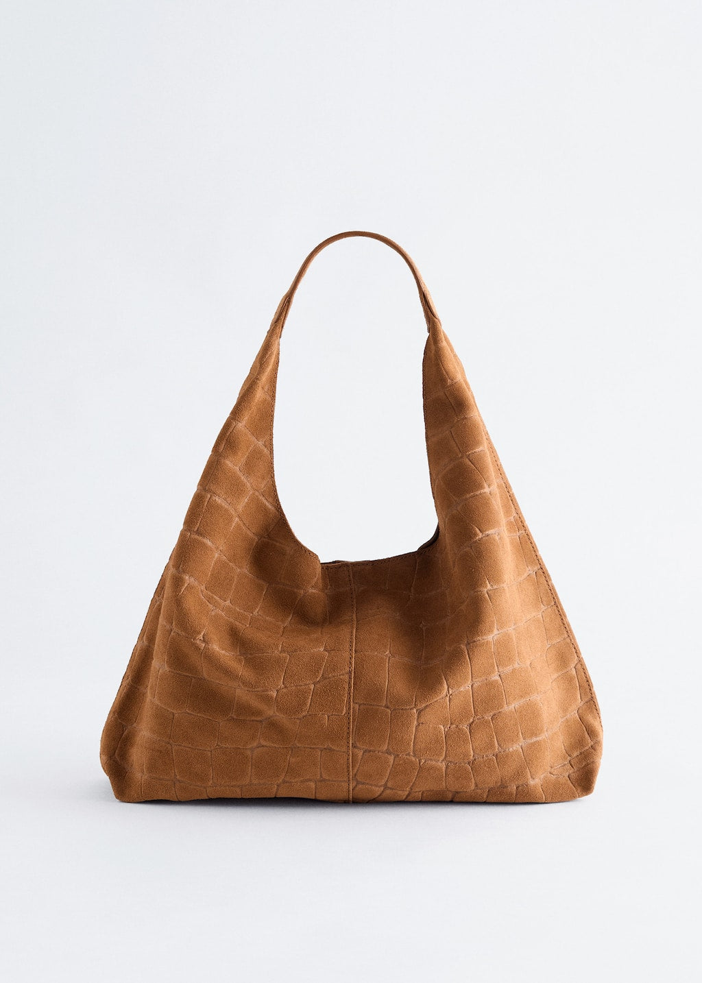 Small tote bag crafted from smooth suede with a matte finish, featuring a croco-embossed pattern. Its detailed with a magnetic closure and an inner pocket.