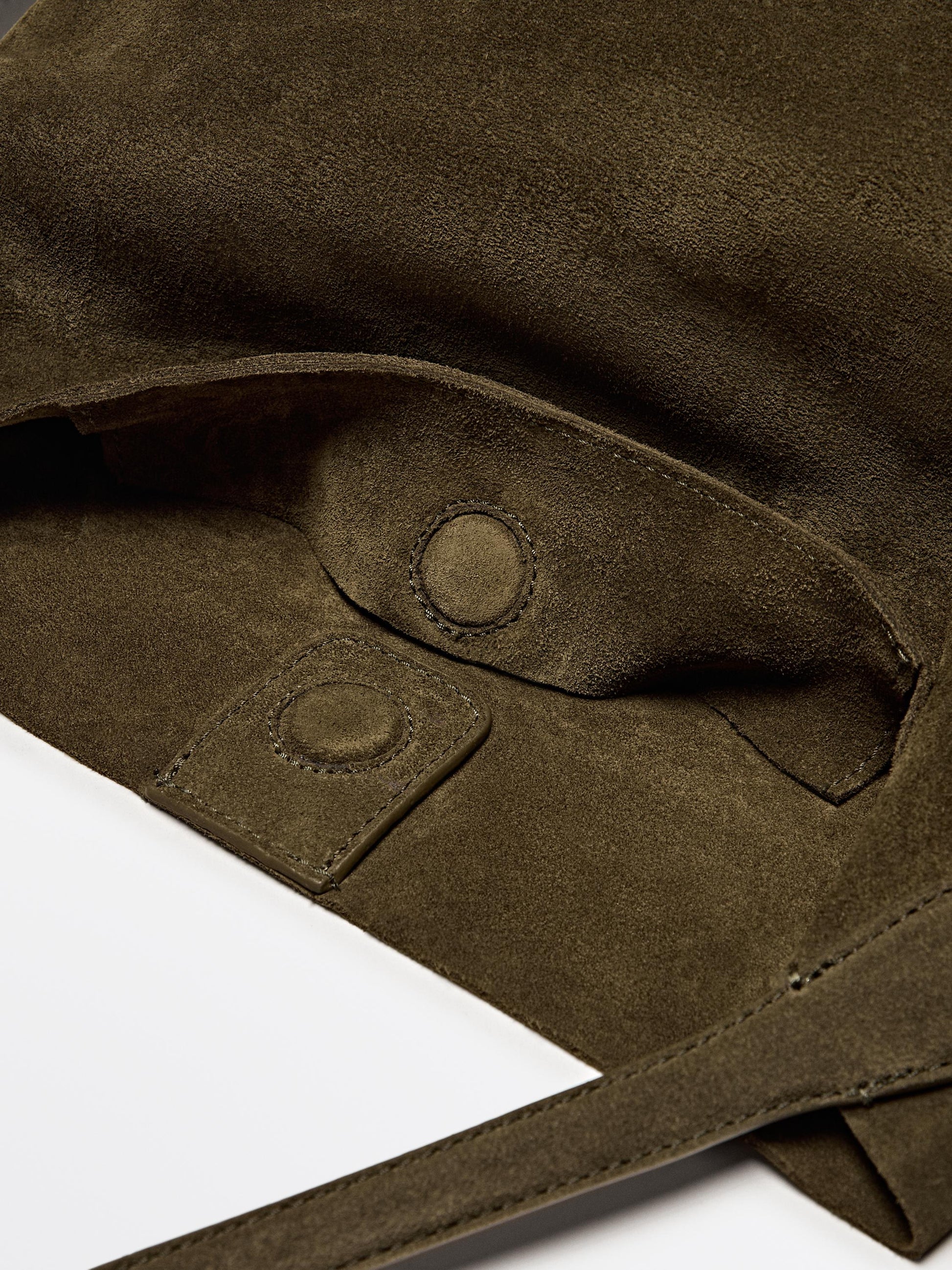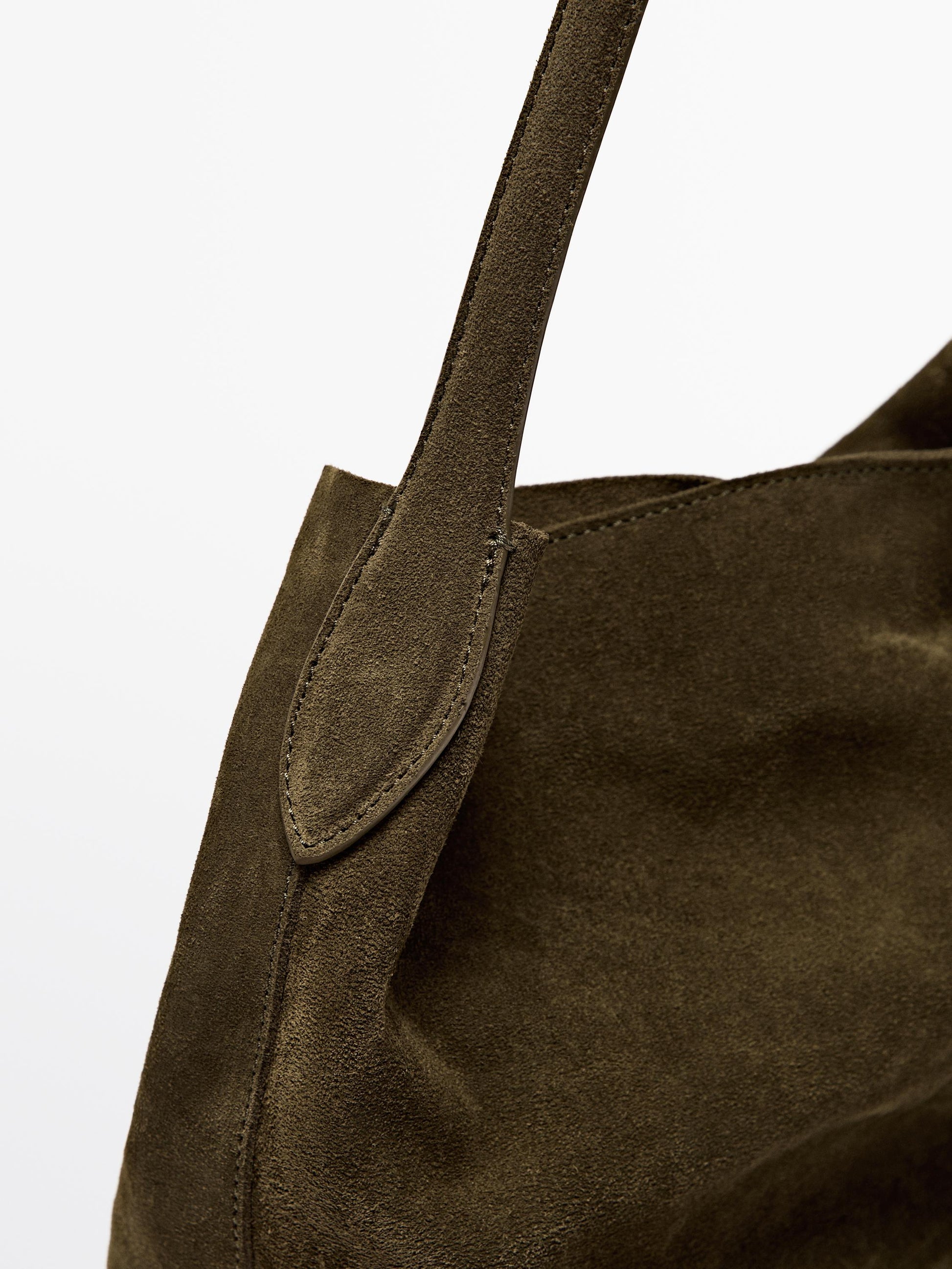 Bucket bag. Handbag made of cowhide with a split leather finish. Adjustable crossbody strap. Flap with concealed magnetic clasp fastening. An inside pocket. Main compartment.