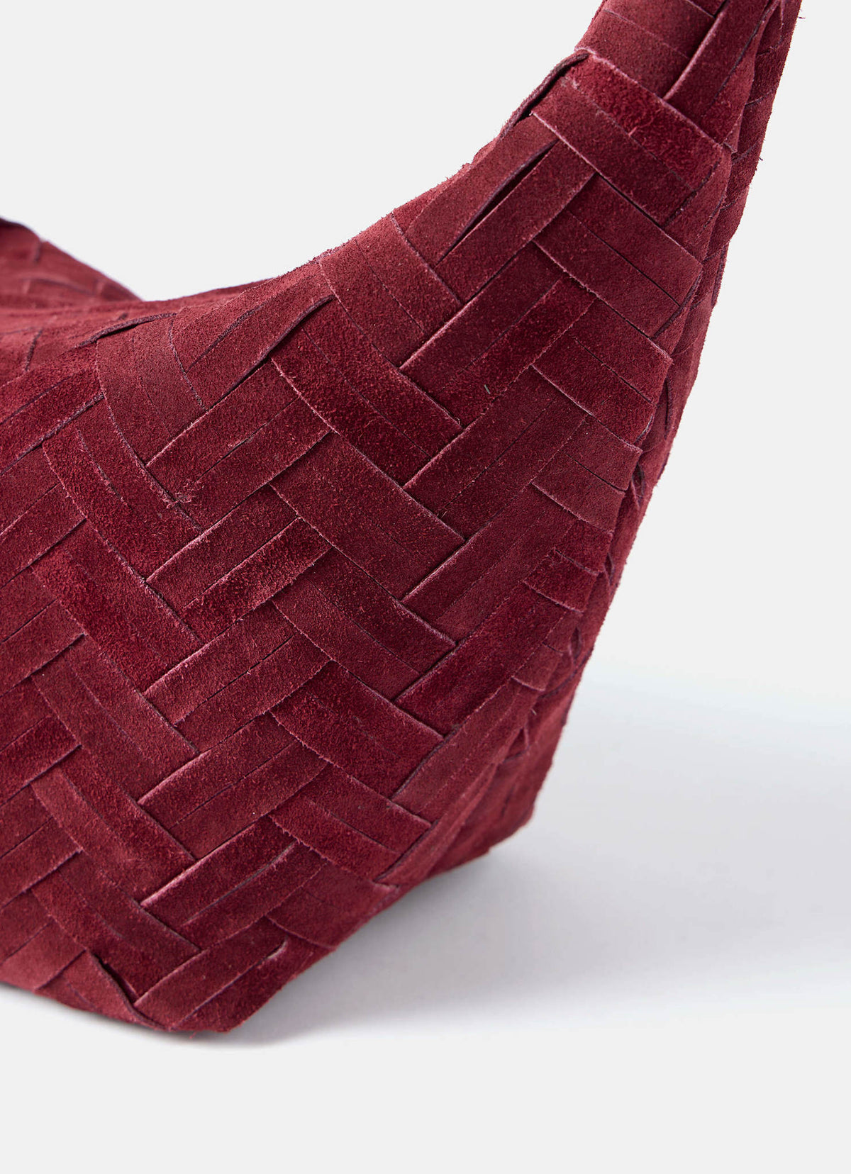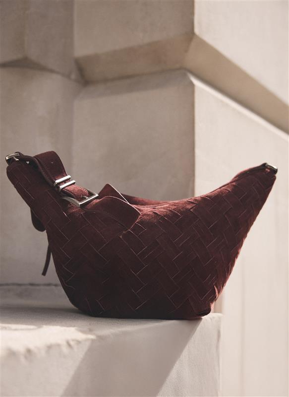 - Burgundy woven sling bag featuring an adjustable shoulder strap, internal zip pocket, silver-tone hardware with a zip fastening through the top.