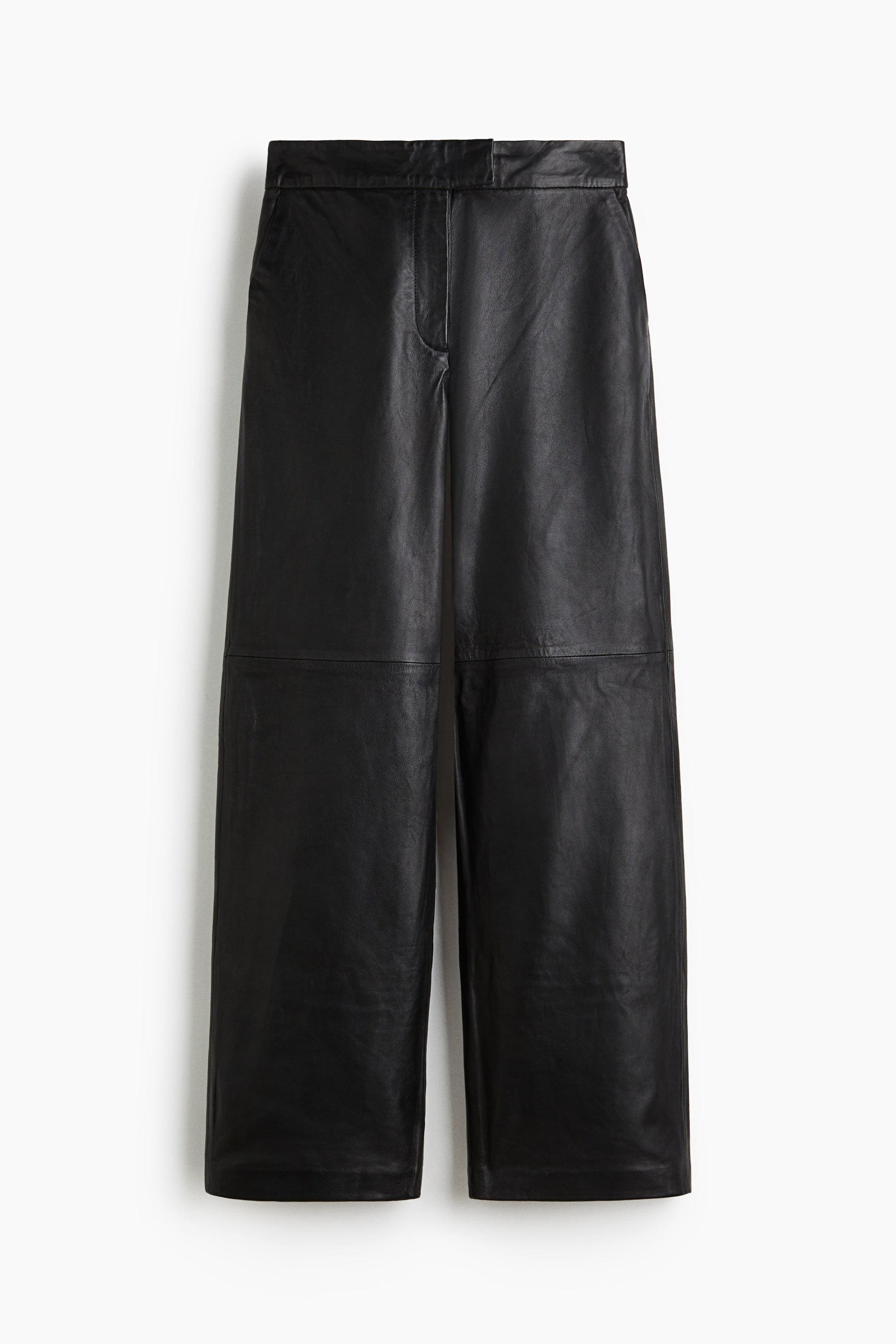 Trousers in soft leather featuring a regular waist with a zip fly and a concealed button and hook-and-bar fastener. Diagonal side pockets, a decorative back pocket and straight legs with a visible seam at the knees. Lined.