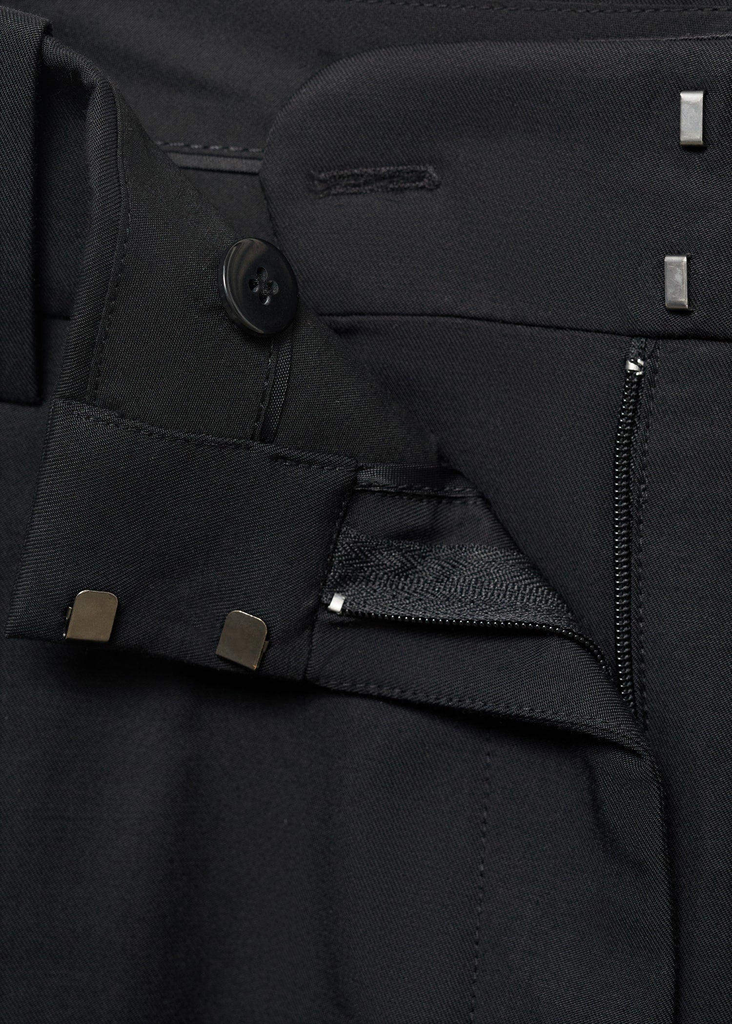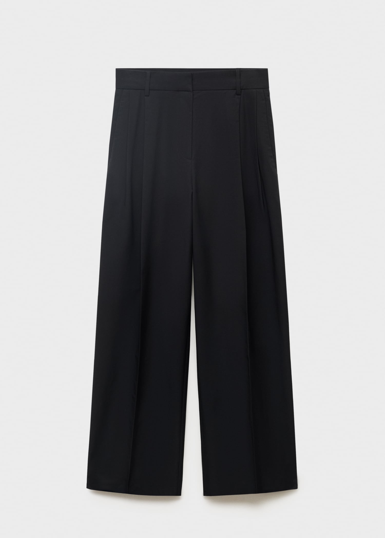 Cotton-blend fabric. Long design. Straight design. Medium waist. Belt loops. Two side pockets. Concealed button, hook and zip fastening. Total look.