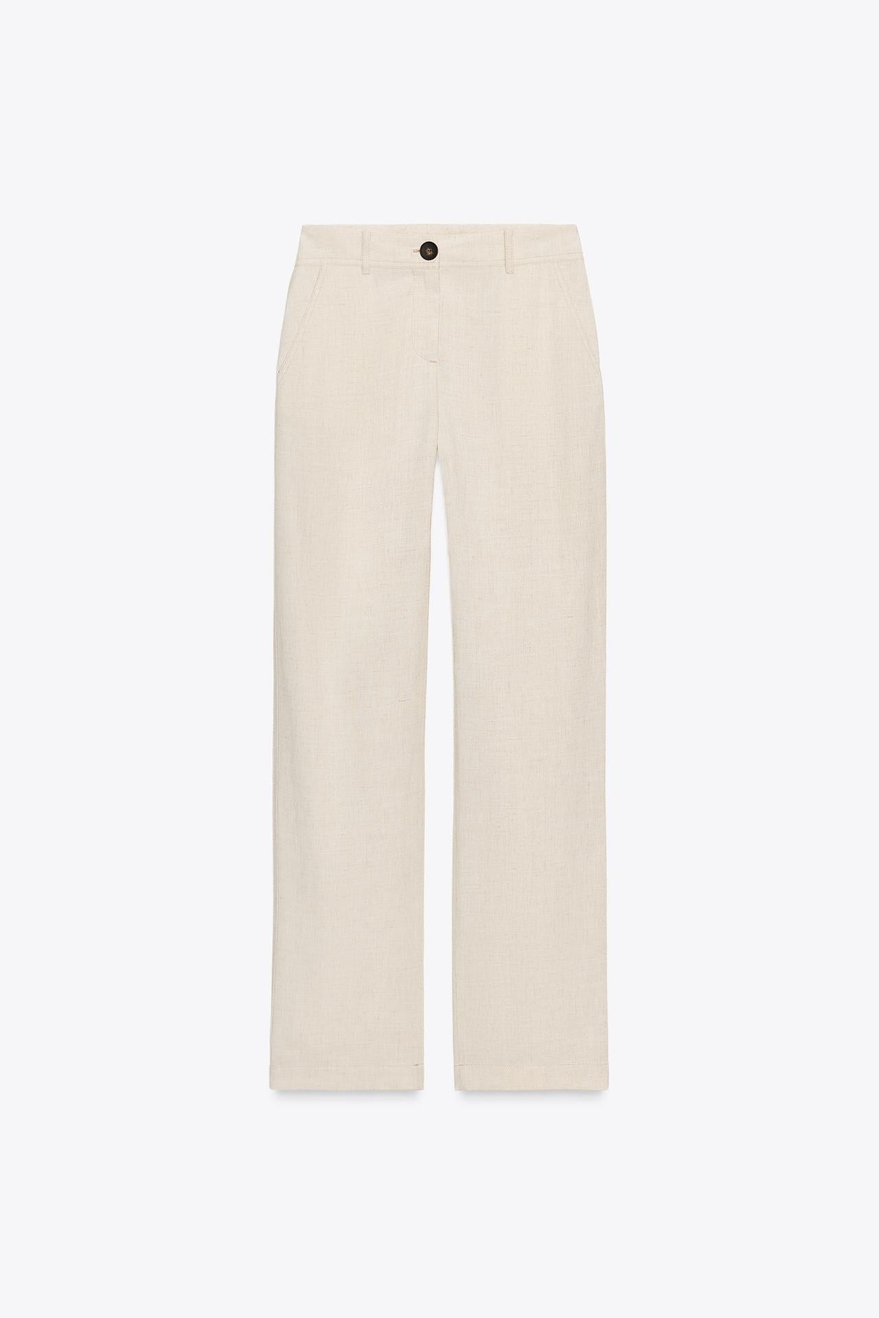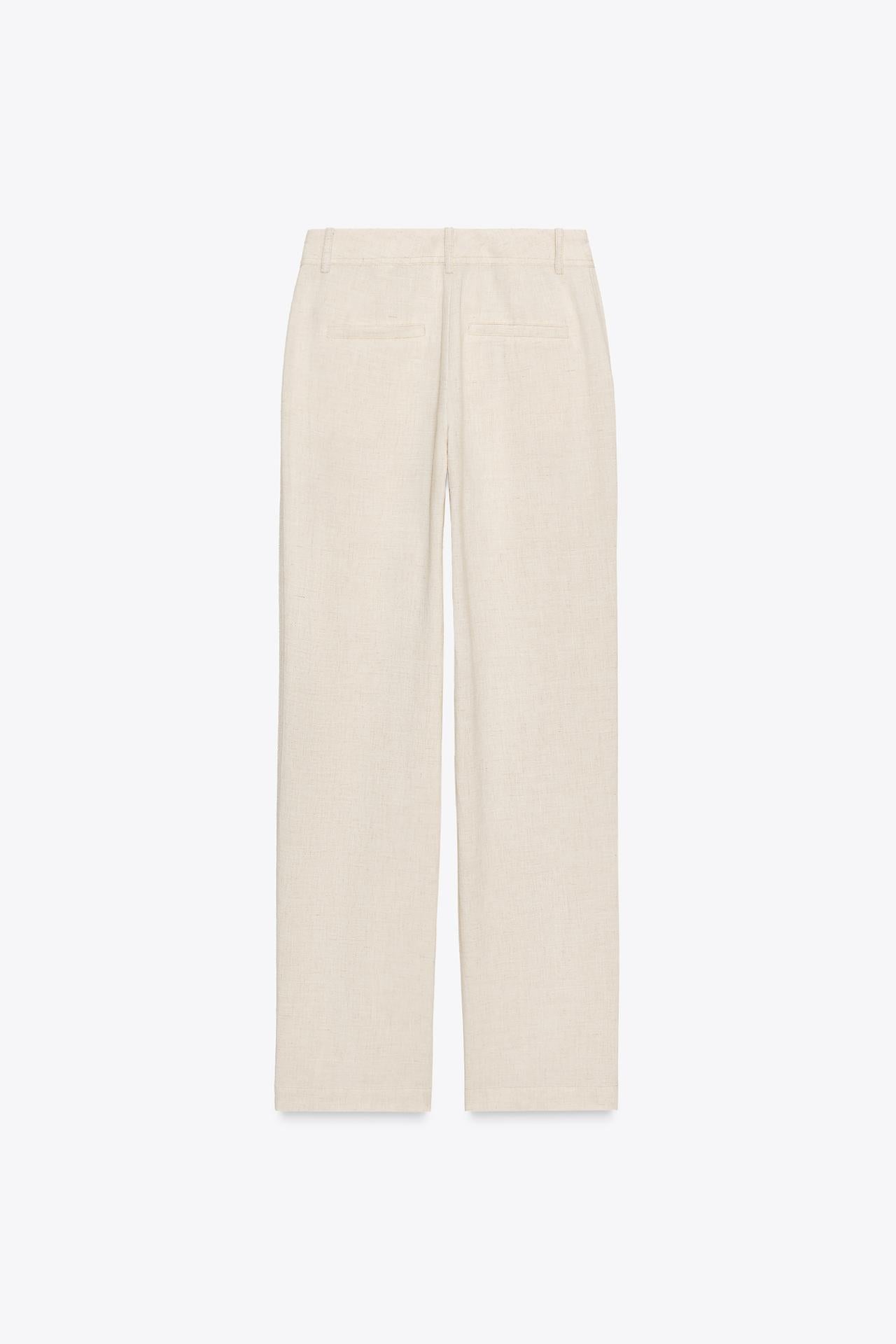 Trousers made with a linen blend. High waist with front pockets and mock welt pockets at the back. Straight leg. Front zip and button fastening.