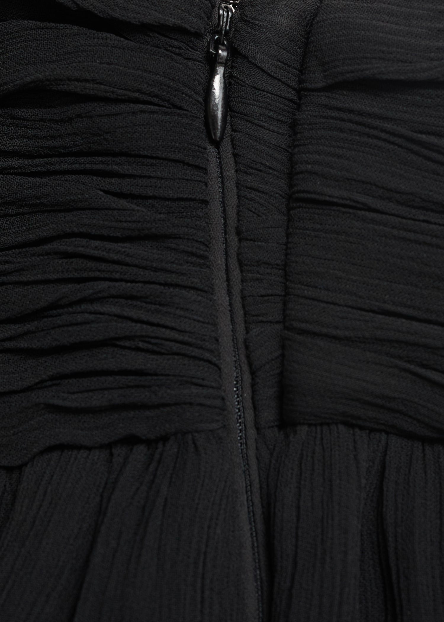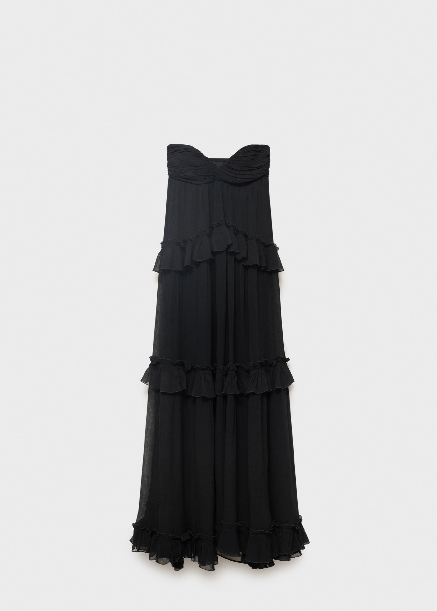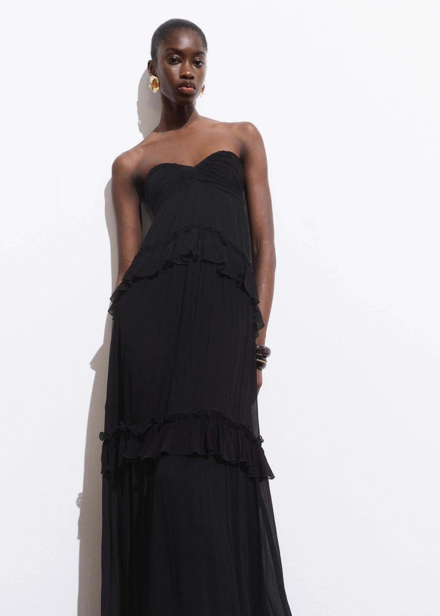 Maxi long design. A-line design. Strapless. Sleeveless. Ruffle details. Side zip closure. Inner lining.
