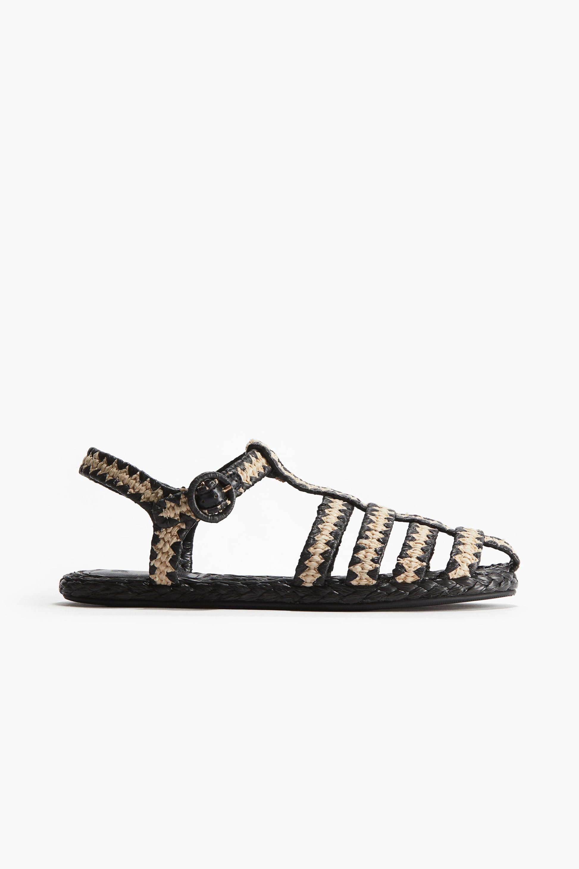 Fisherman sandals in braided plastic straw with a closed-toe design, rounded toes and an adjustable ankle strap with a round buckle.
