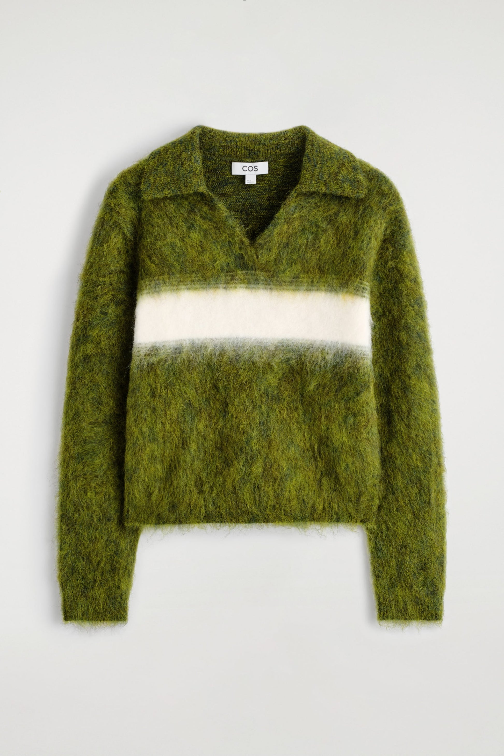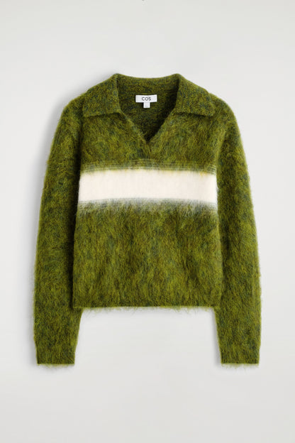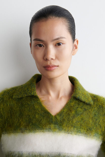Dynamic textures renew classic knitwear with a modern appeal for Autumn Winter 2025. Rendered in a rich olive hue, this polo jumper is knitted with tactile mohair and merino wool and features a contrasting stripe that nods to sportswear codes. It's finished with an effortless open collar.