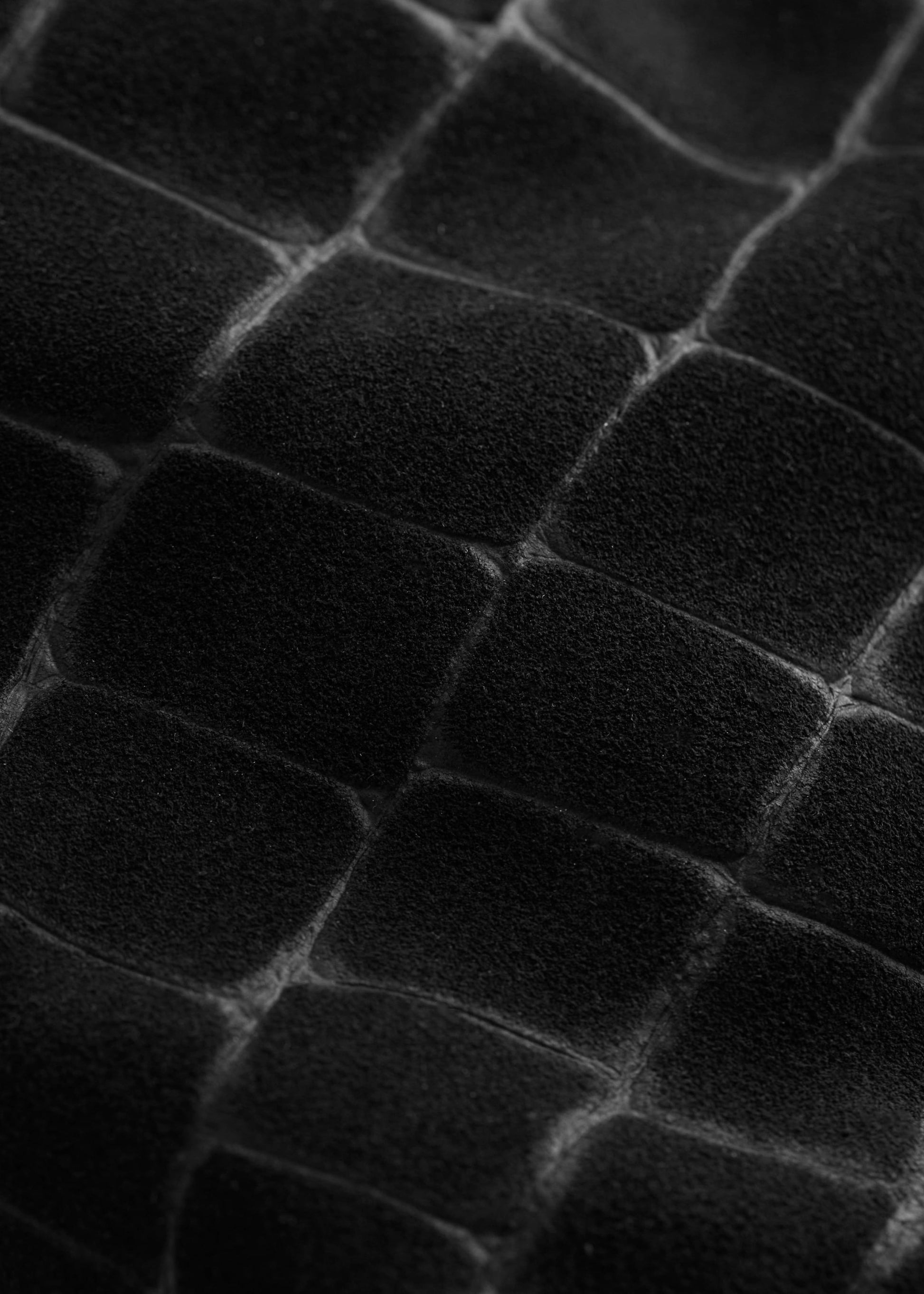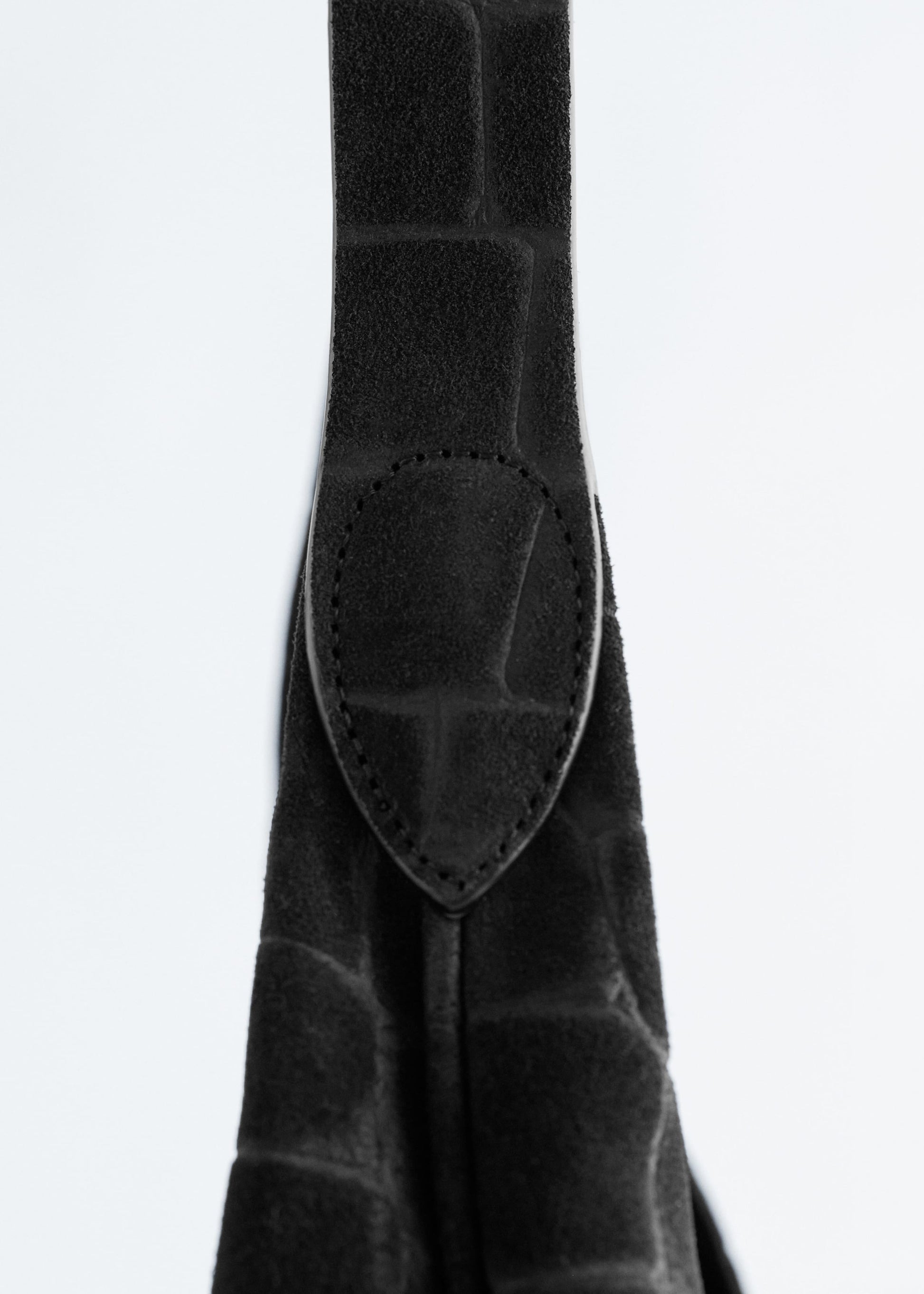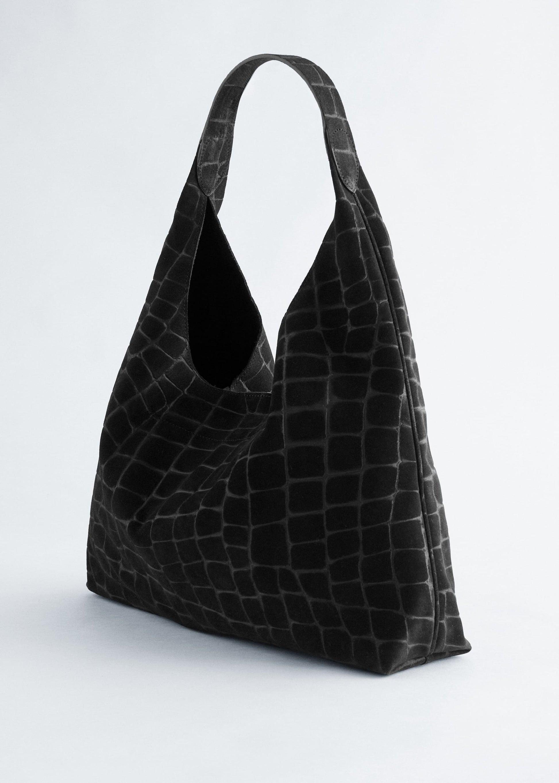This tote bag is crafted from smooth suede with a matte finish, featuring a croco-embossed pattern. The spacious interior will carry all your essentials. Finished with a magnetic closure and an inner pocket.