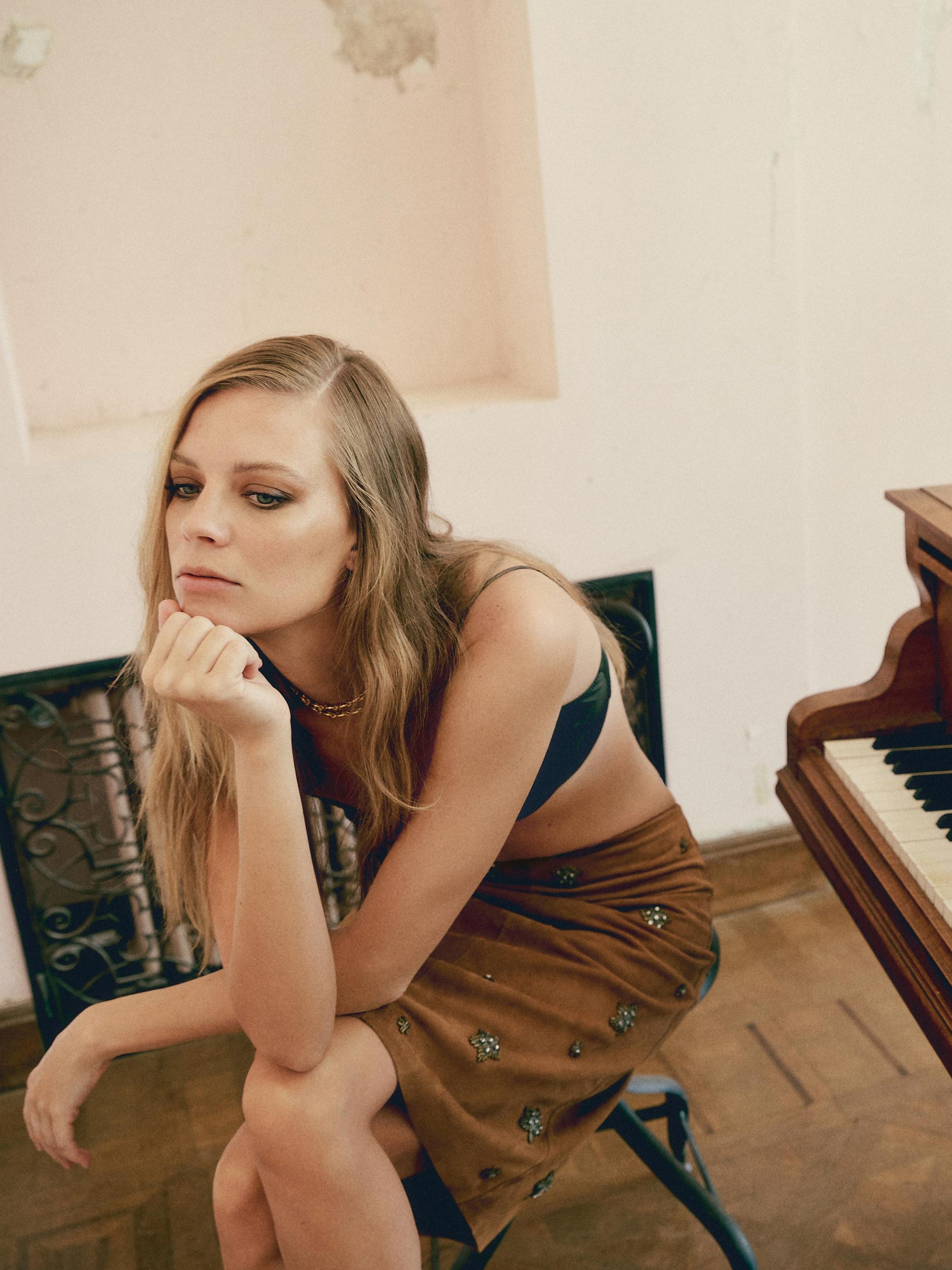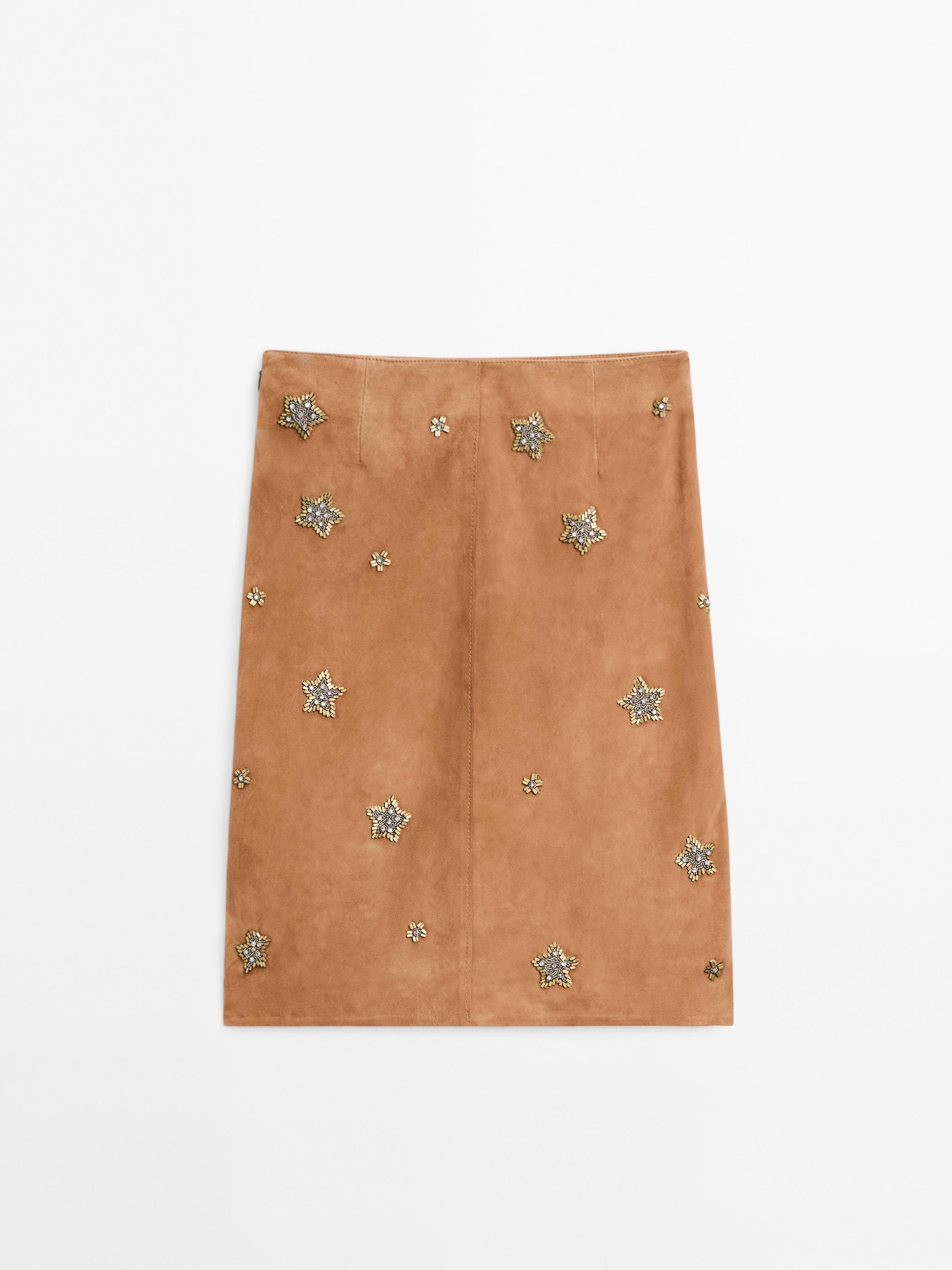 Skirt made of goatskin with suede finish. Fabric detail with rhinestones . Side zip fastening. Lined.