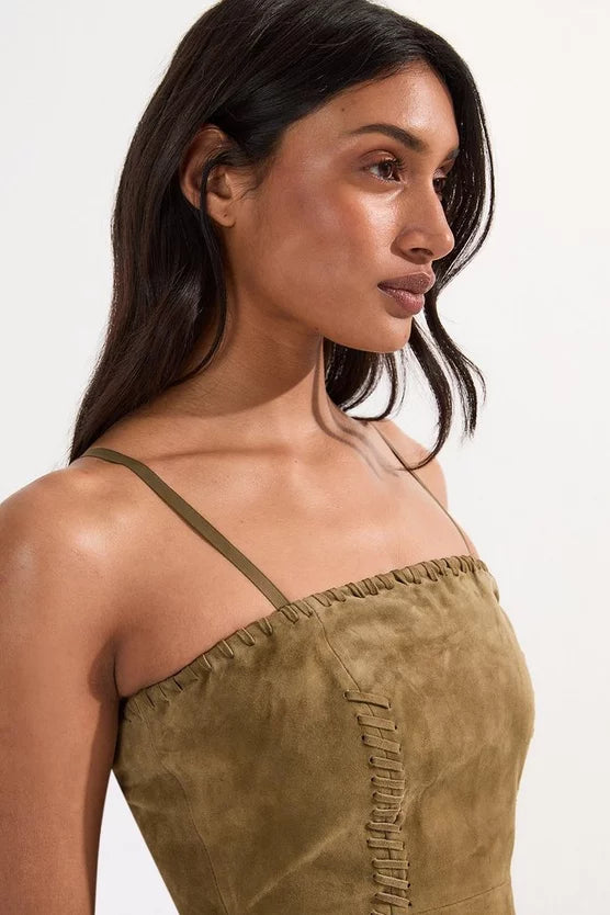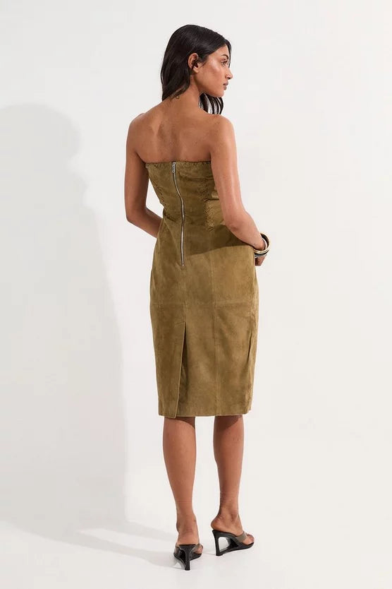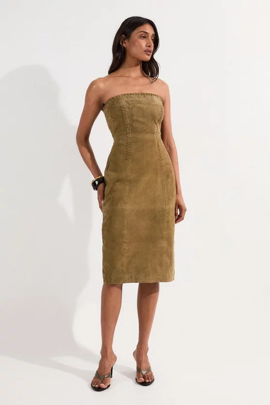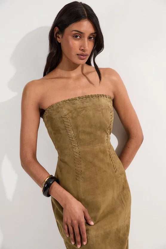 - Luxurious suede bandeau midi dress with distinctive whipstitch detailing along the neckline