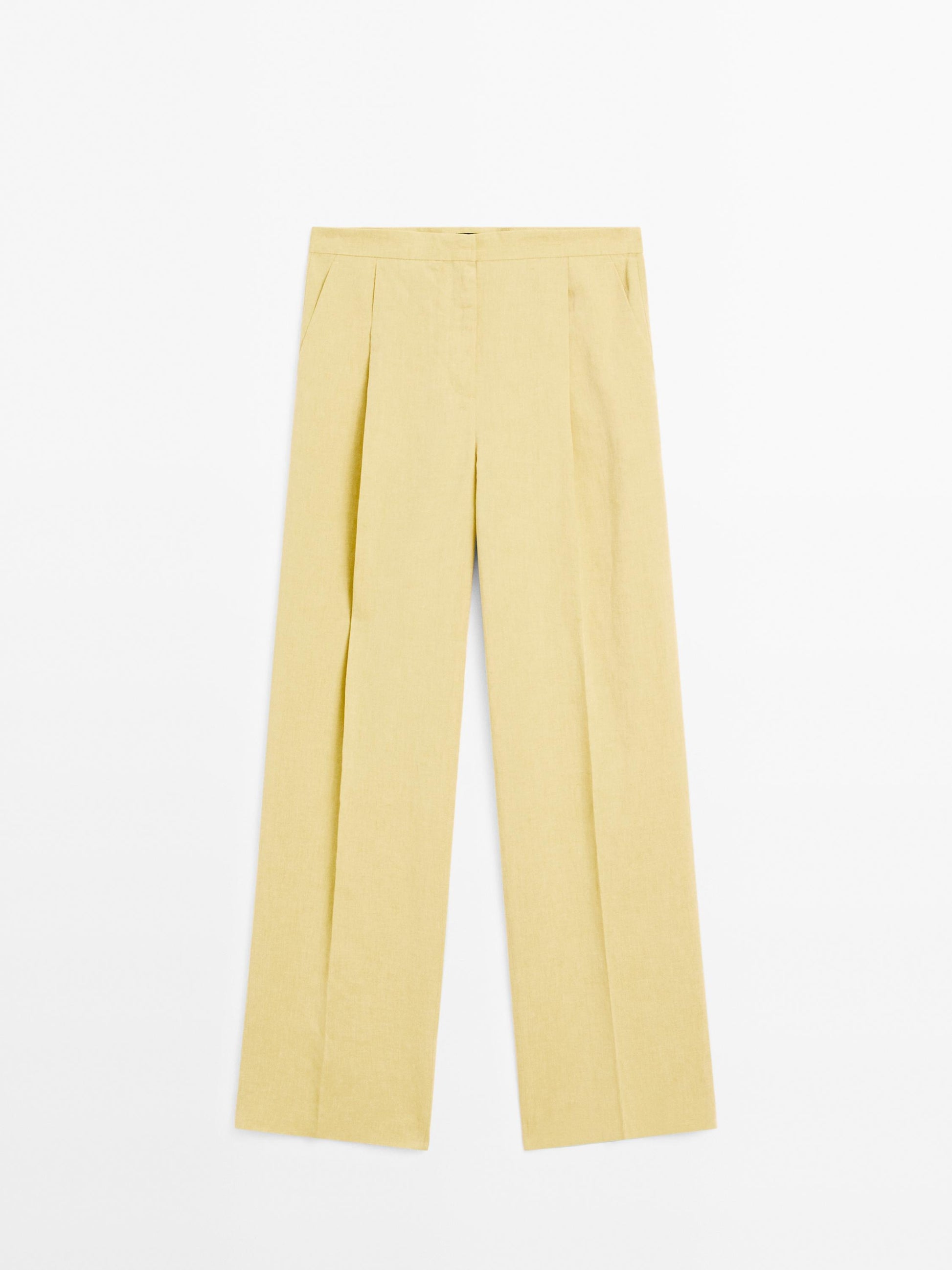 Trousers with pleats. Zip fastening concealed by a placket, with hook-and-eye clasp and button. Two side pockets. One welt pocket at the back. This garment is part of a suit.