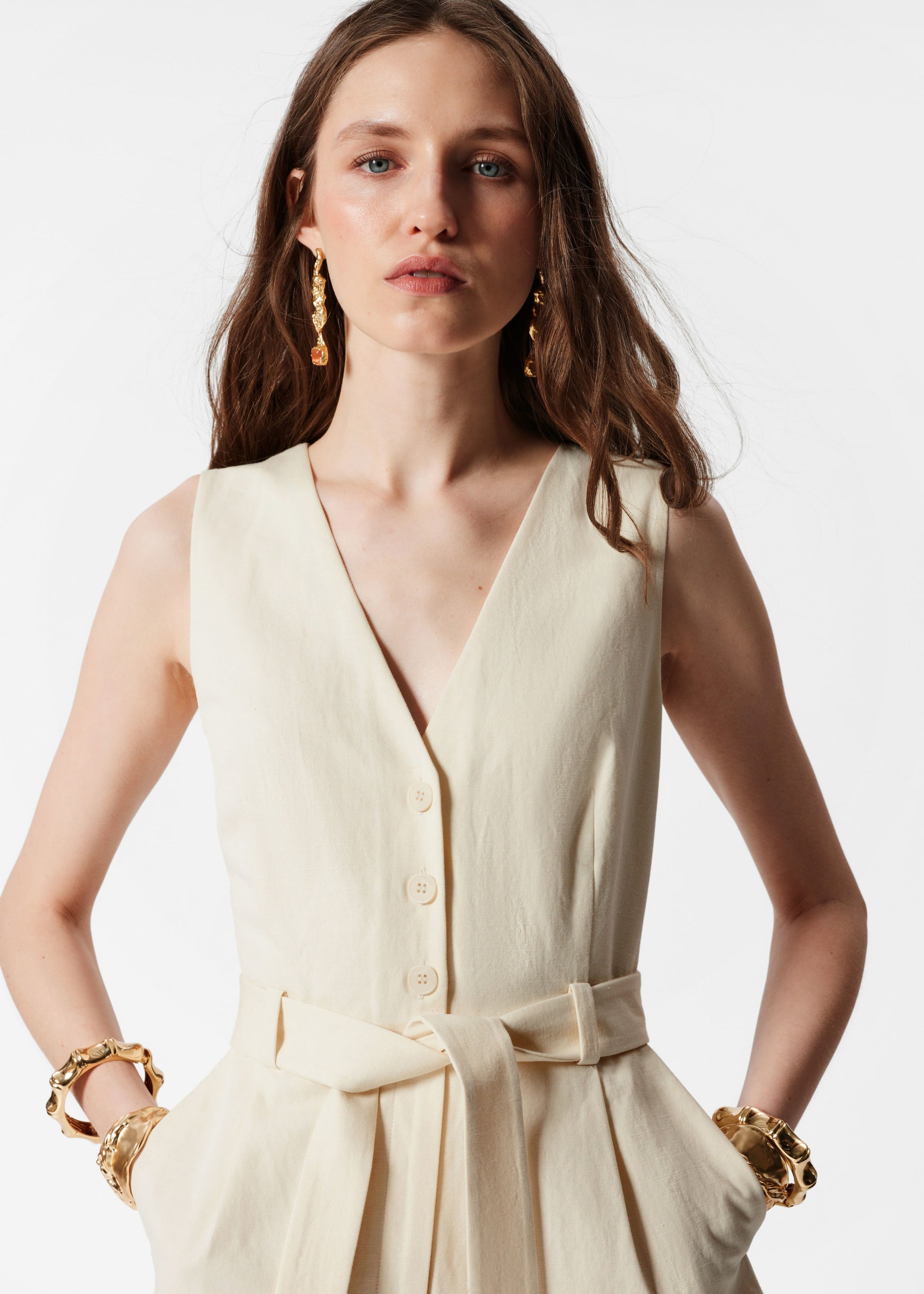 Designed for the warmer city months, this sleeveless playsuit is crafted from 100% pure cotton, offering a lightweight and breathable feel. Cut in a tailored suit-inspired silhouette, it features a classic v-neckline and a tonal fabric belt at the waist. Completed with buttons down the front, a concealed zipper, and dual welt pockets at the back.