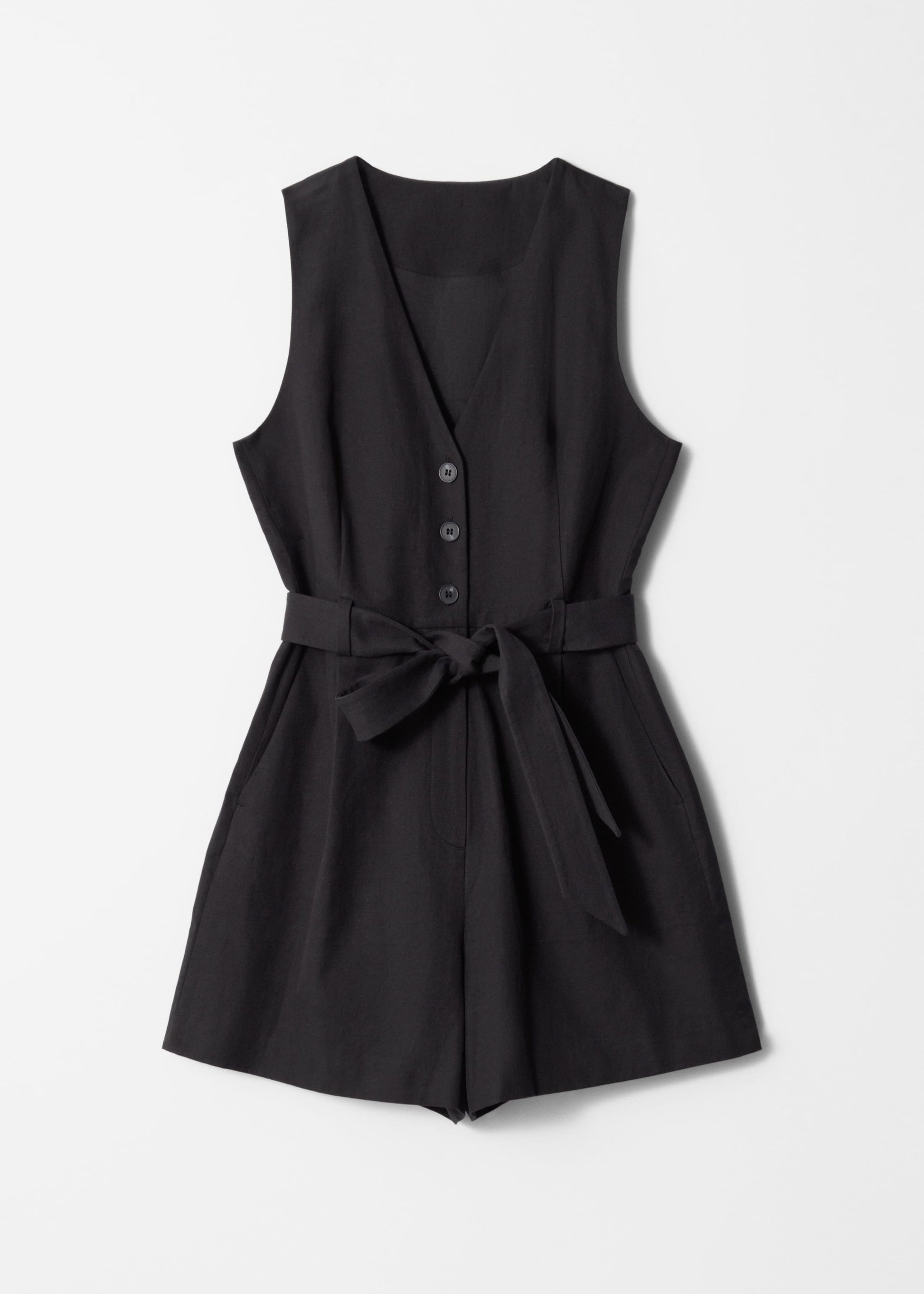 Designed for the warmer city months, this sleeveless playsuit is crafted from 100% pure cotton, offering a lightweight and breathable feel. Cut in a tailored suit-inspired silhouette, it features a classic v-neckline and a tonal fabric belt at the waist. Completed with buttons down the front, a concealed zipper, and dual welt pockets at the back.